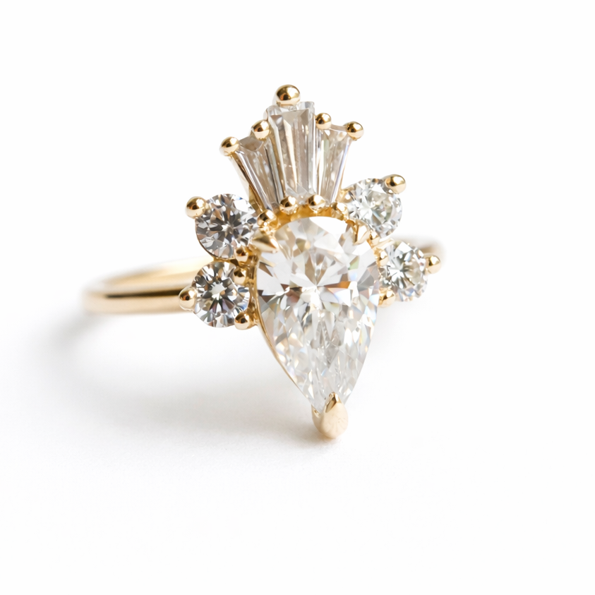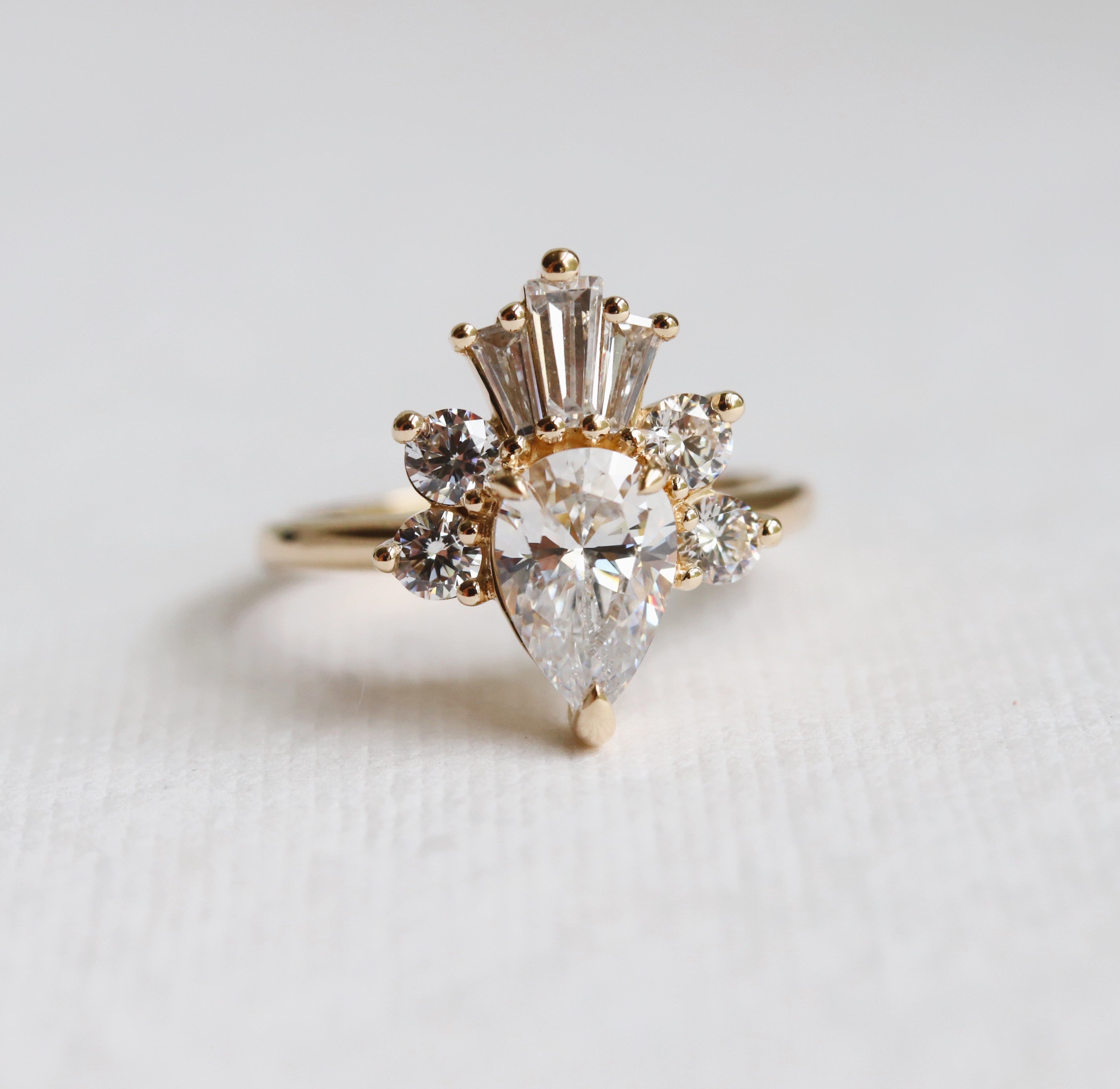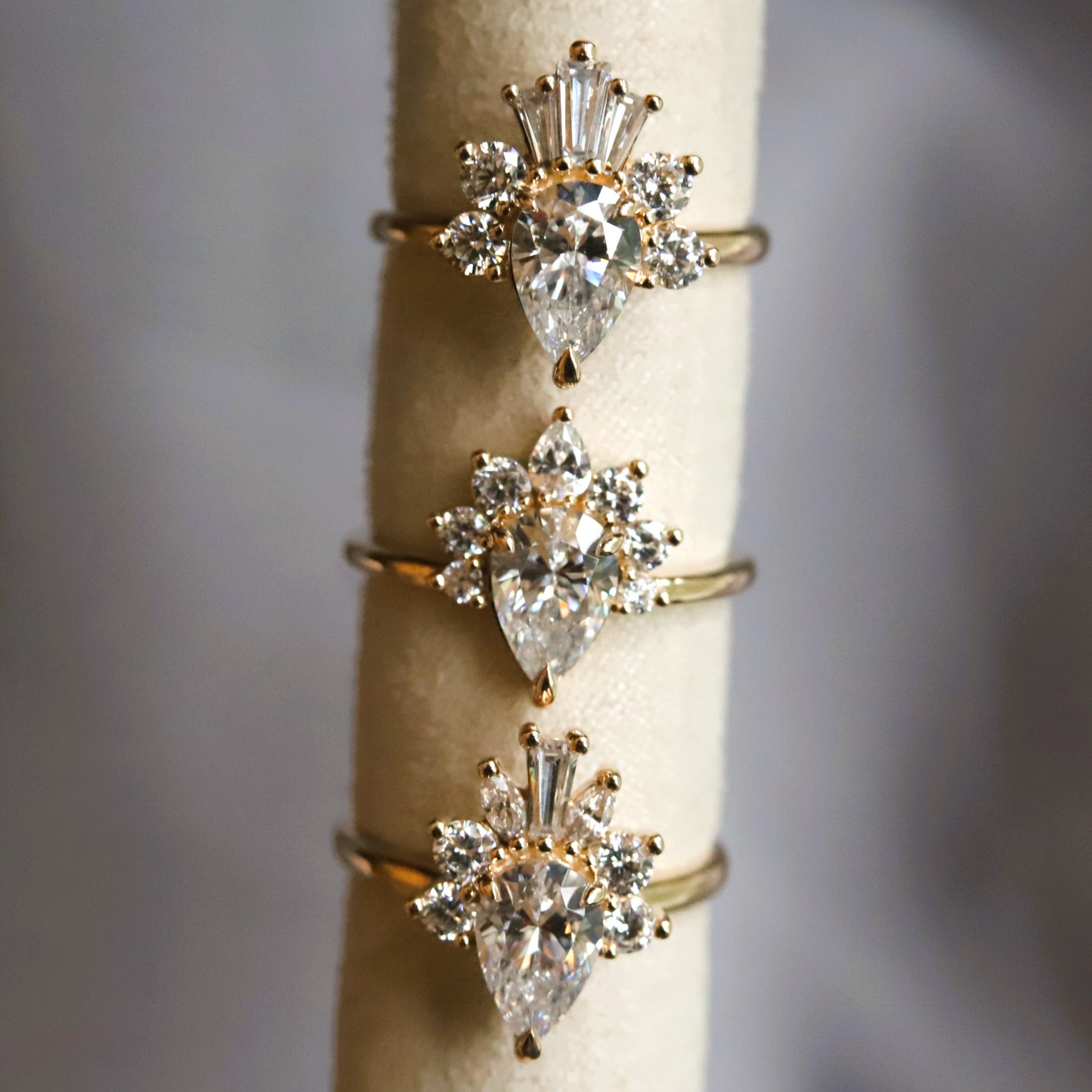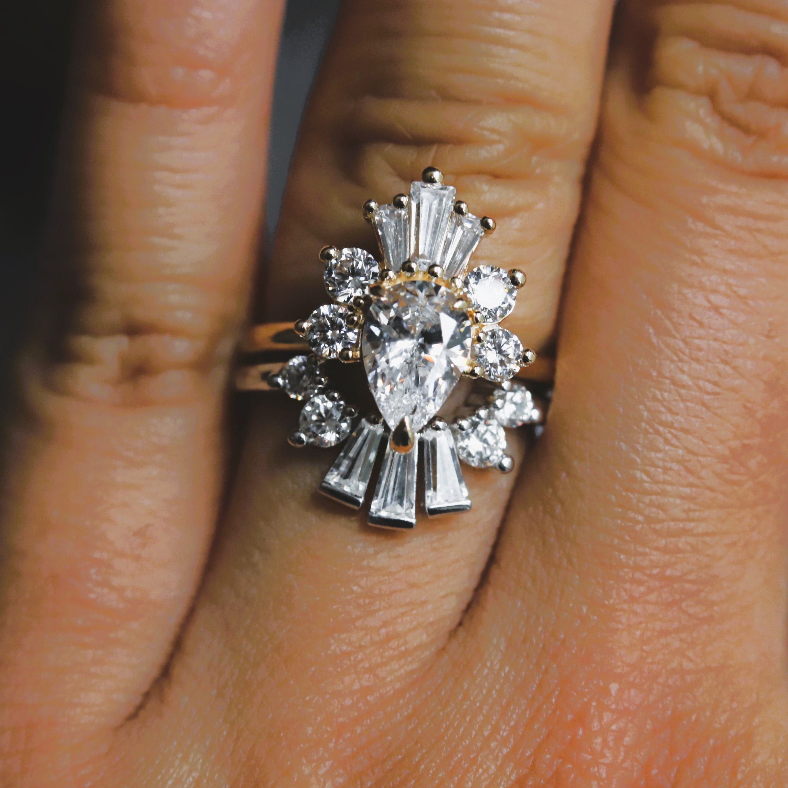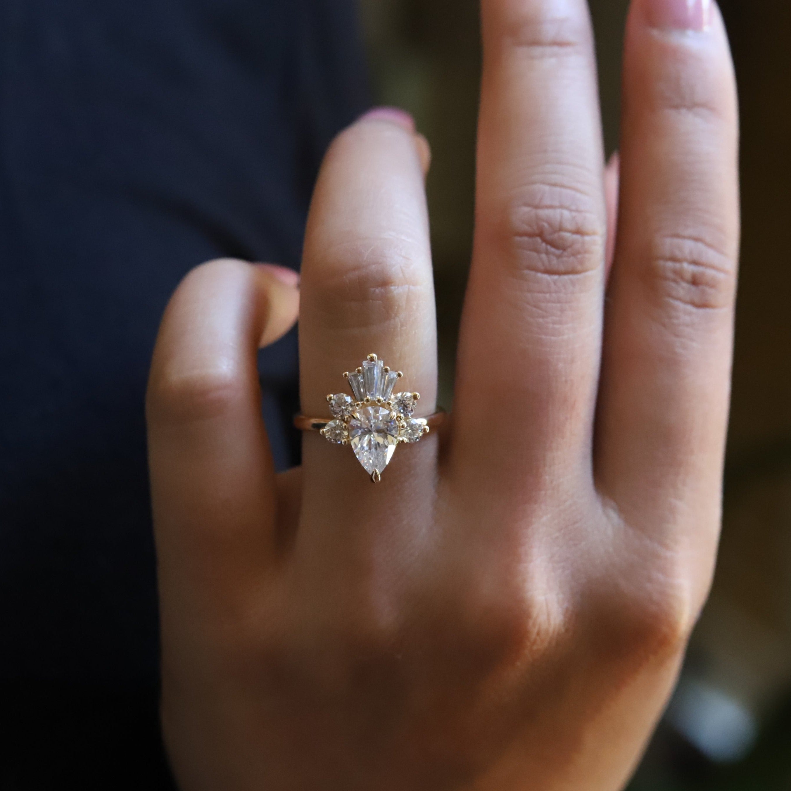The Decora Pear Accented Ring is a true statement of elegance and sophistication, expertly crafted in a vintage-inspired design. She is boasting a stunning 1 ct. pear-shaped center stone, accented by tapered baguettes and round diamonds. The raised cathedral design allows for seamless stacking with a straight wedding band, making it an ideal choice for an engagement ring. This engagement ring is sure to capture everyone's attention. Upgrade your proposal with a touch of timeless beauty.