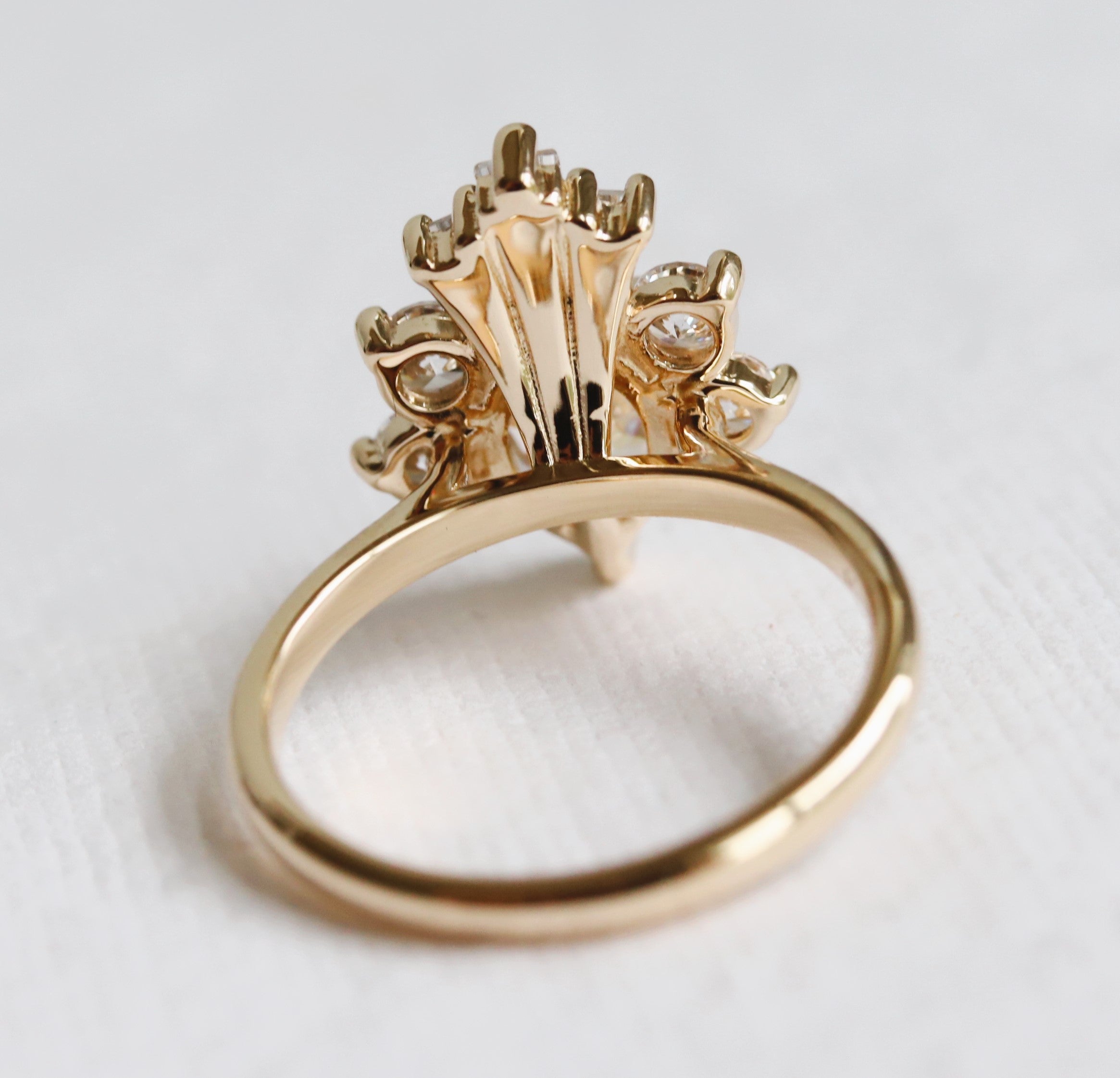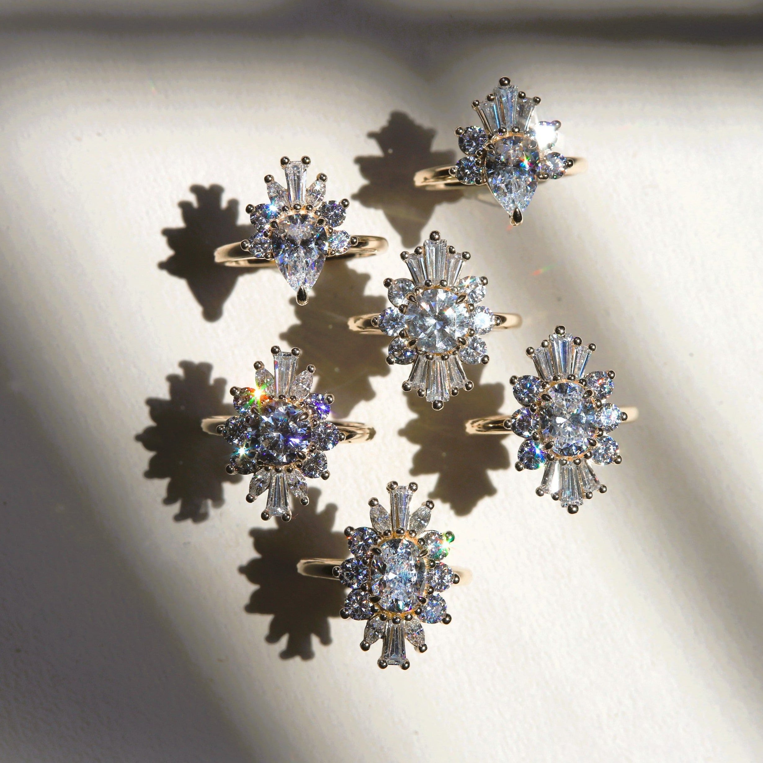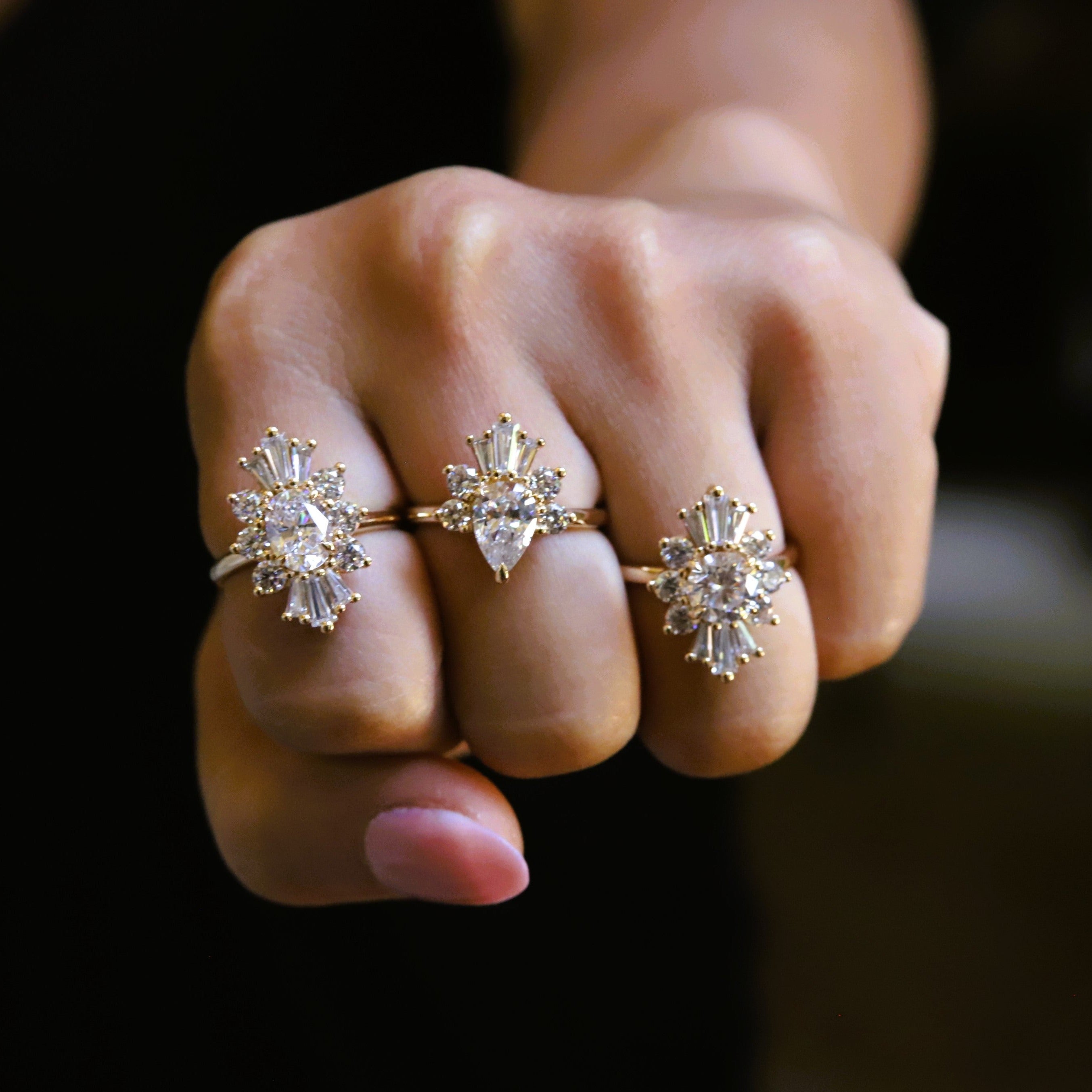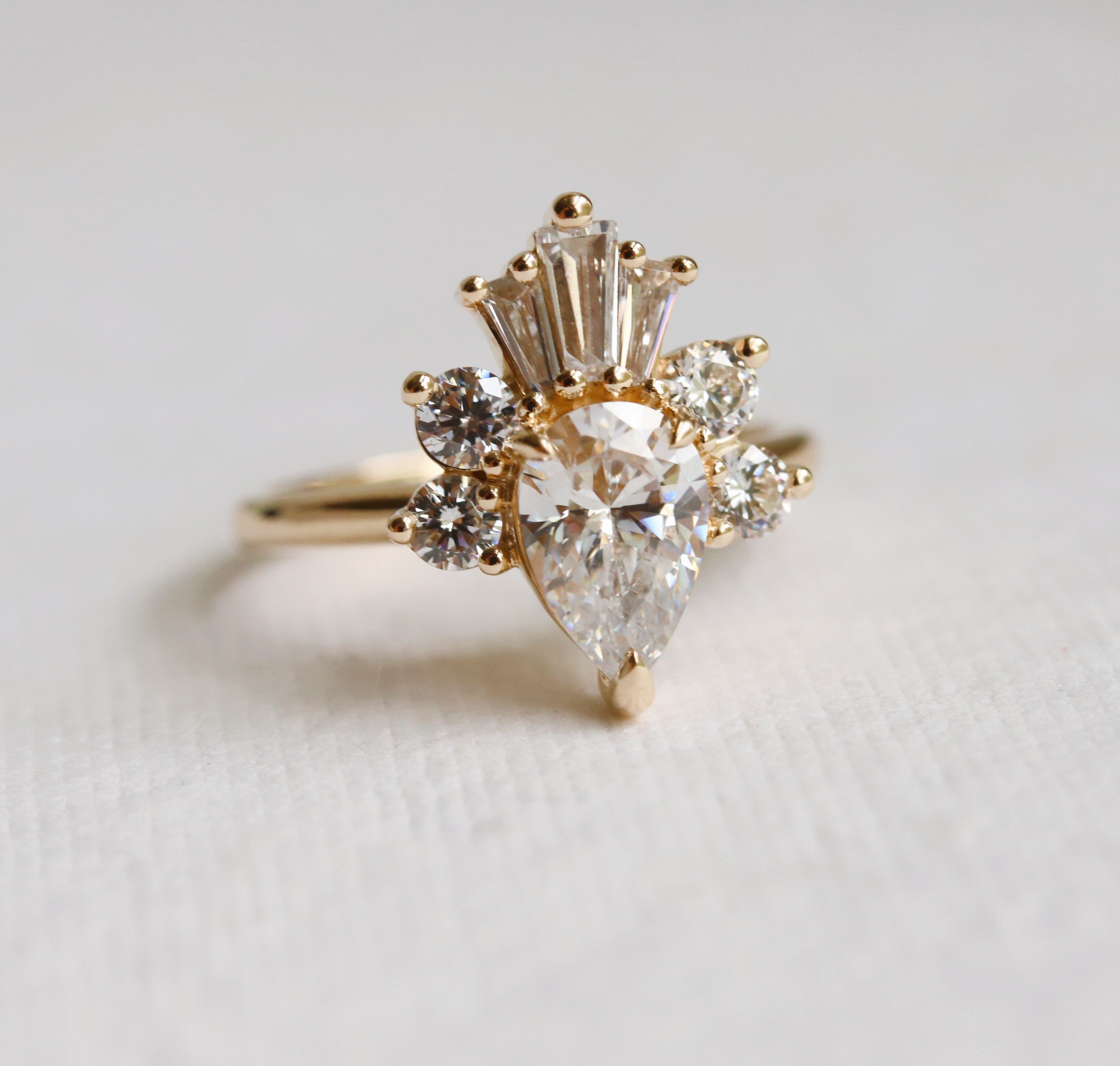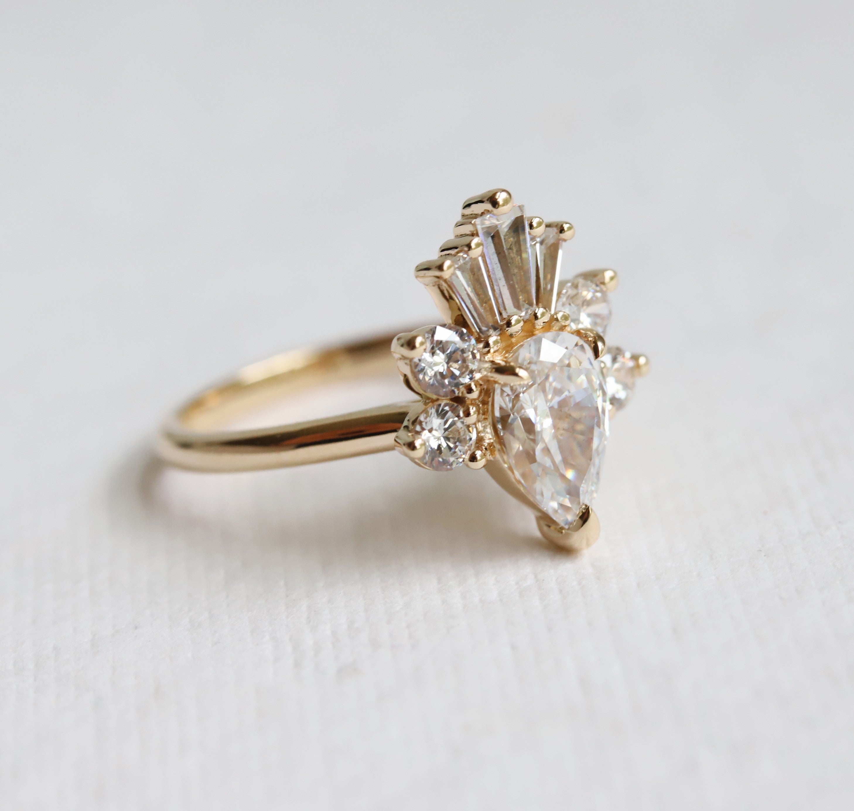 The Decora Pear Accented Ring is a true statement of elegance and sophistication, expertly crafted in a vintage-inspired design. She is boasting a stunning 1 ct. pear-shaped center stone, accented by tapered baguettes and round diamonds. The raised cathedral design allows for seamless stacking with a straight wedding band, making it an ideal choice for an engagement ring. This engagement ring is sure to capture everyone's attention. Upgrade your proposal with a touch of timeless beauty.