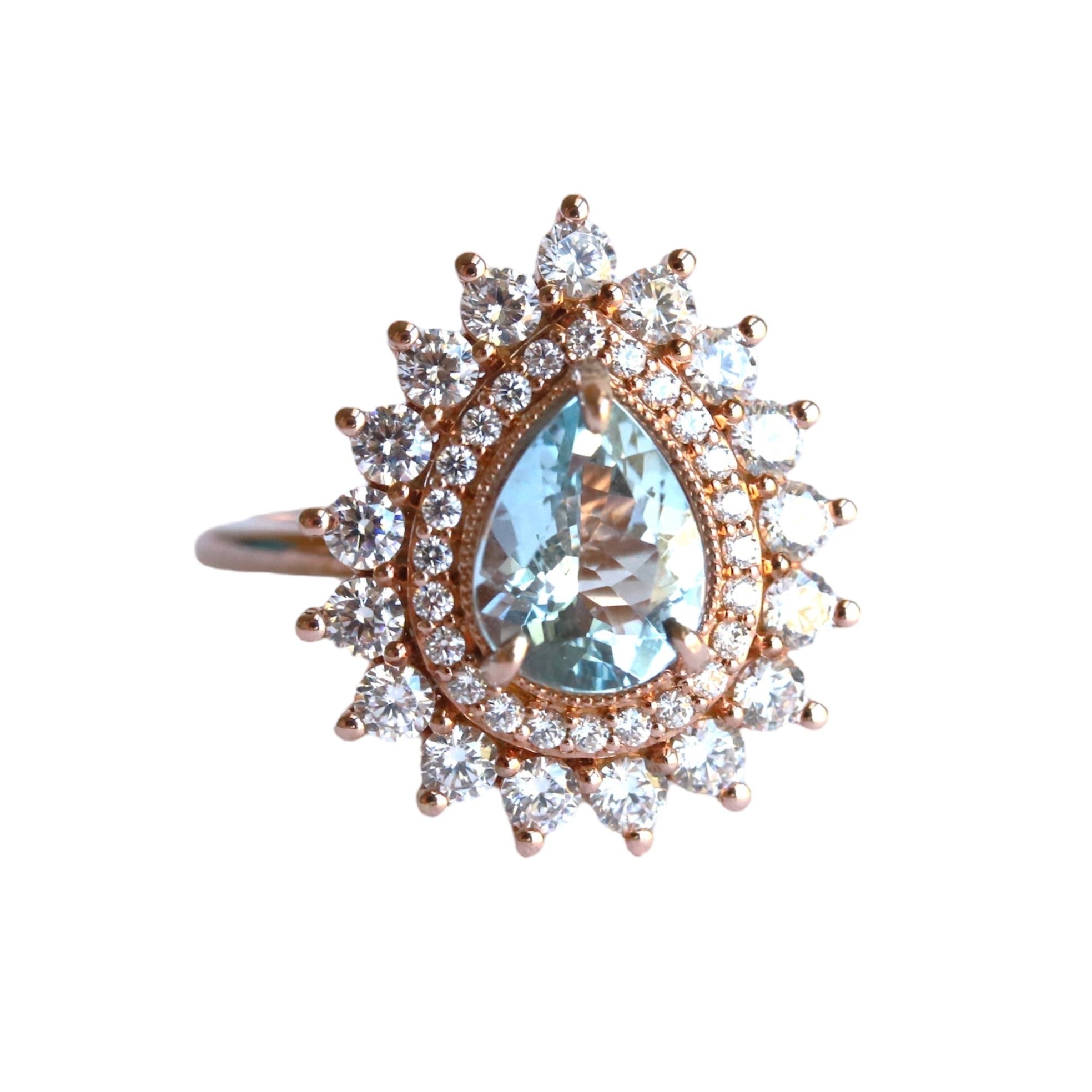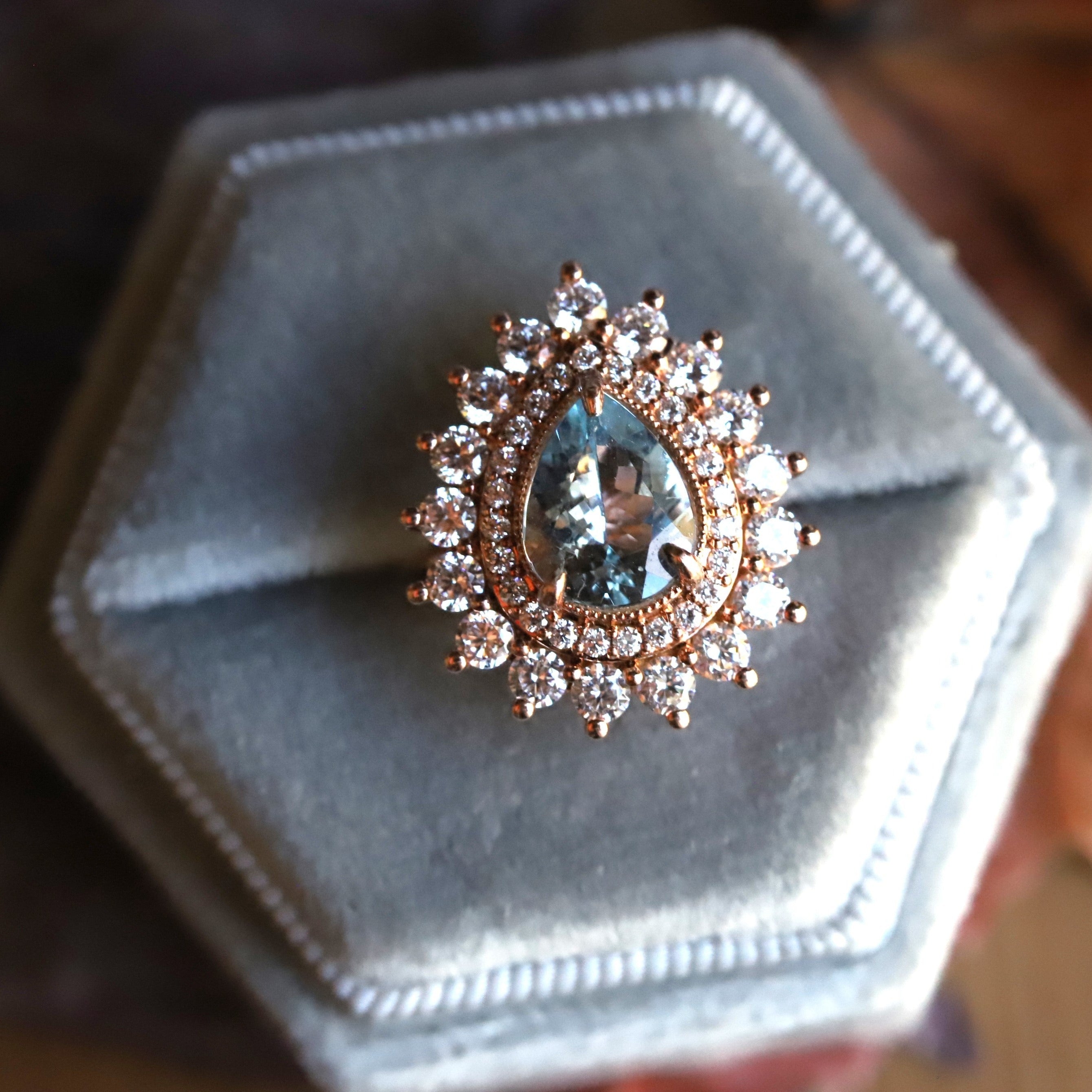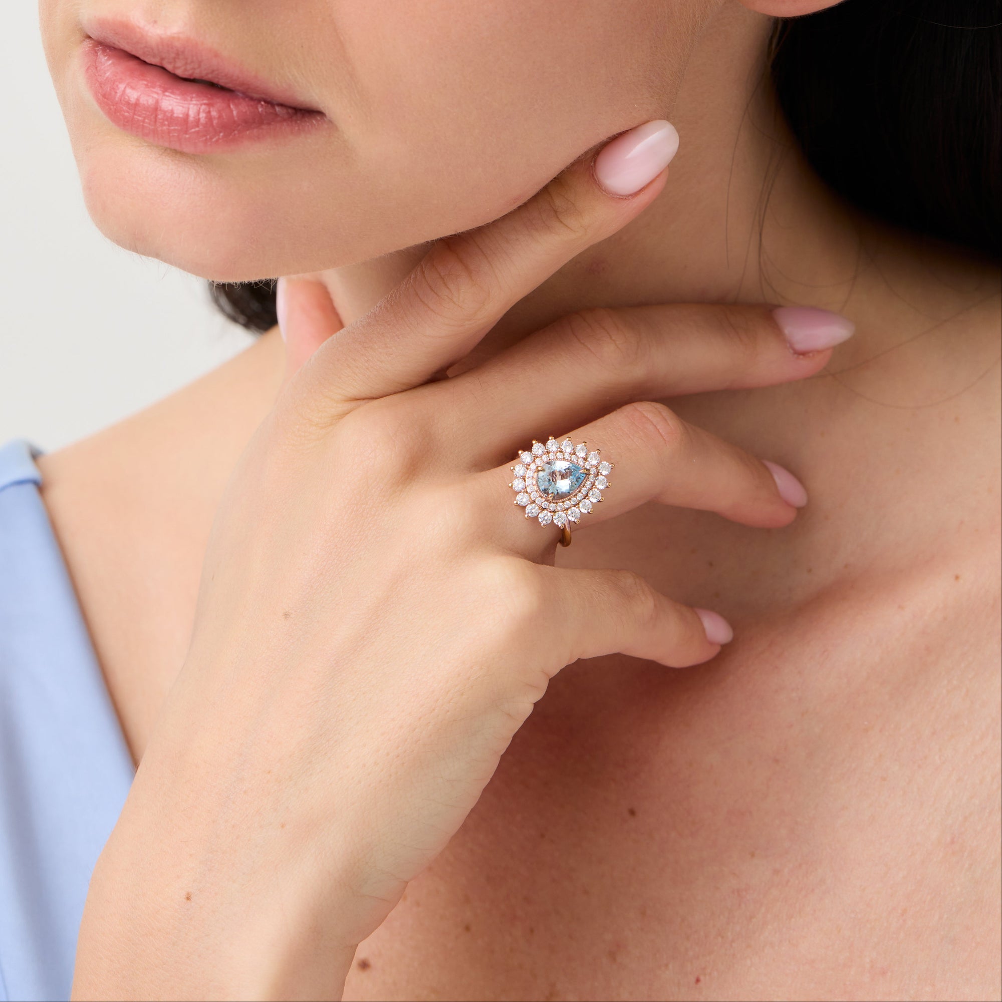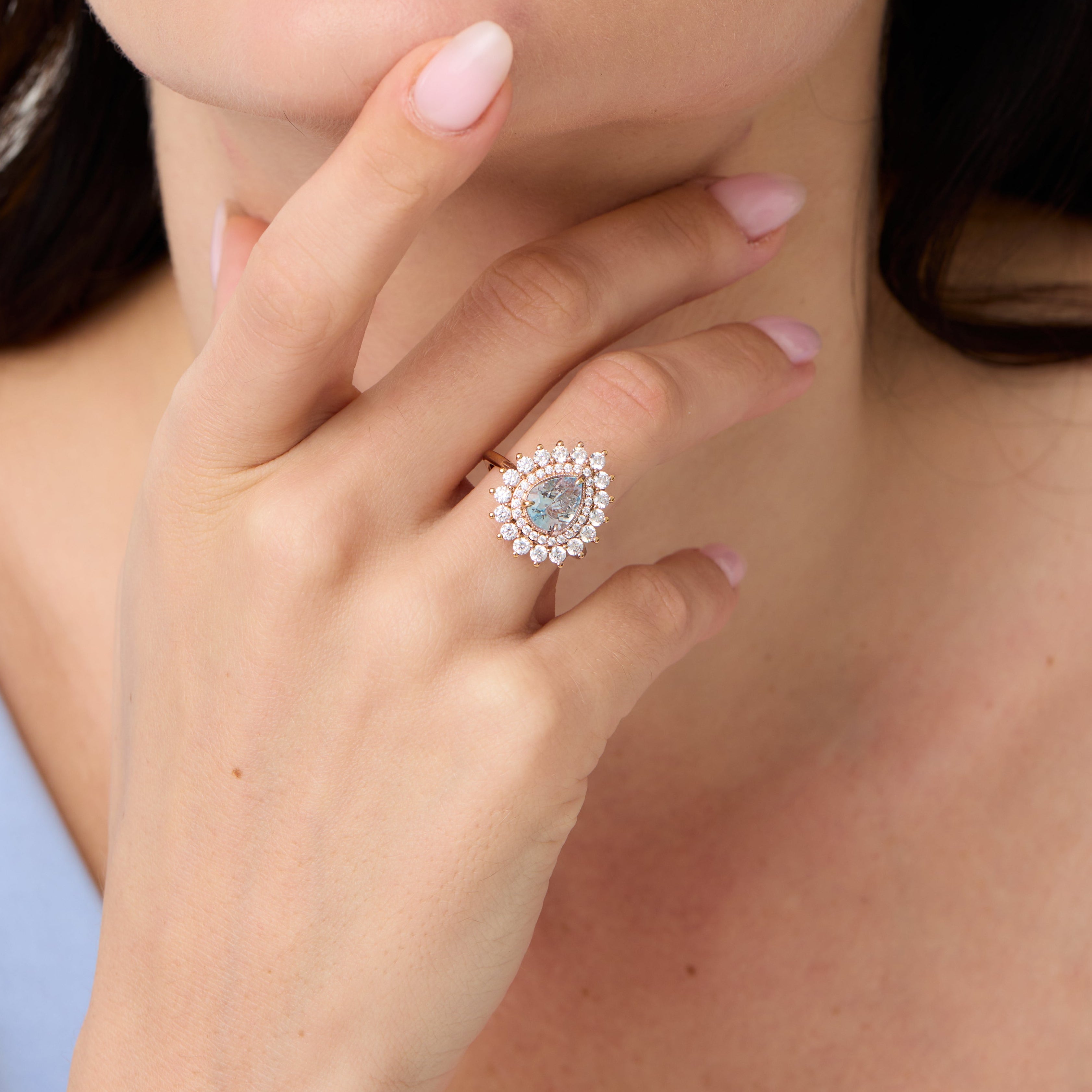 This beautiful Josephine Pear Aquamarine Double Halo Ring features two circles of sparkling diamonds framing a gorgeous aquamarine center stone. The diamond halo amplifies the brilliance of the stone while adding a touch of elegance.