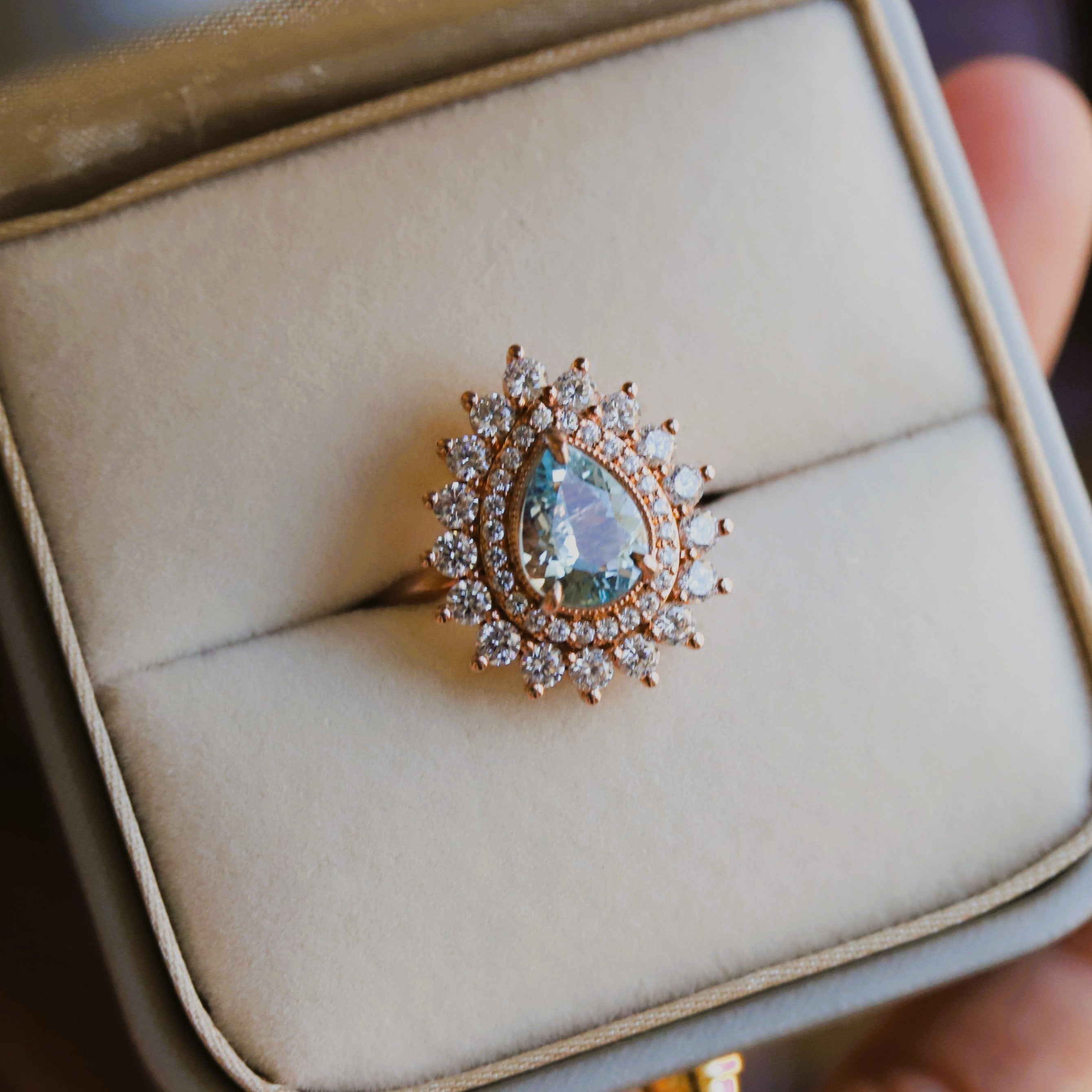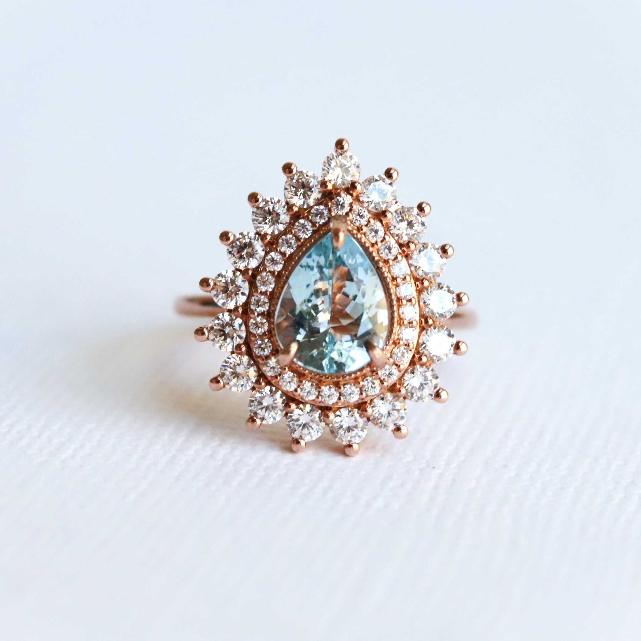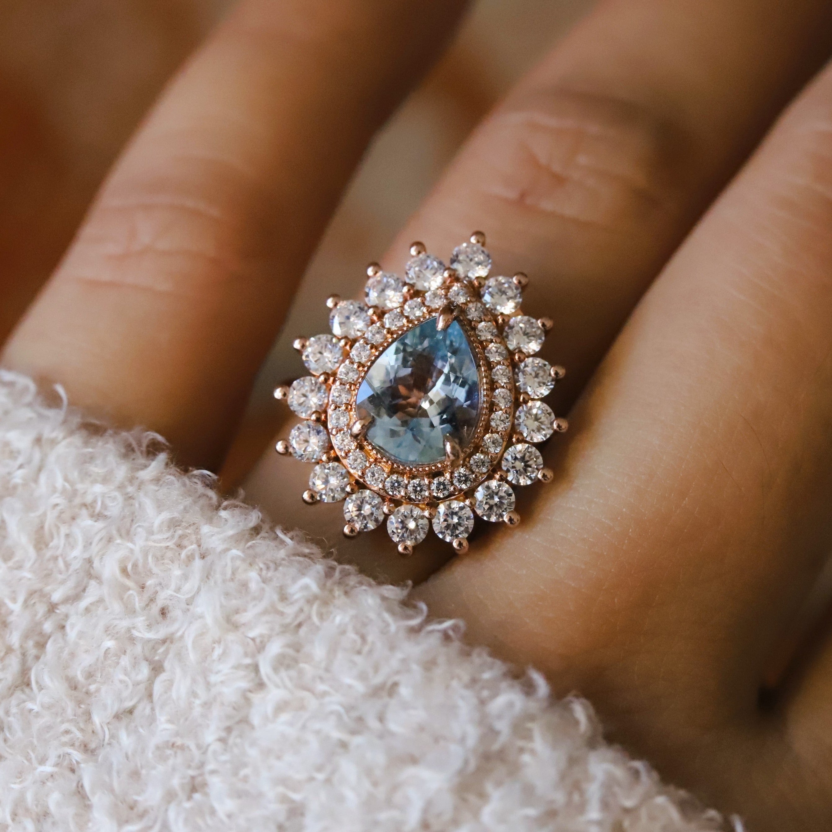 This beautiful Josephine Pear Aquamarine Double Halo Ring features two circles of sparkling diamonds framing a gorgeous aquamarine center stone. The diamond halo amplifies the brilliance of the stone while adding a touch of elegance.