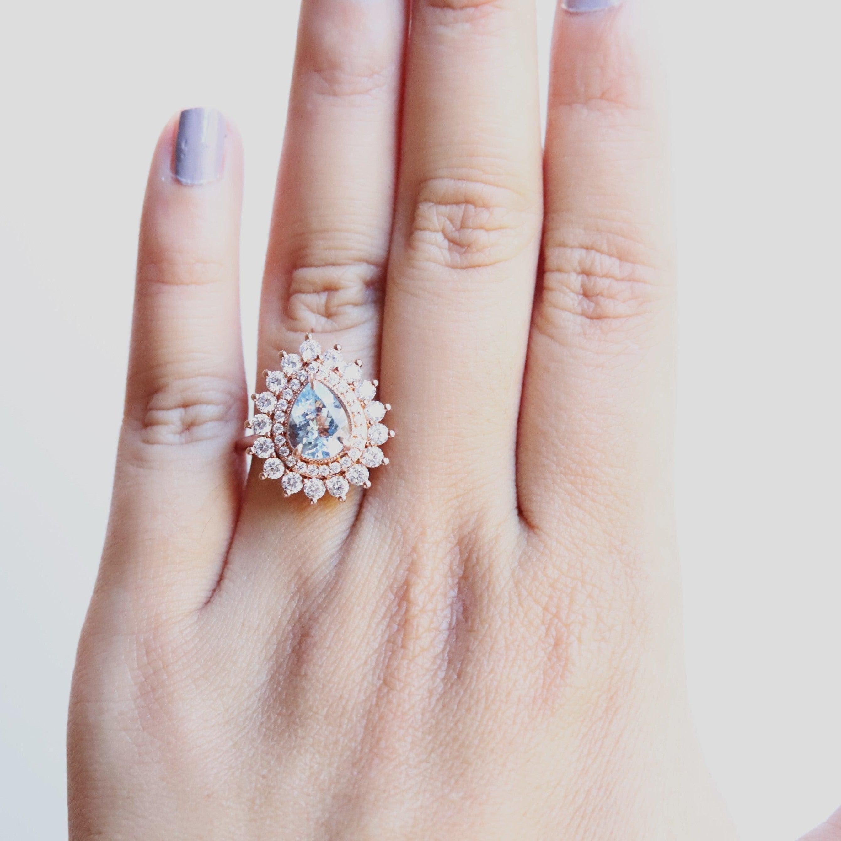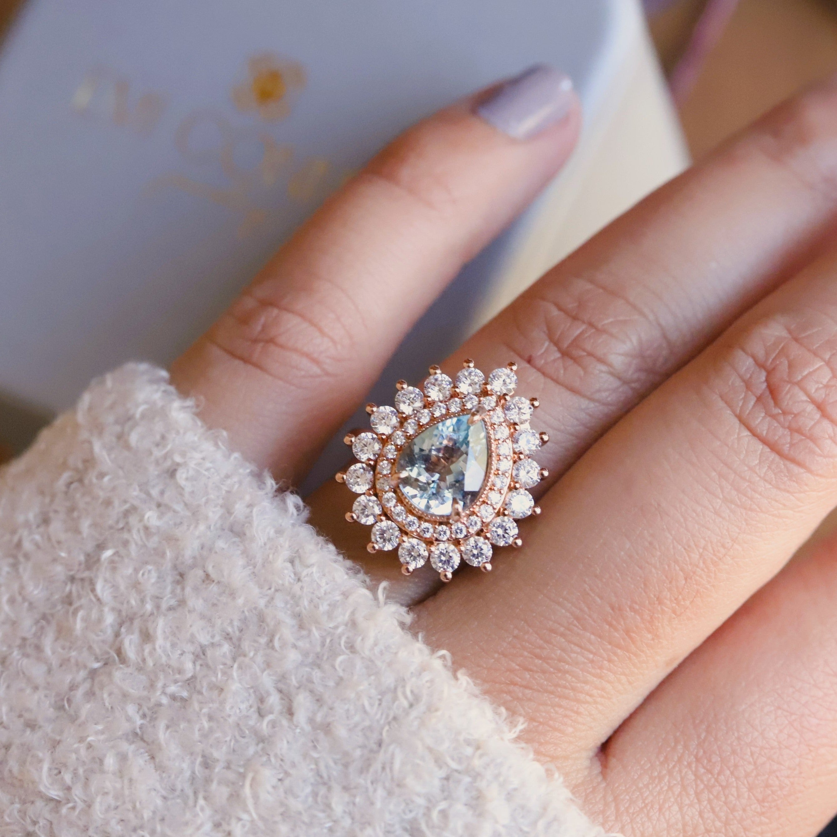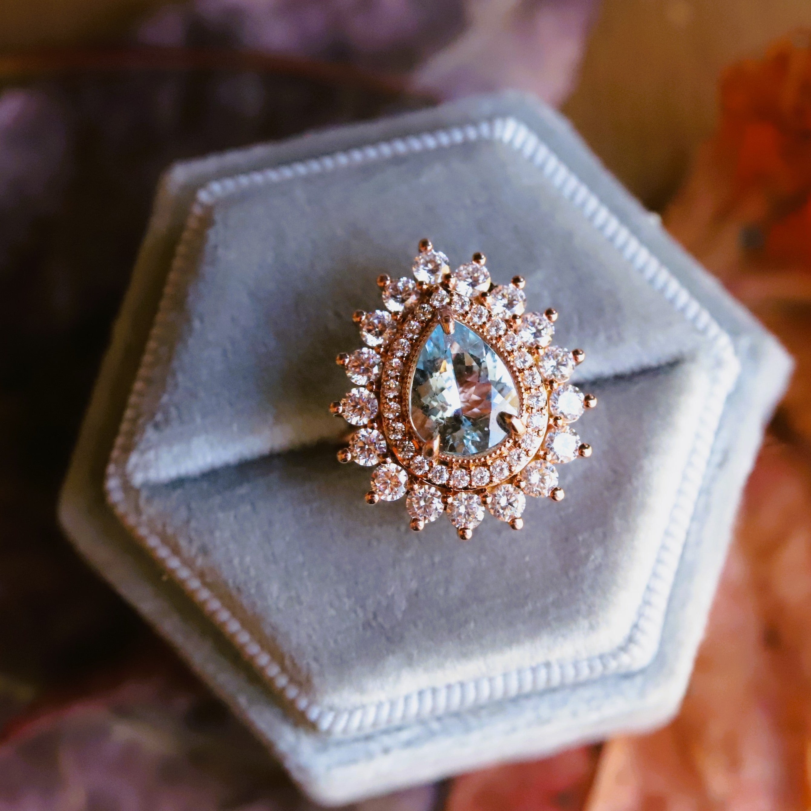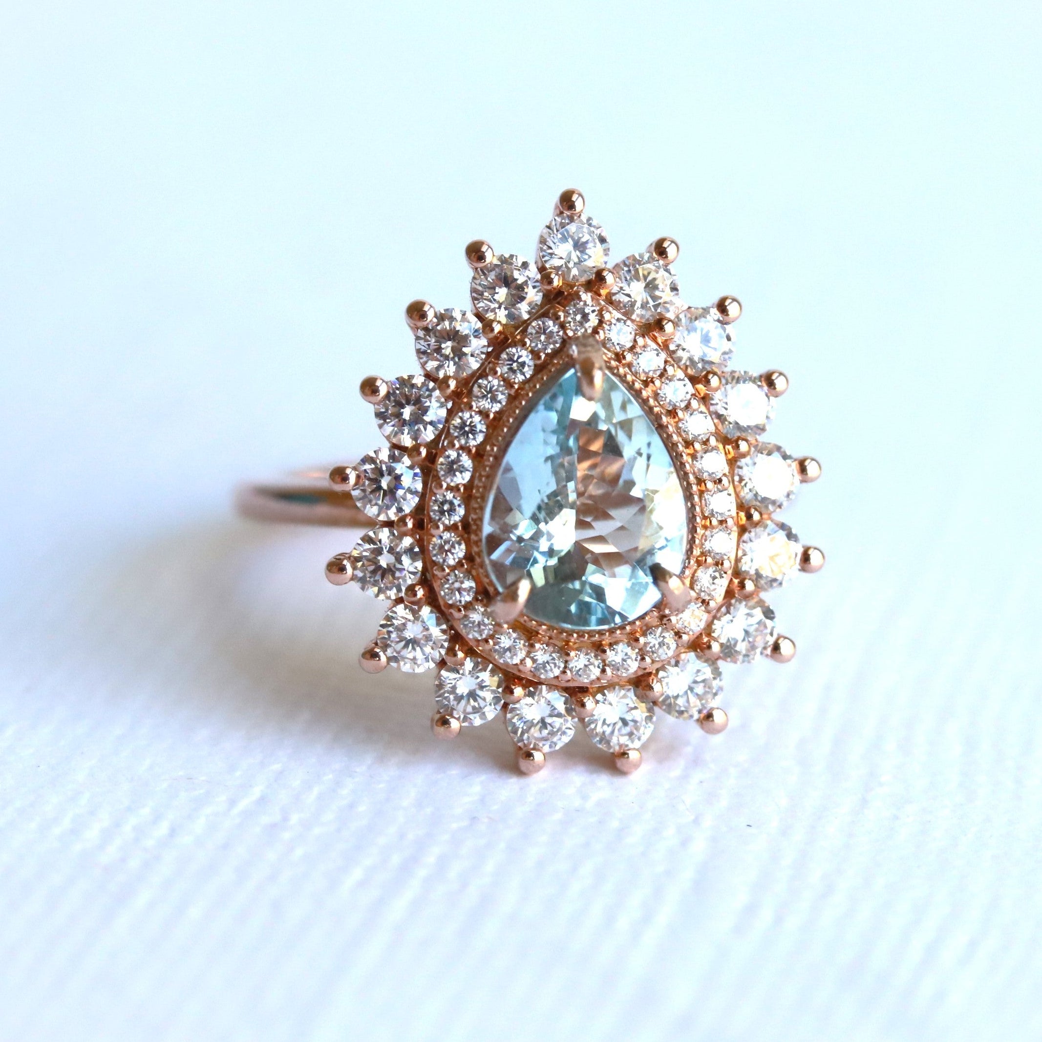 This beautiful Josephine Pear Aquamarine Double Halo Ring features two circles of sparkling diamonds framing a gorgeous aquamarine center stone. The diamond halo amplifies the brilliance of the stone while adding a touch of elegance.