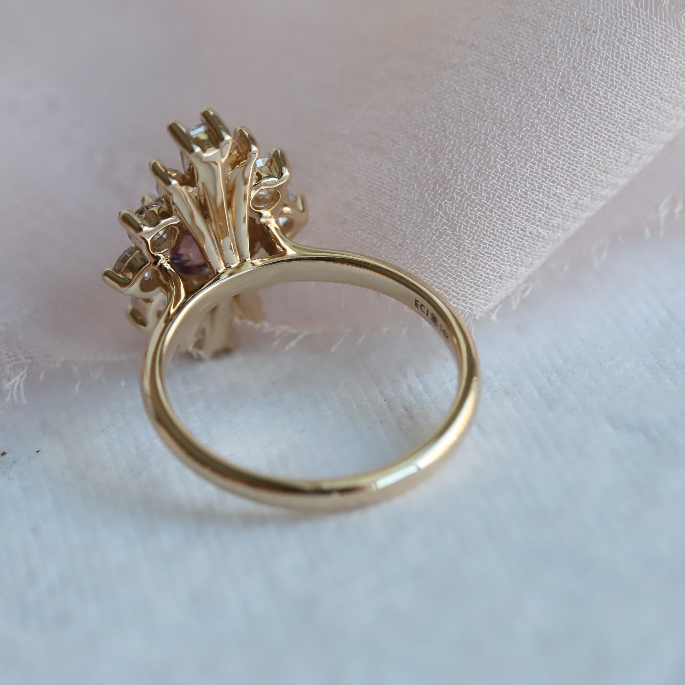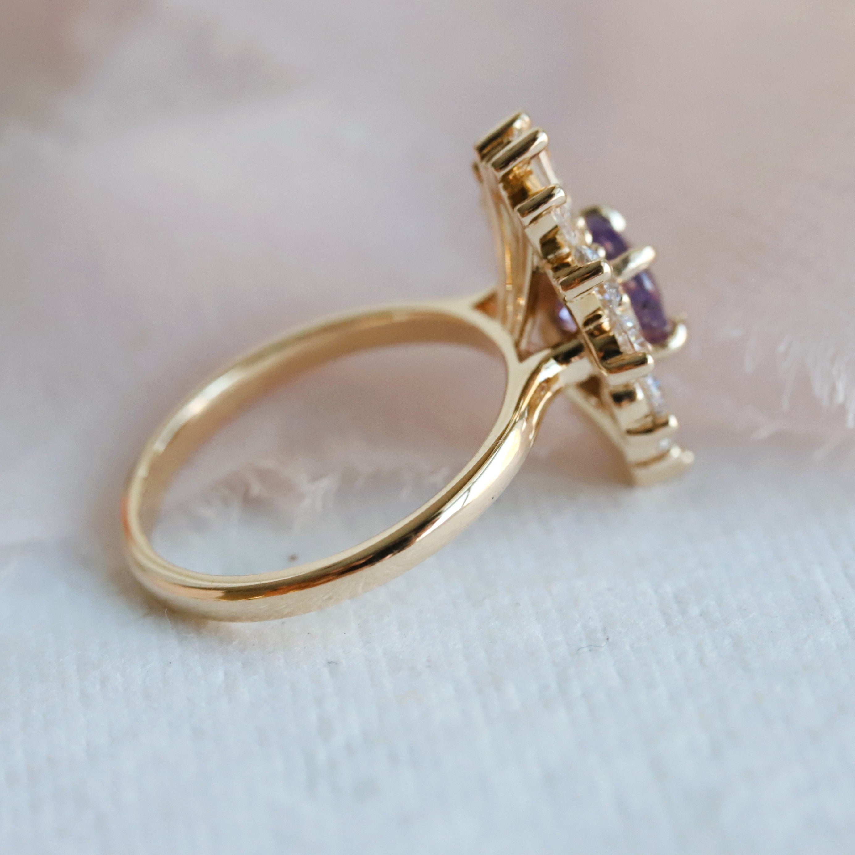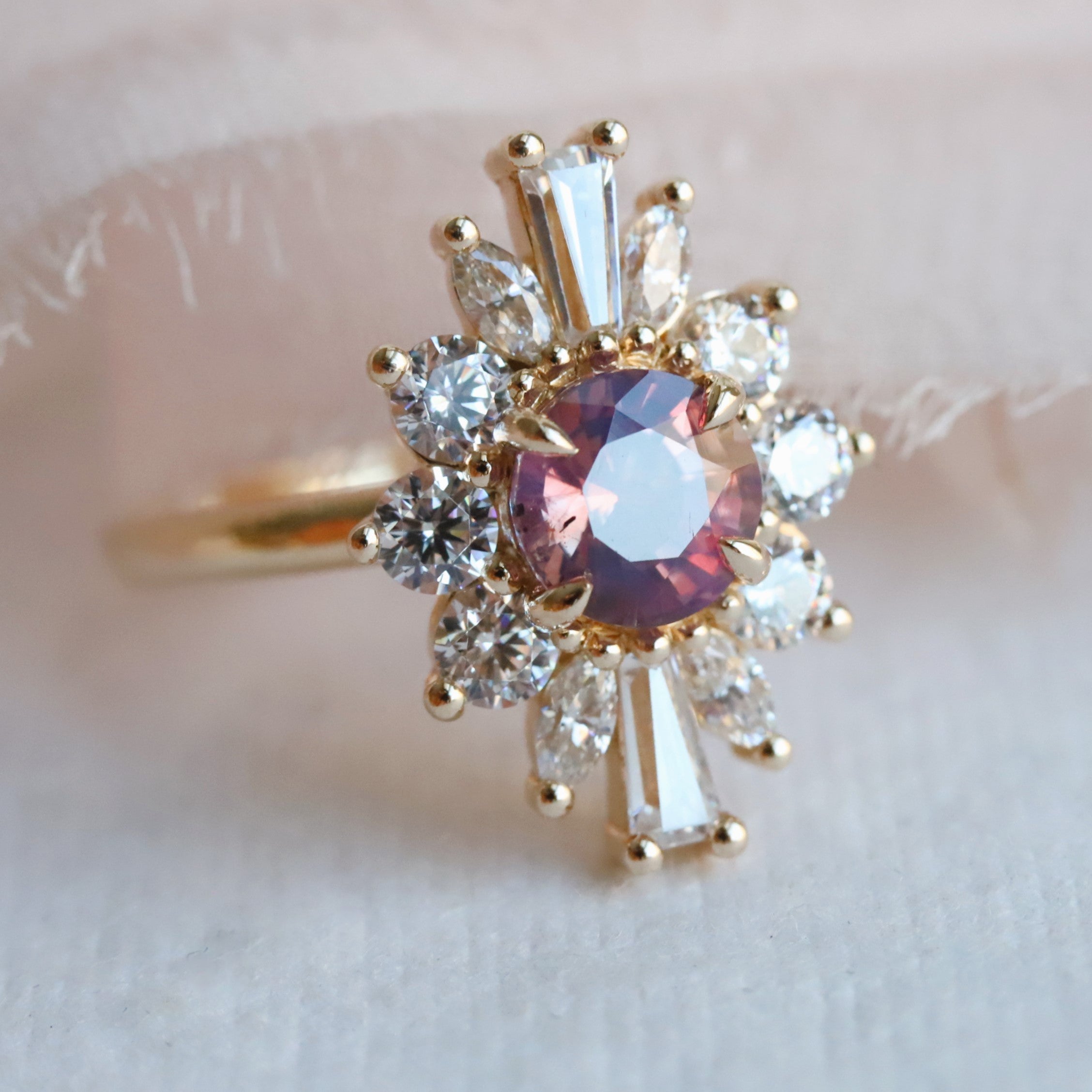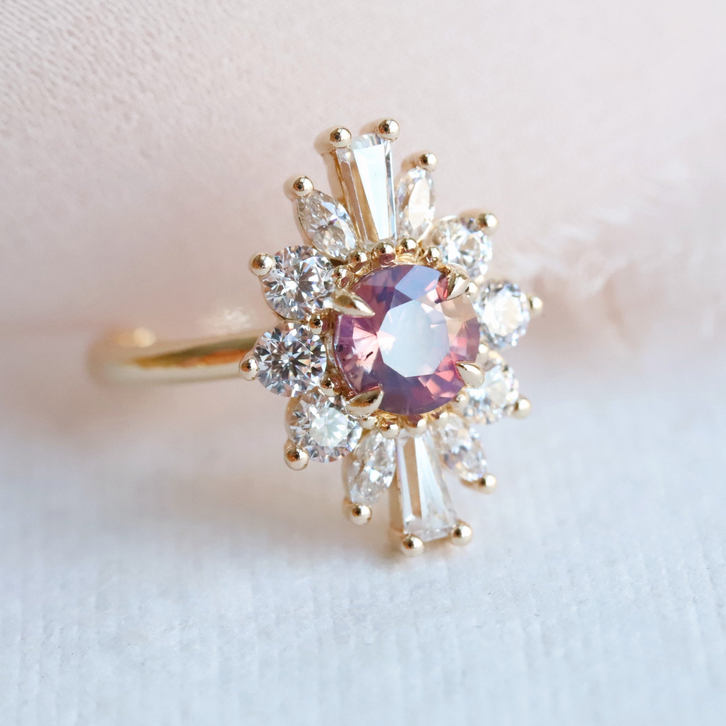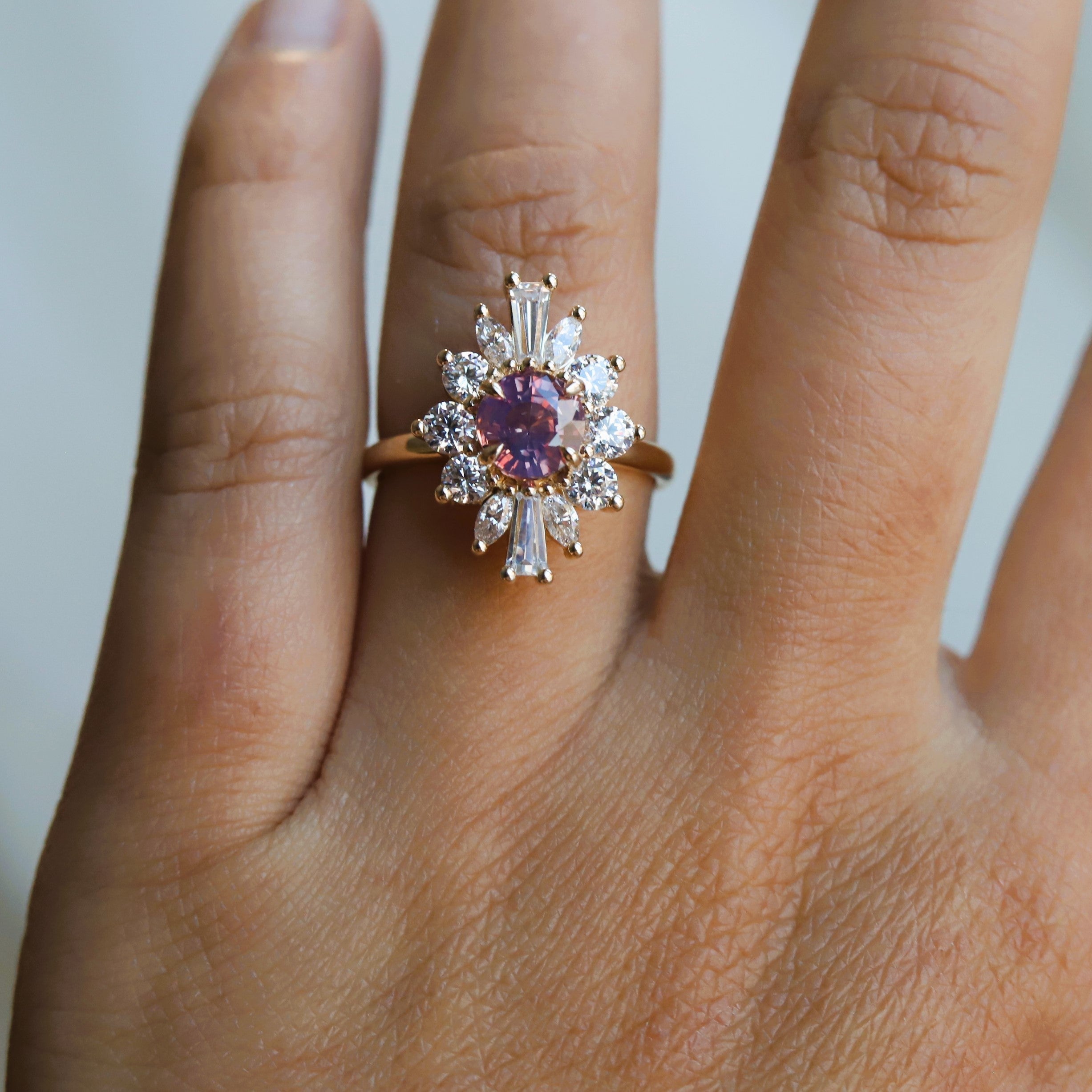 Meet CORA—a sophisticated engagement ring featuring a rare 1.58 carat Padparadscha sapphire surrounded by tapered baguette, marquise, and round diamonds. Its vintage-inspired cathedral setting pairs effortlessly with straight wedding bands, while the distinctive purplish-pink gemstone ensures an unforgettable presence.