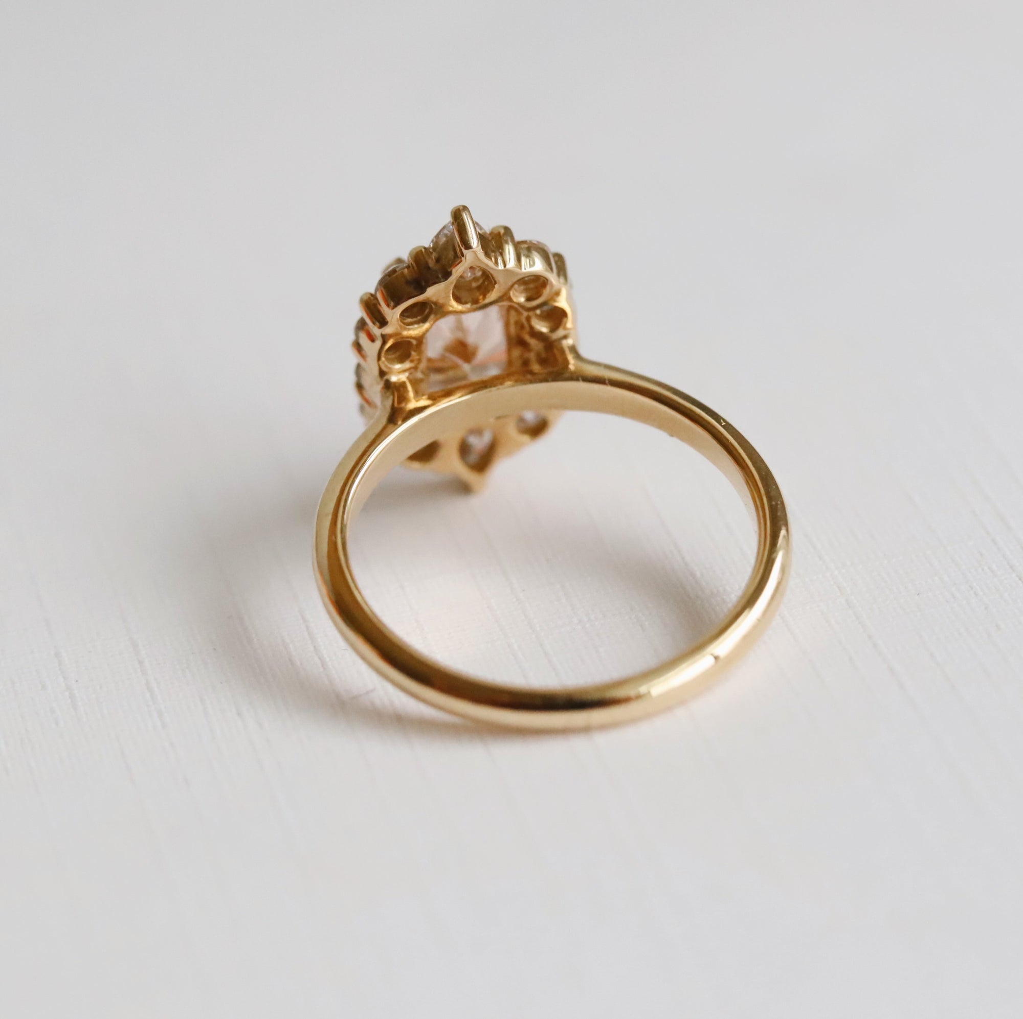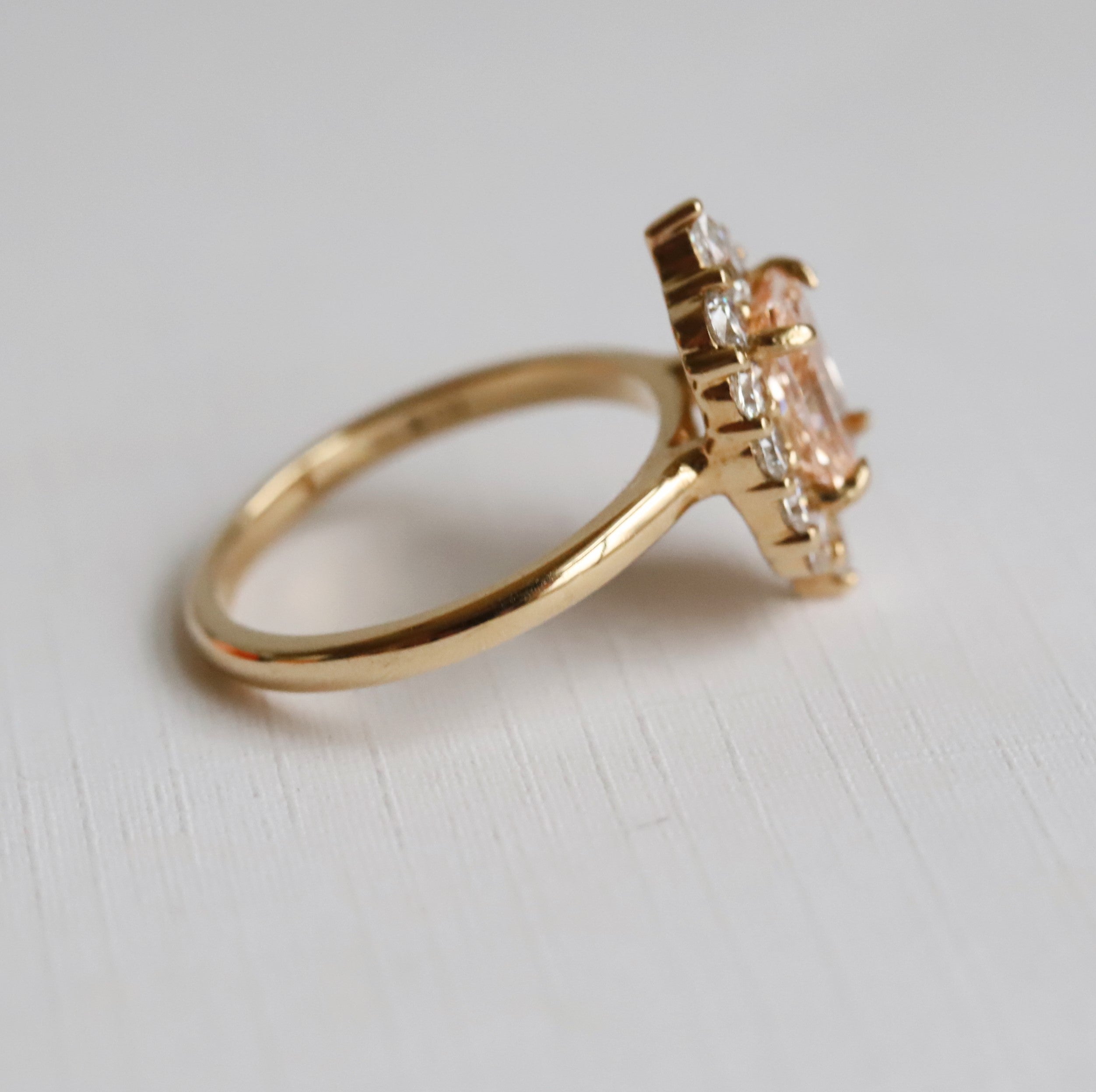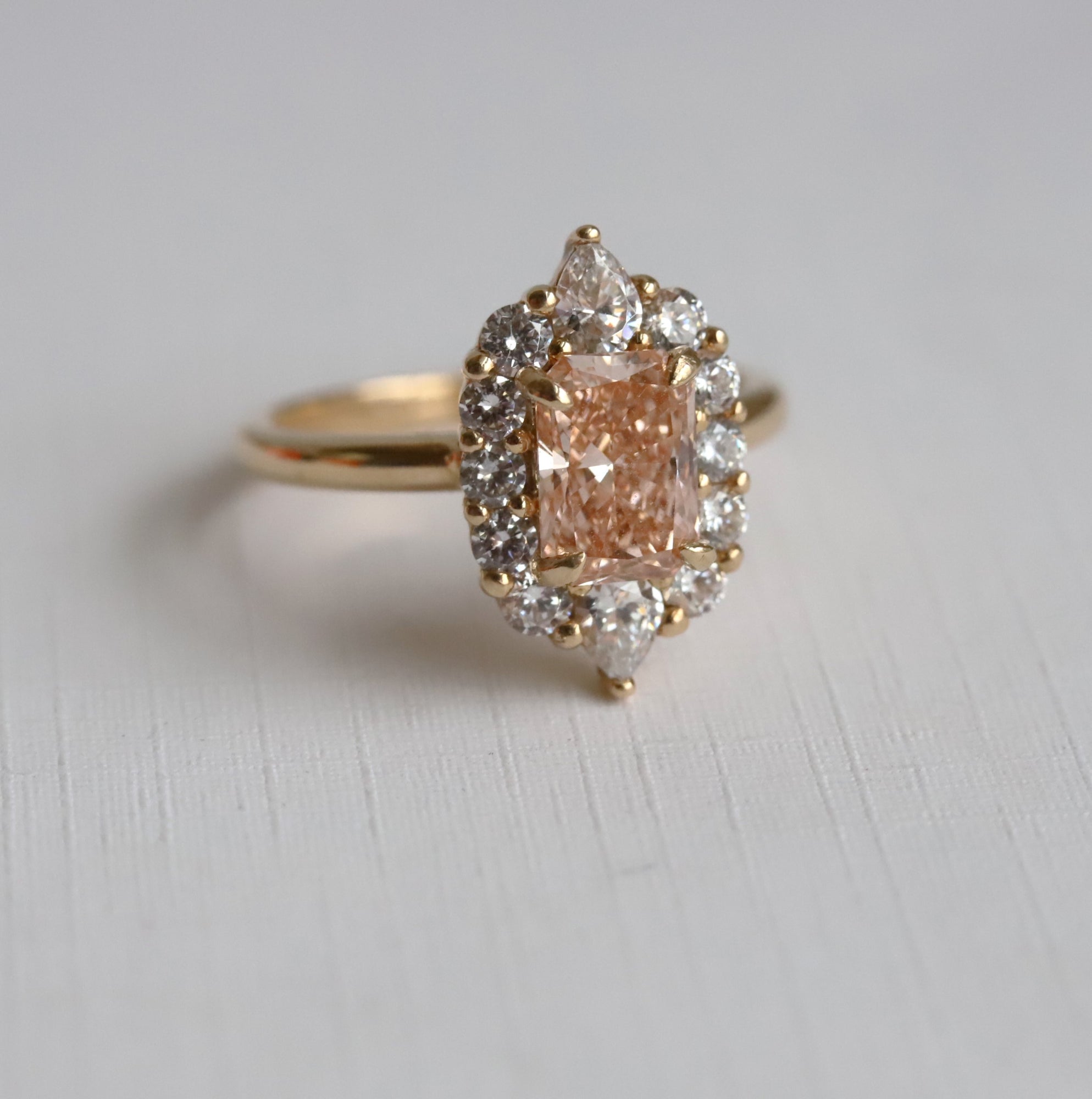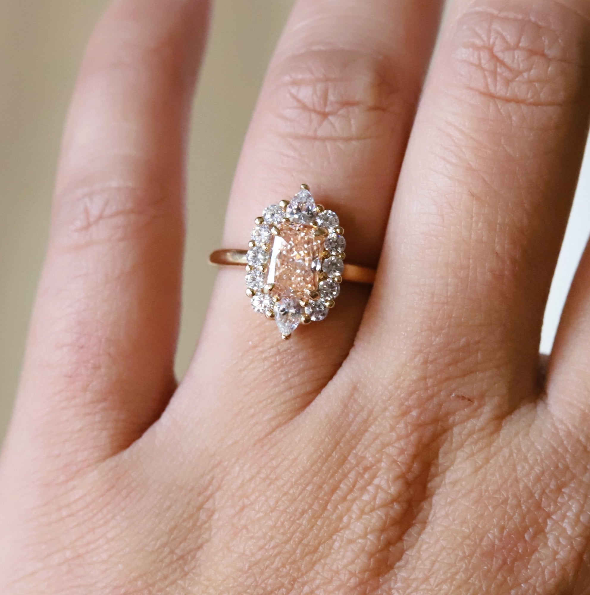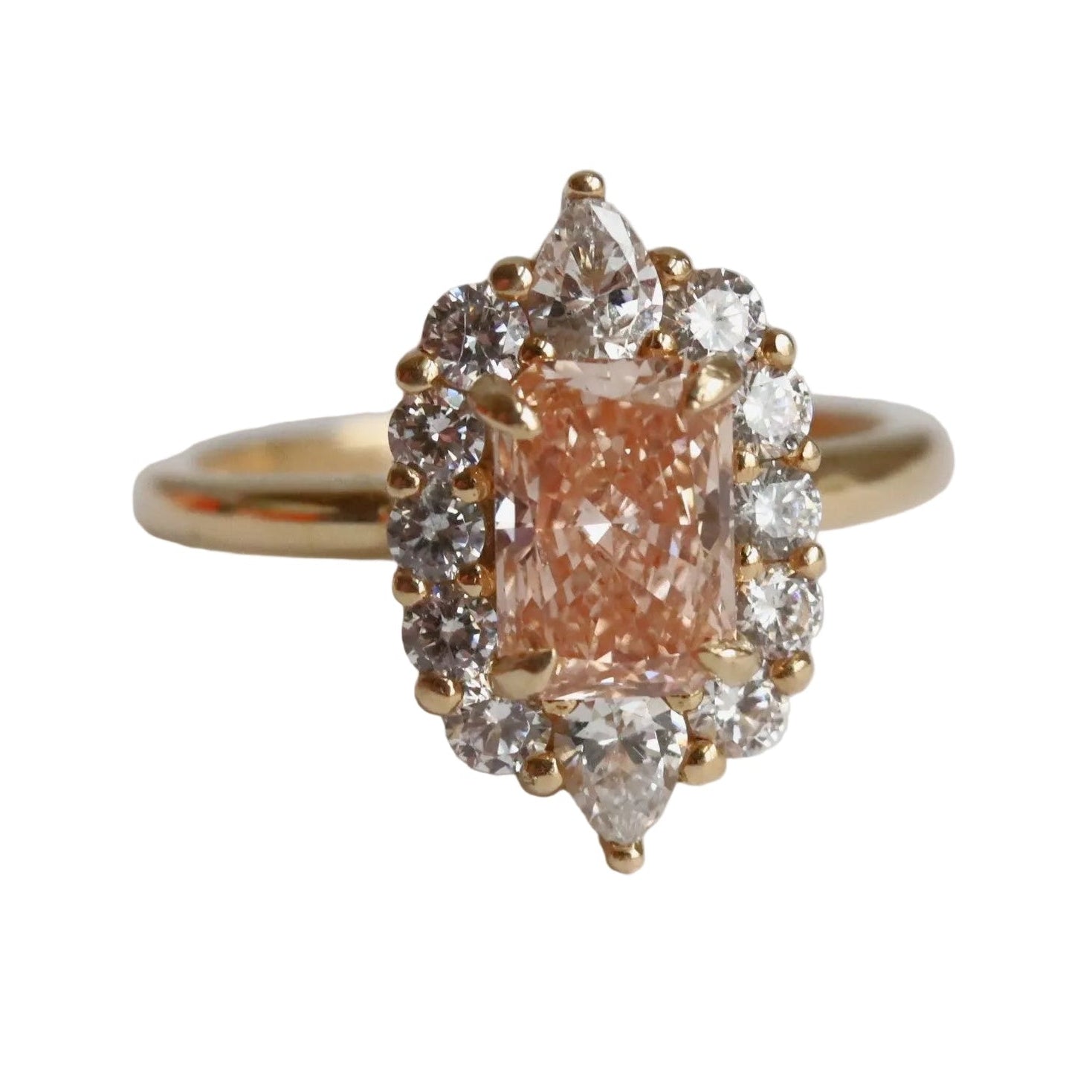 The Jazlyn ring reimagines engagement ring elegance with a lab-grown pink diamond that rivals morganite's romantic warmth while surpassing it in durability and care simplicity. This refined piece showcases a striking square cushion cut at its core, enveloped by an ornate halo of circular and teardrop gemstones set in shared prong arrangements that amplify its luminous presence. The elevated cathedral silhouette provides architectural grace and seamless compatibility with straight wedding bands, allowing for personalized styling. Perfect for the discerning bride seeking a distinctive, low-maintenance engagement ring that combines timeless sophistication with practical resilience.