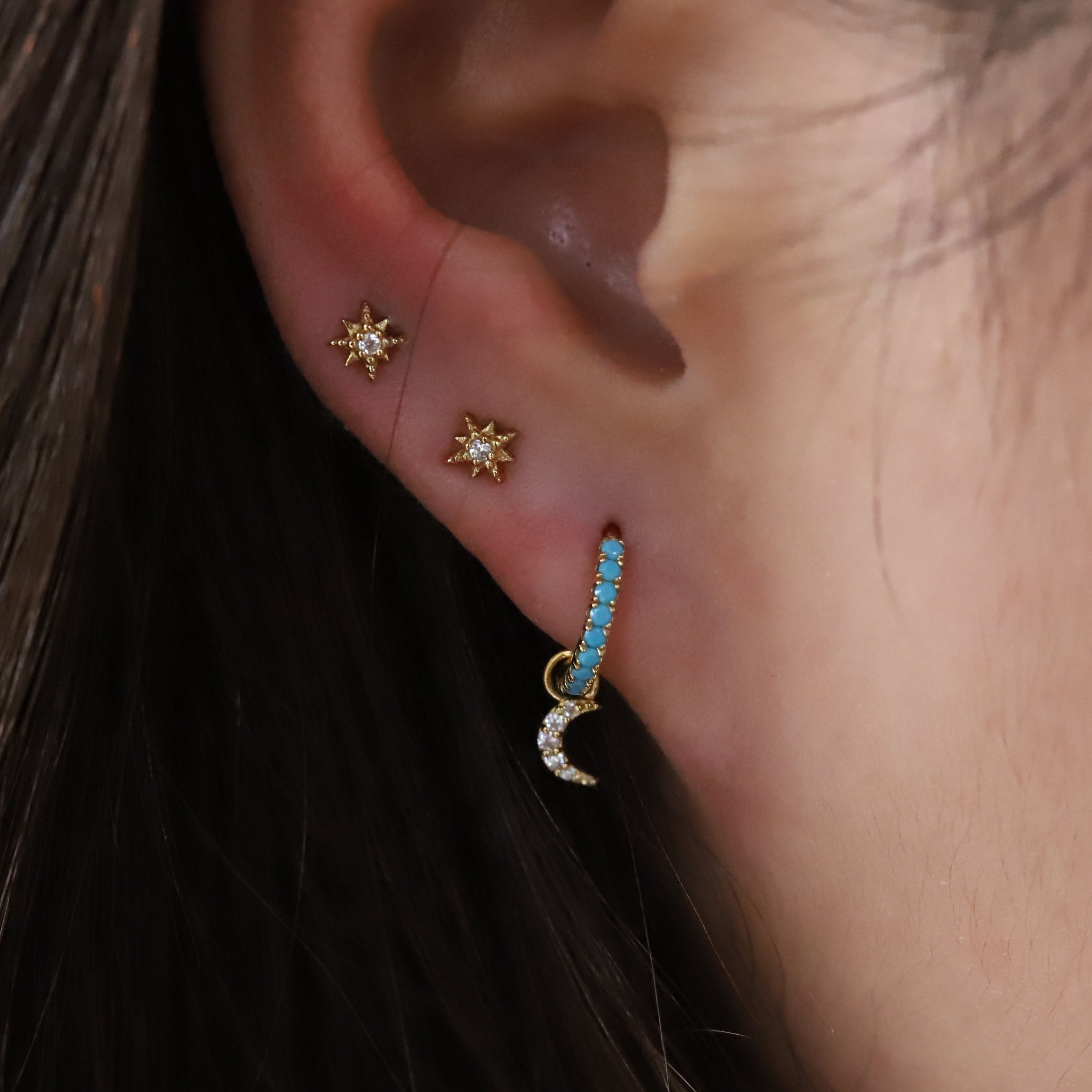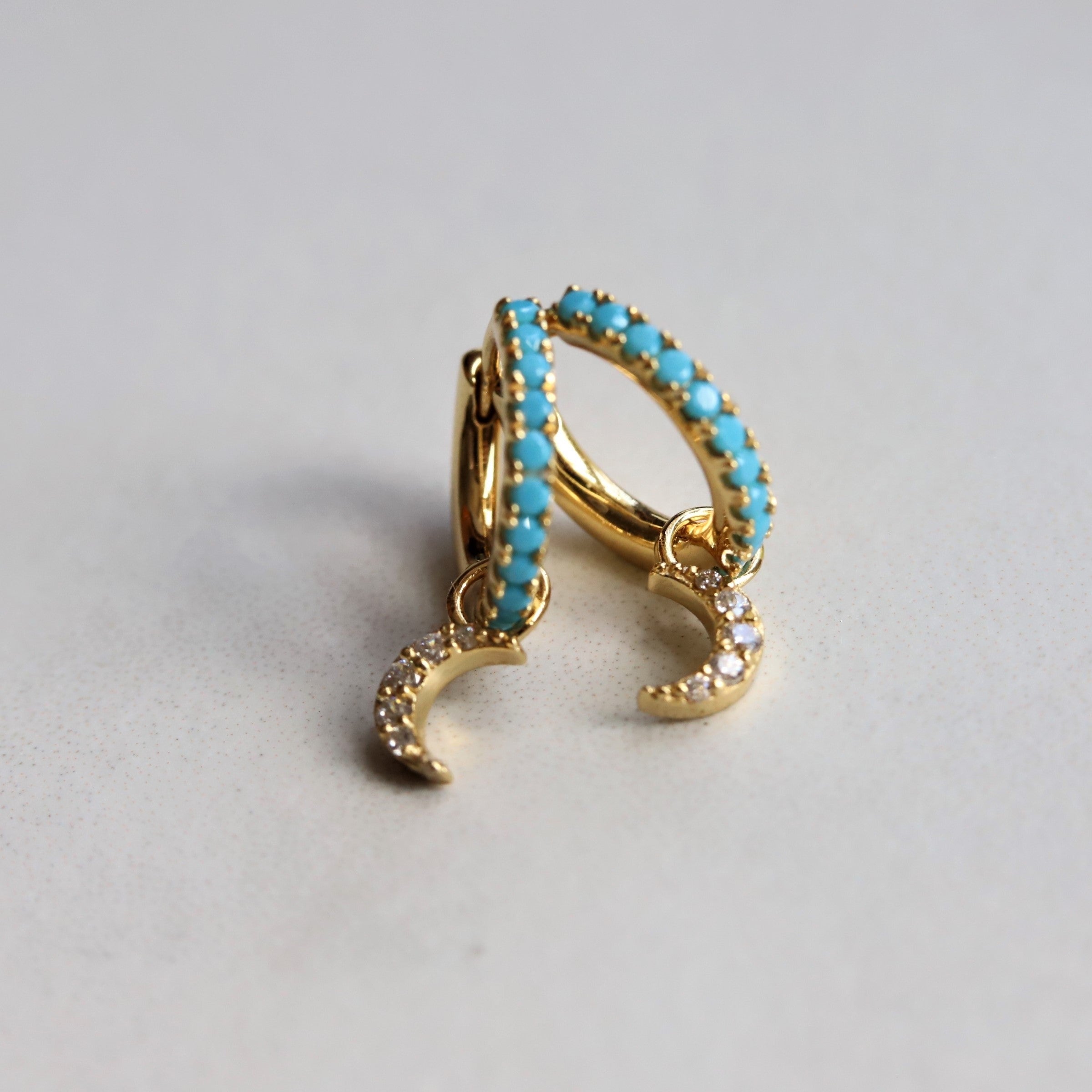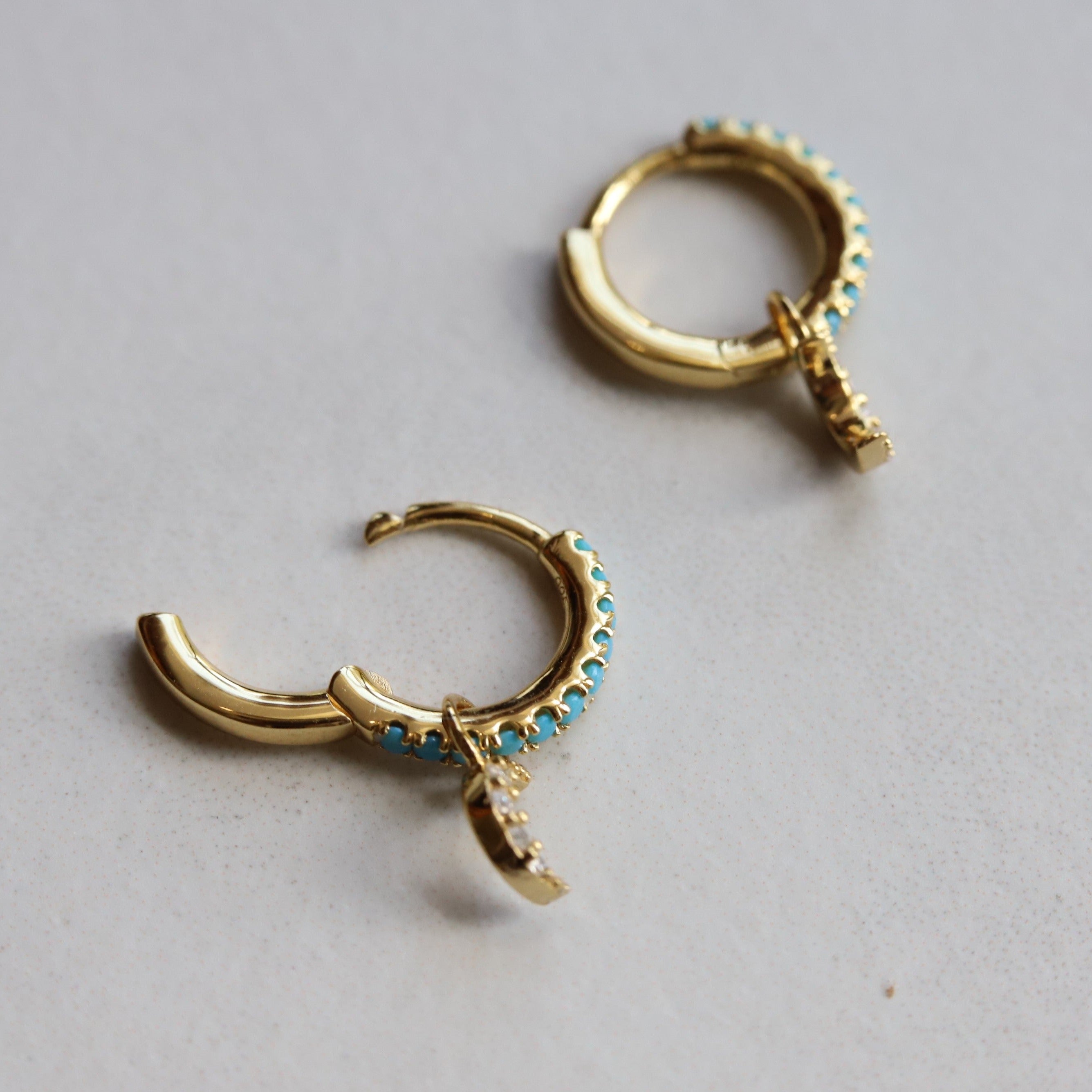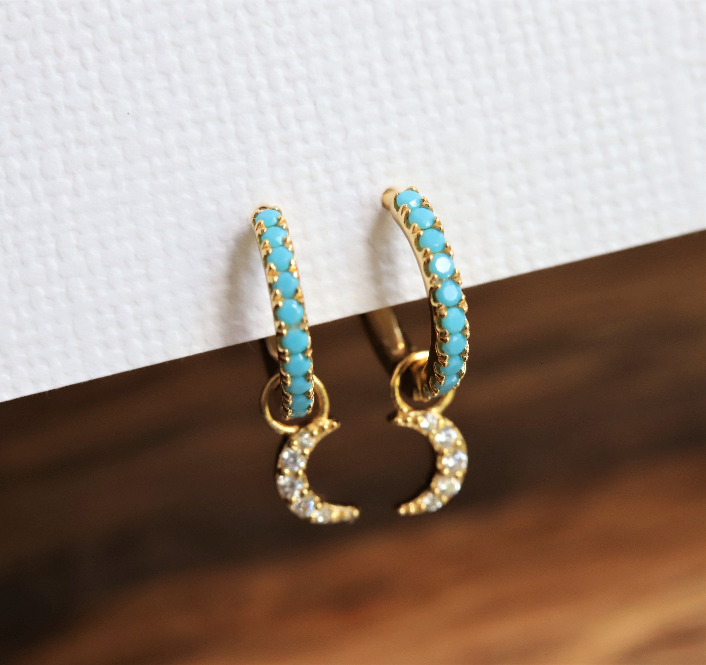 Adorn yourself with these beautiful Huggies earrings! Crafted in 14k Yellow Gold vermeil, precious sterling silver plated heavily 2.5 microns with 14k gold, and E-Coated for durability, set with Turquoise CZ stones, and a crescent moon dangle is reminiscent of a tranquil beach sunset or a gorgeous sky. Add a sparkle to your look with the turquoise blue shade of these earrings.