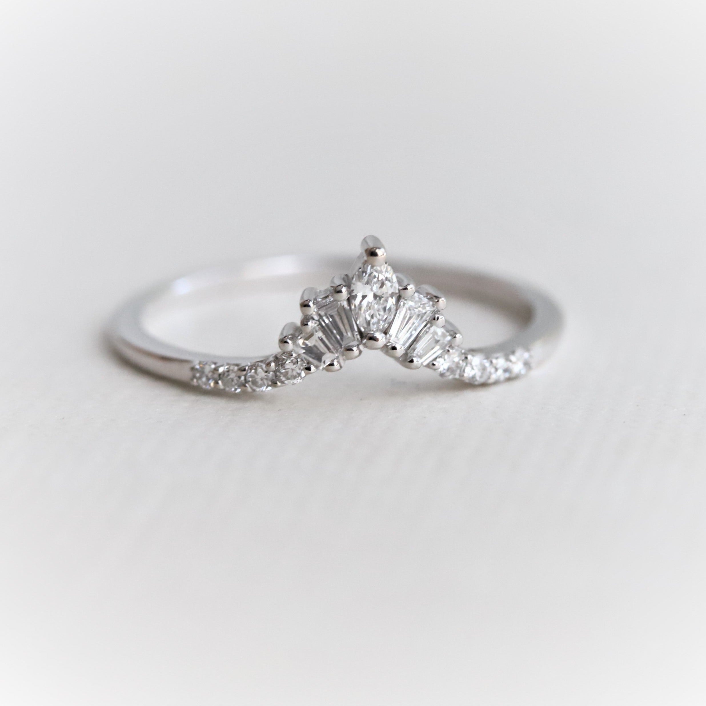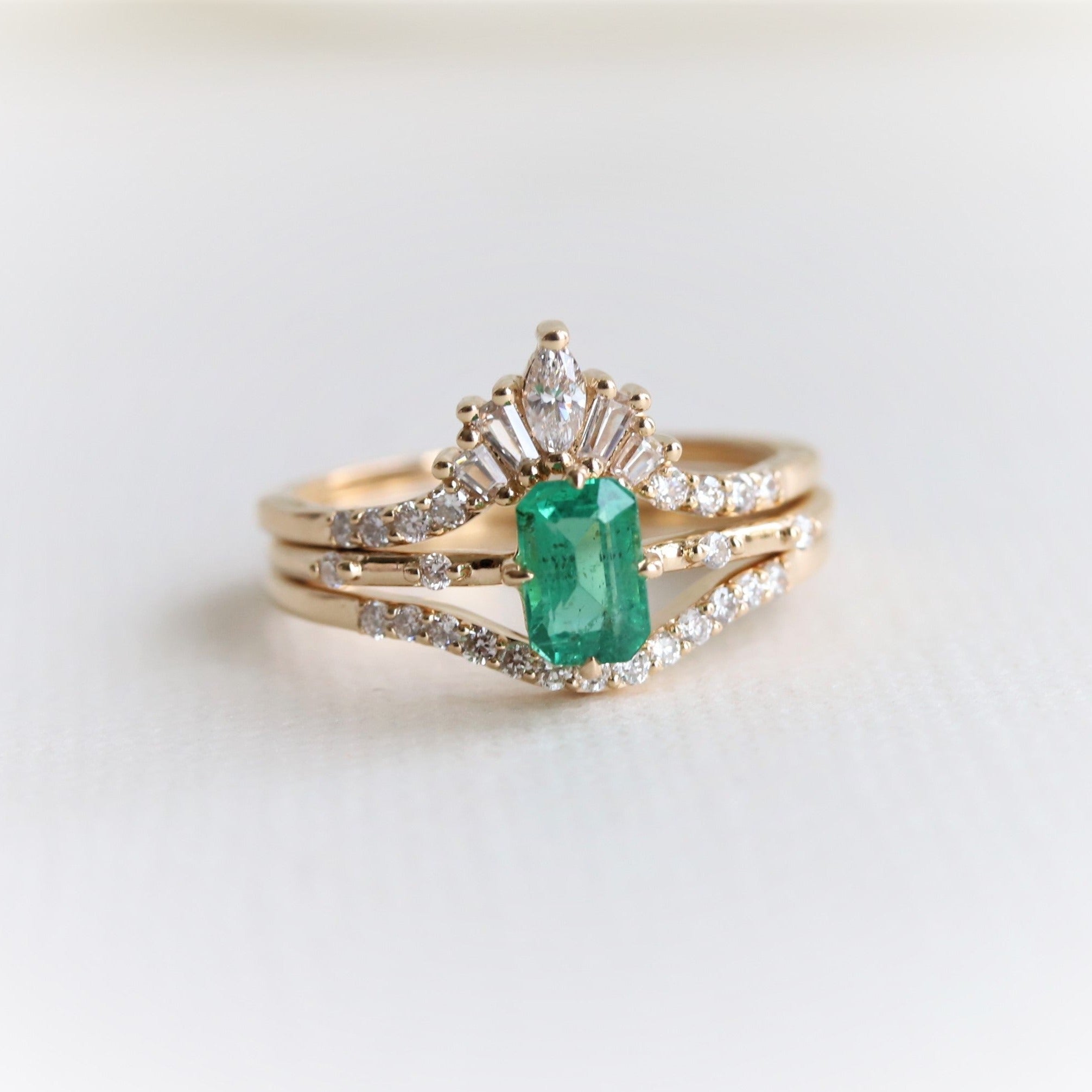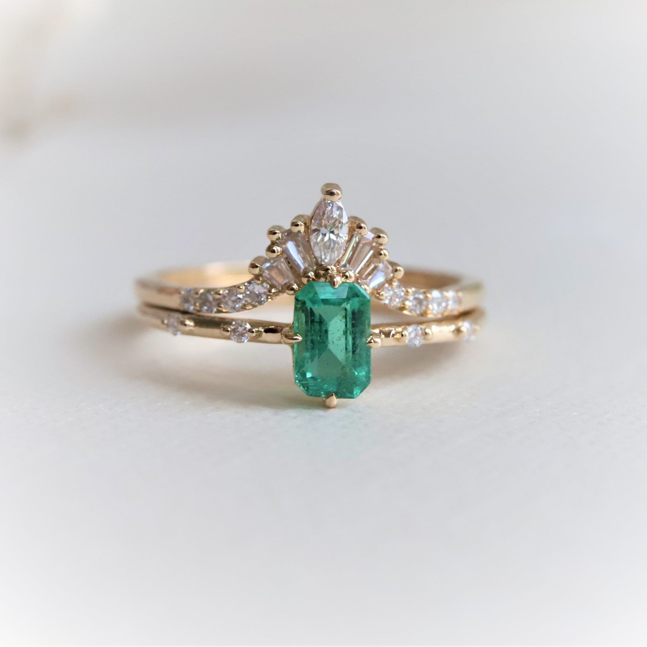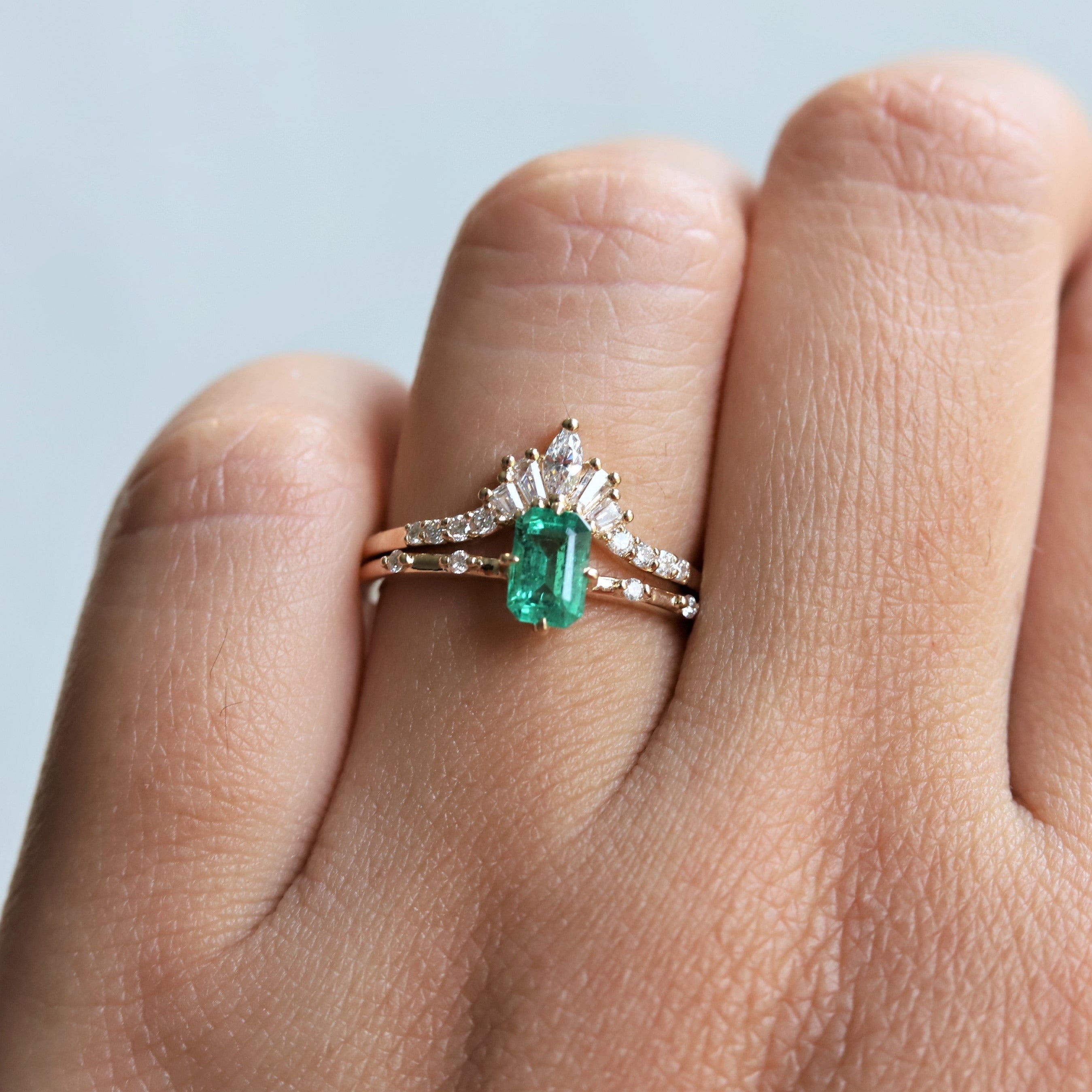 The contour band showcases round, marquise, and tapered baguette-shaped stones, perfectly complementing the 6x4 mm Emerald cut ring from our Aurora collection.