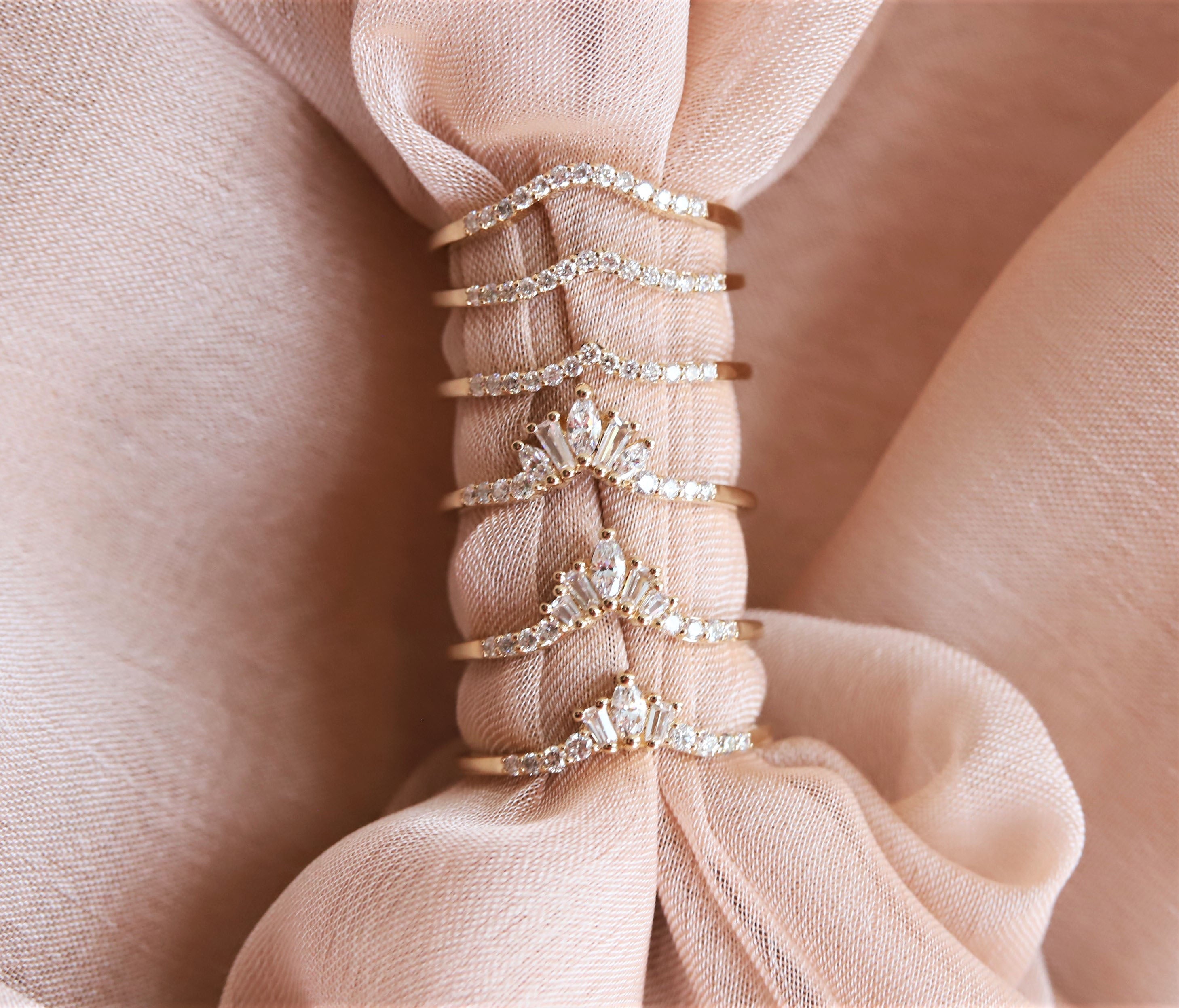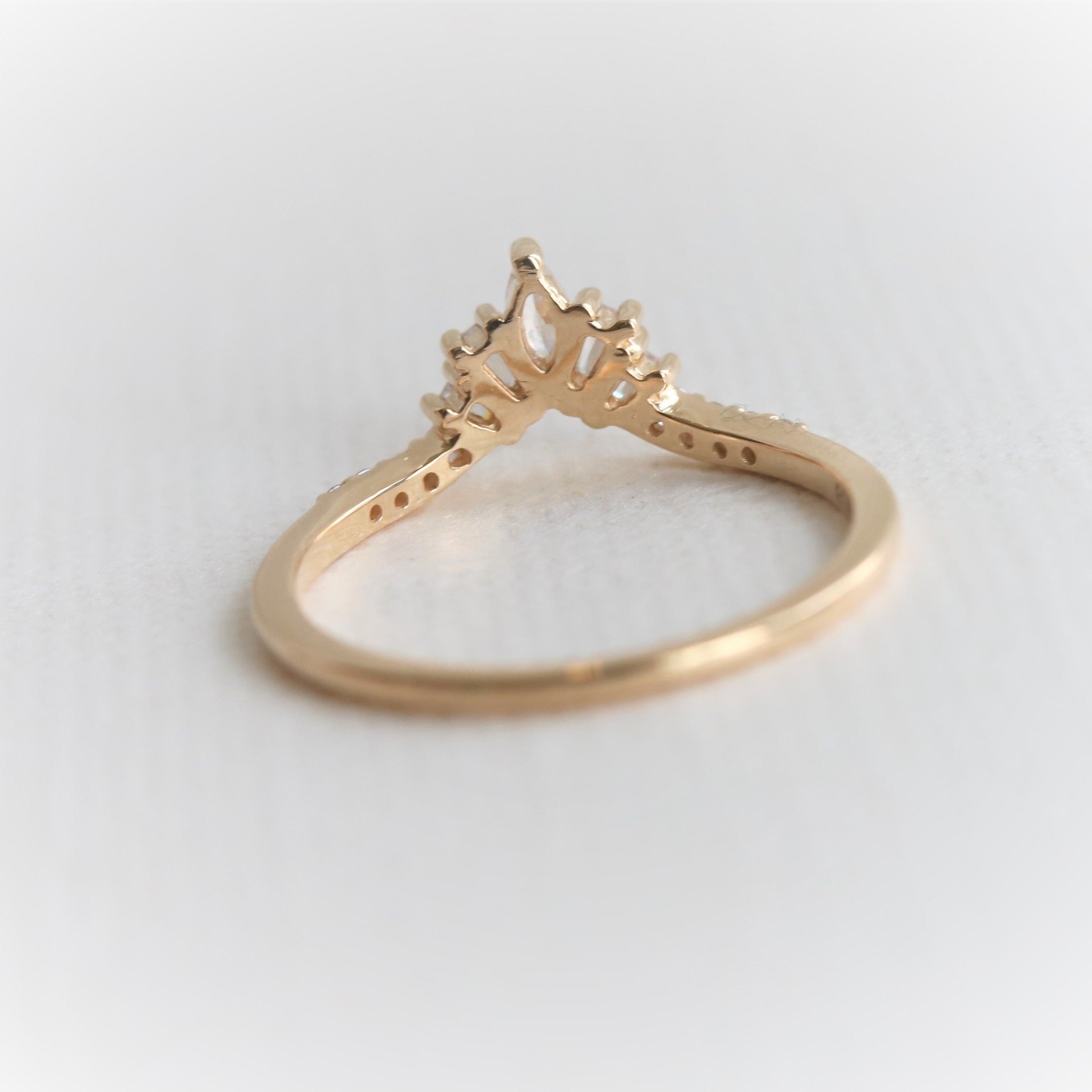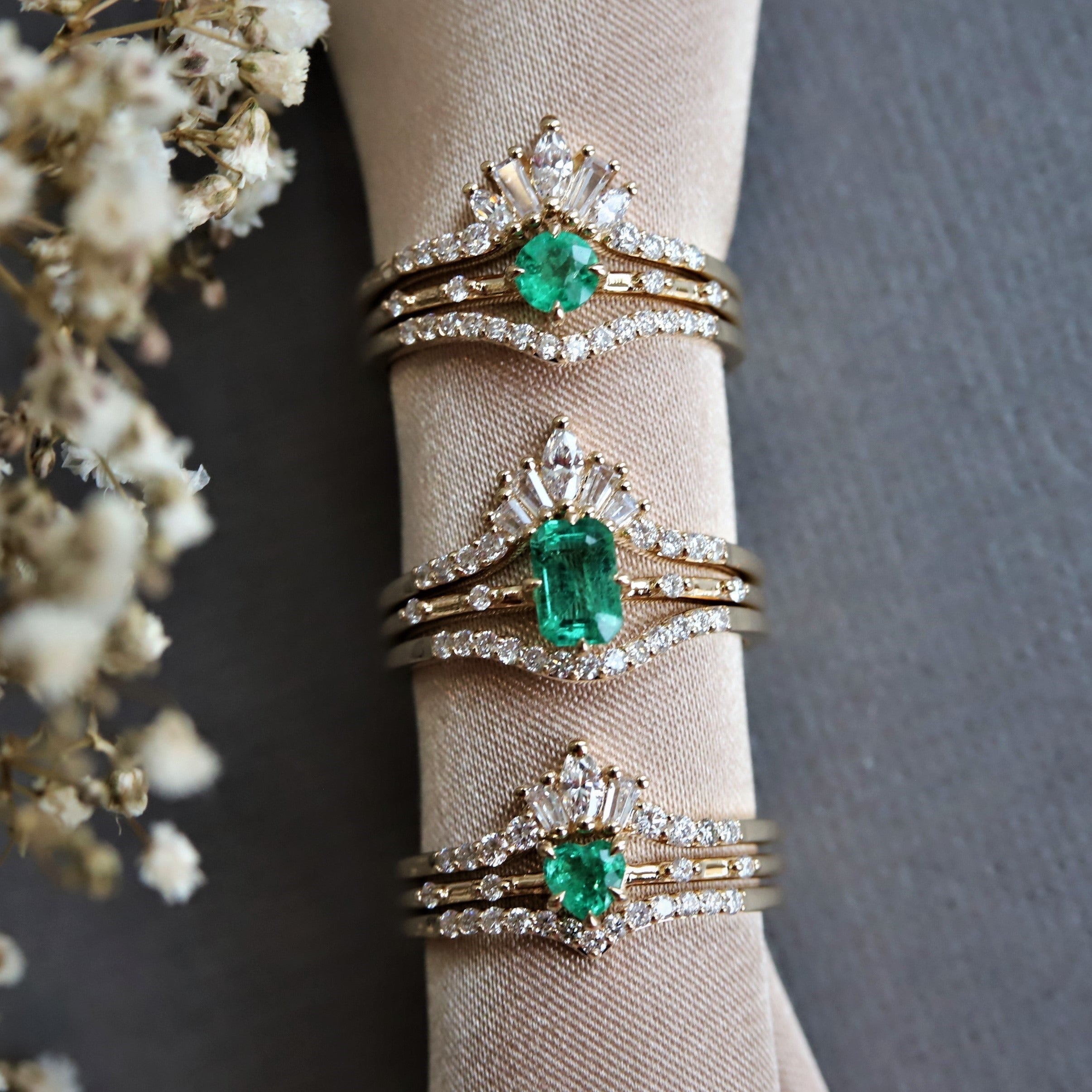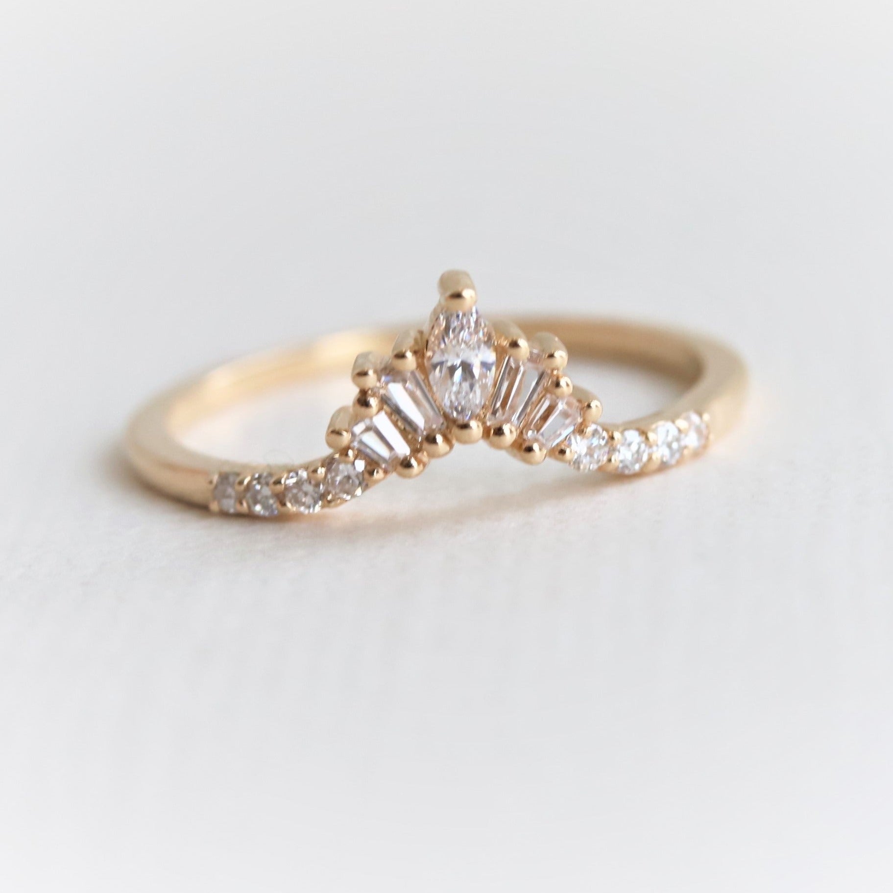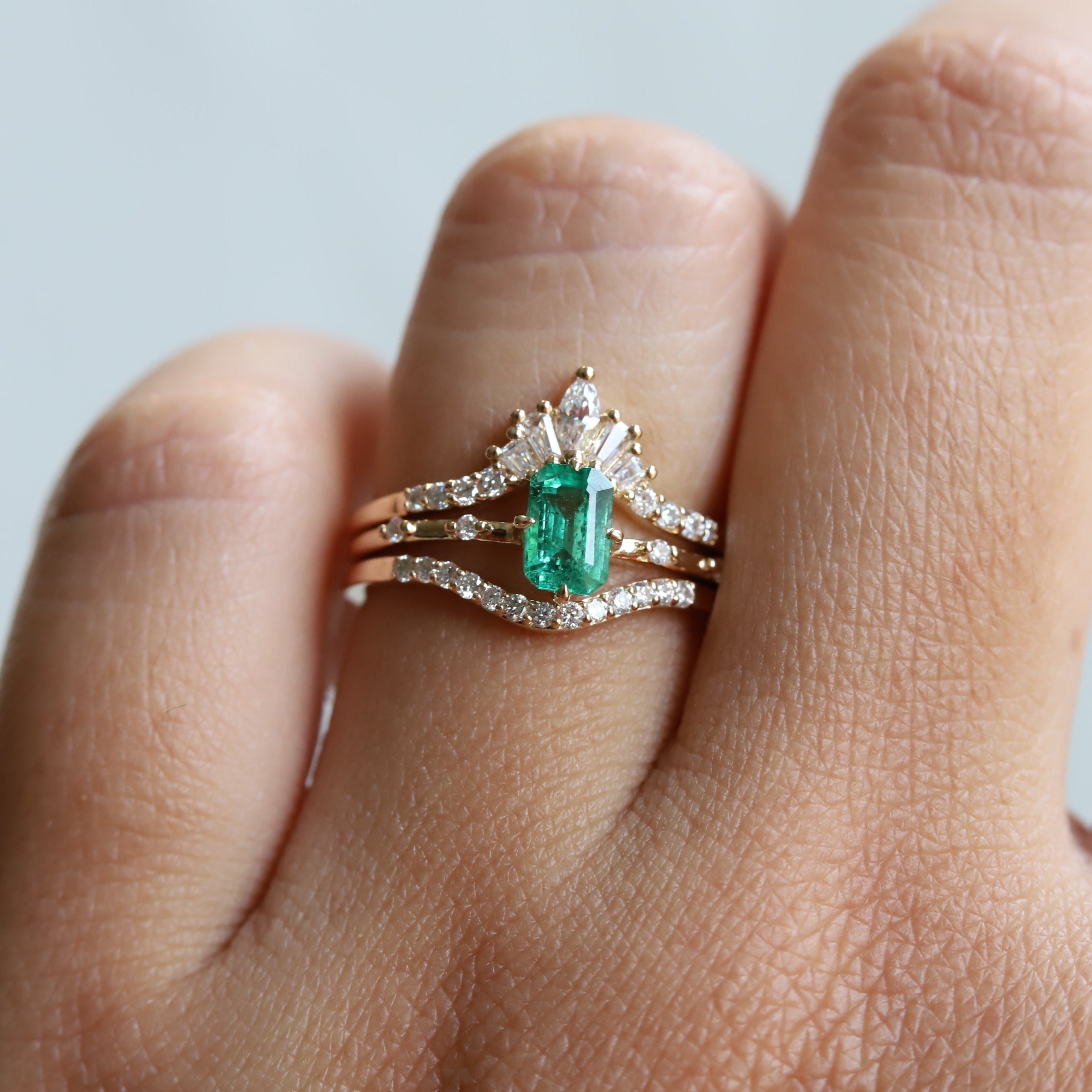 The contour band showcases round, marquise, and tapered baguette-shaped stones, perfectly complementing the 6x4 mm Emerald cut ring from our Aurora collection.