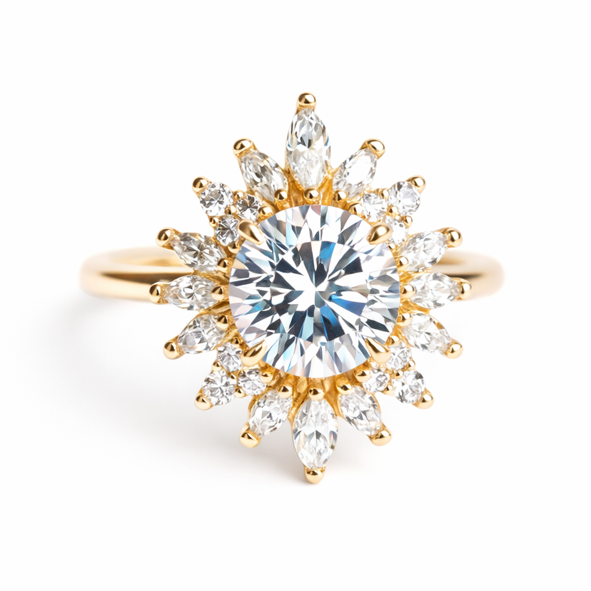 Our iconic Lana ring in brilliant-cut round lab-grown diamond, surrounded by a dazzling halo of marquise and round stones, is delicately set in a four-prong setting. The shimmering cluster of side diamonds adds allure, while the slim band offers both elegance and comfort. Perfect for any occasion, this meticulously crafted ring is destined to be cherished for generations.