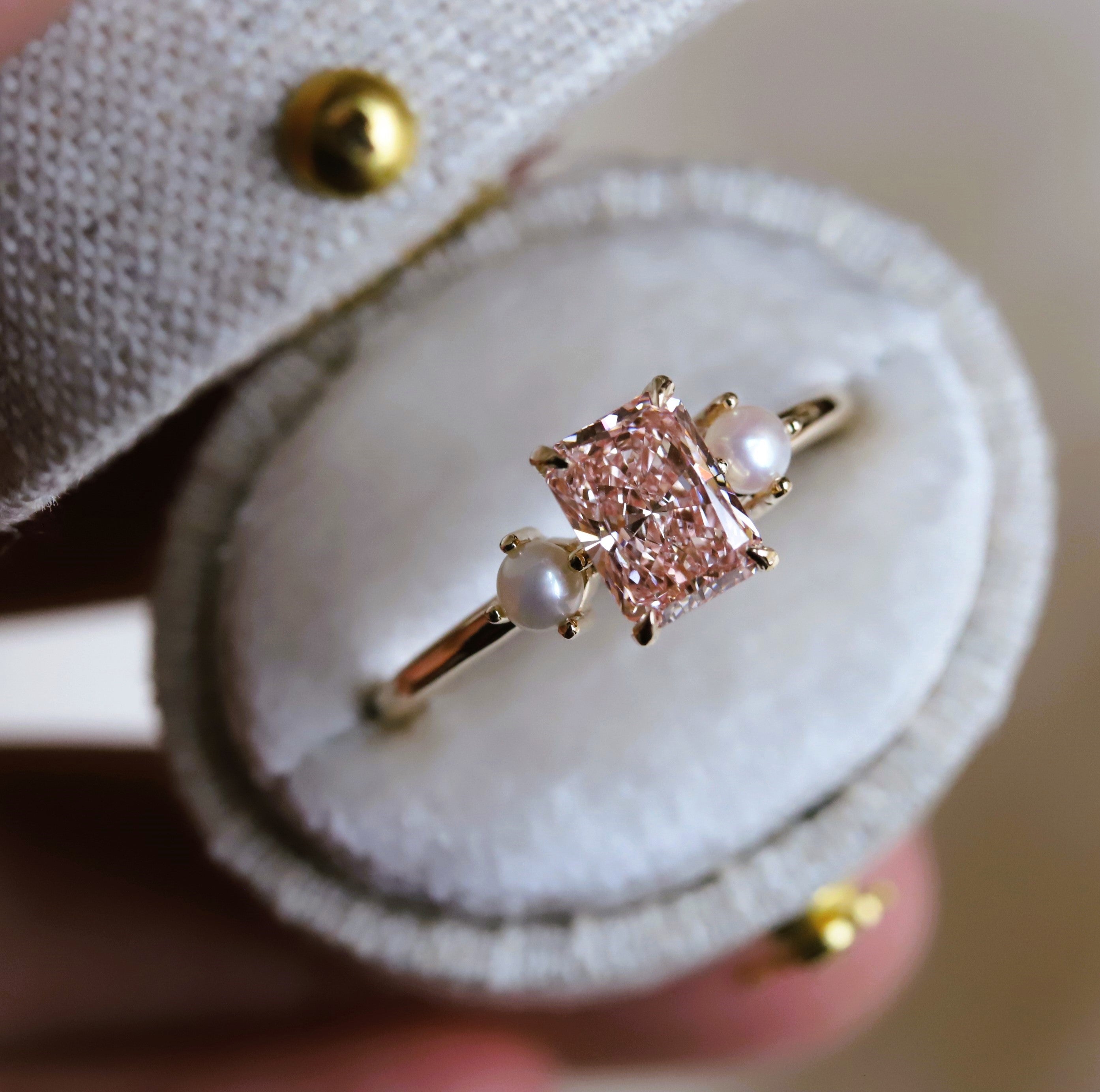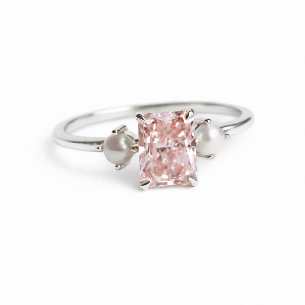 The EVA ring features a 1 ct. Radiant-cut lab-grown pink diamond that radiates gentle elegance and romantic allure. Pearl side stones beautifully accent its delicate design, each secured with a sturdy 4-prong setting for lasting durability. This unique piece combines refined craftsmanship with timeless femininity, making it an ideal choice for celebrating life’s most special moments.