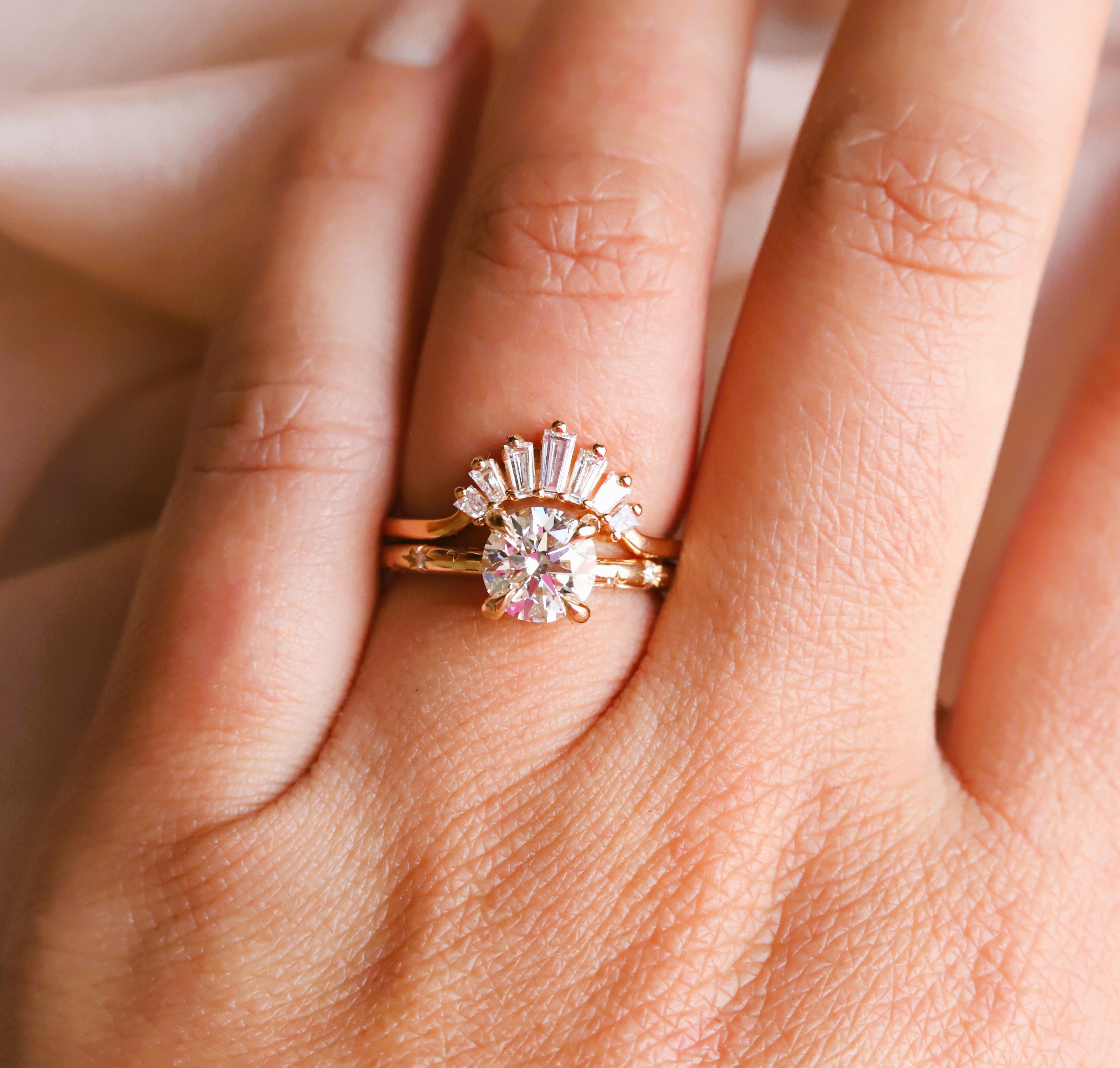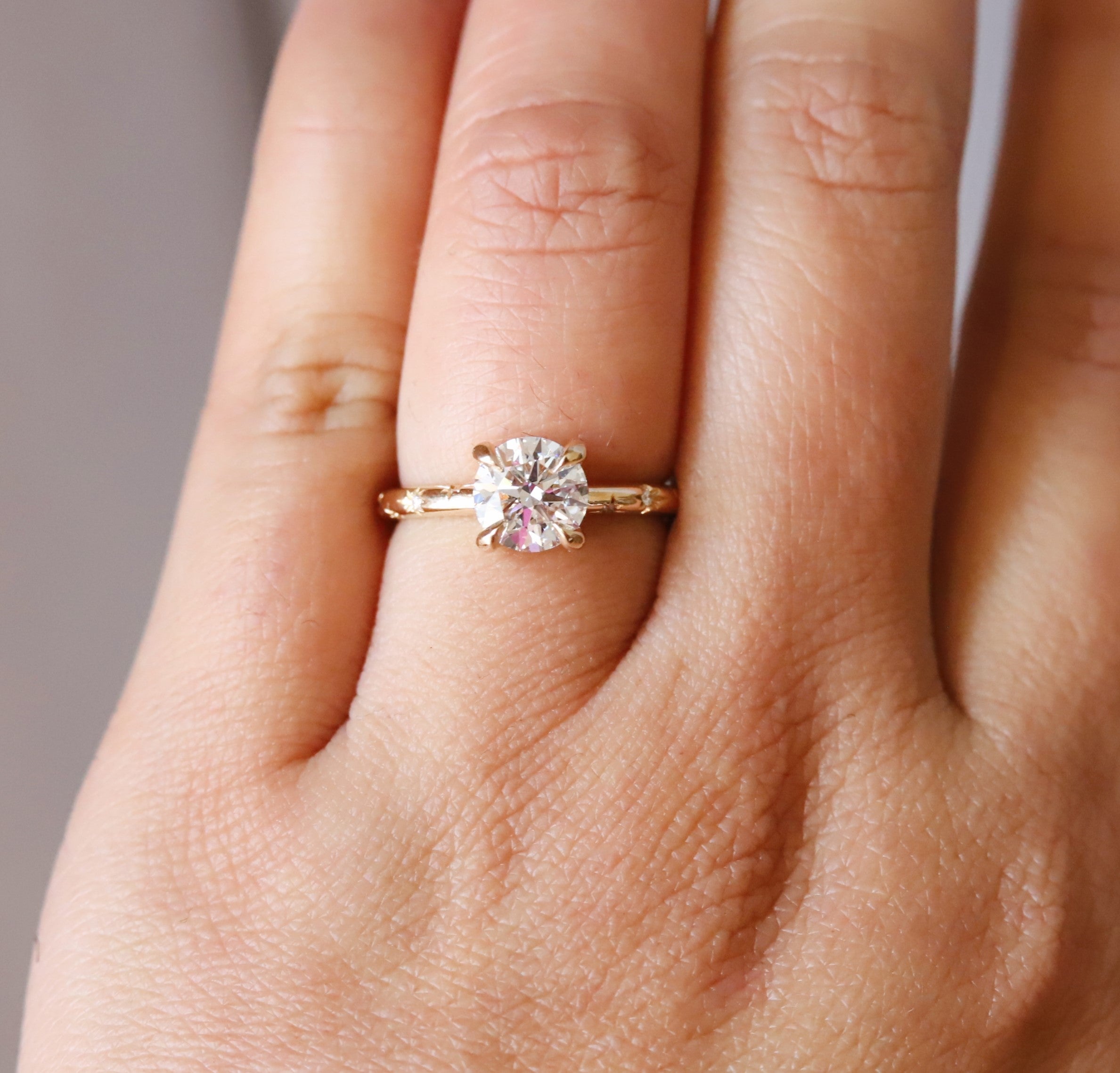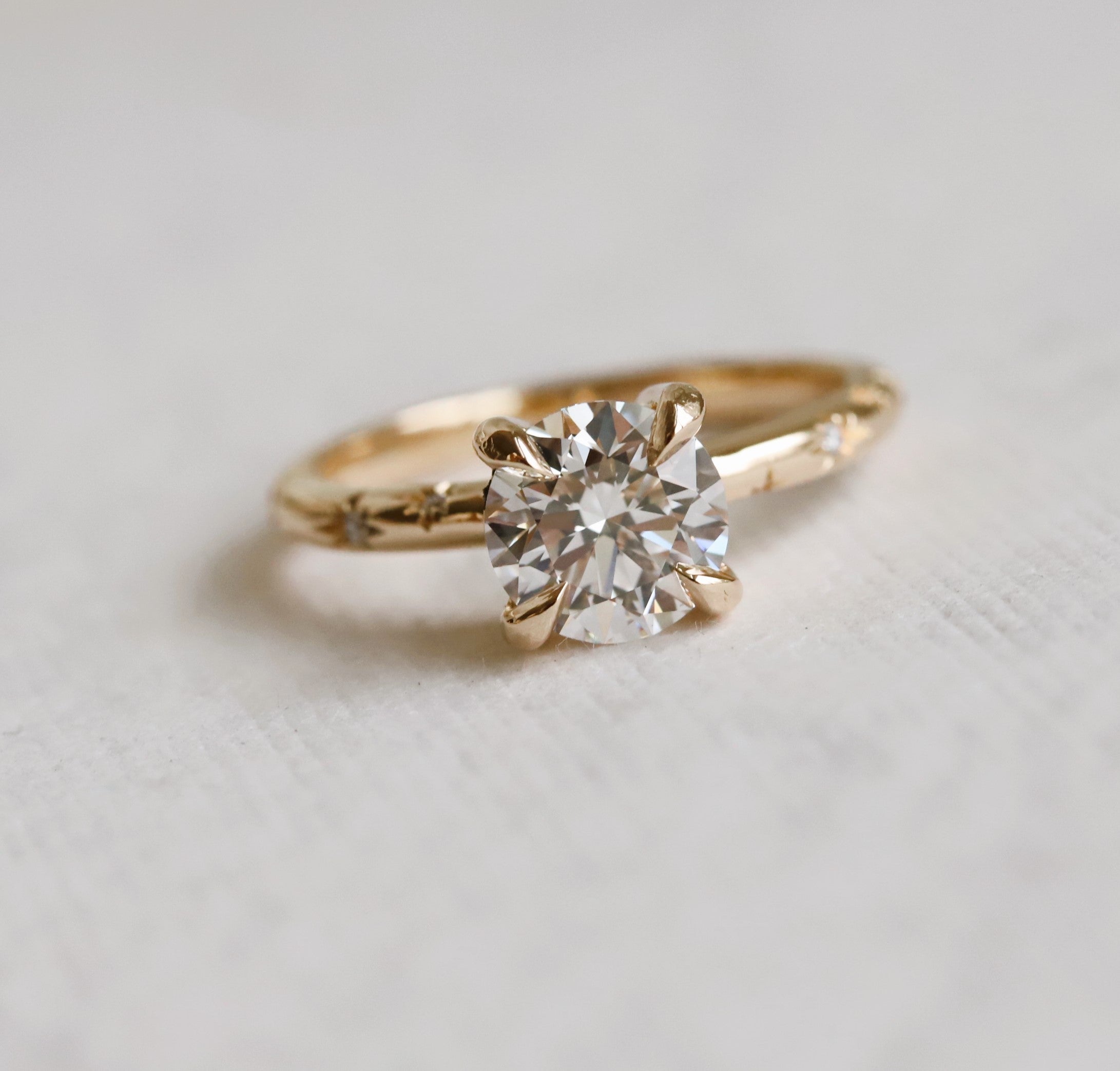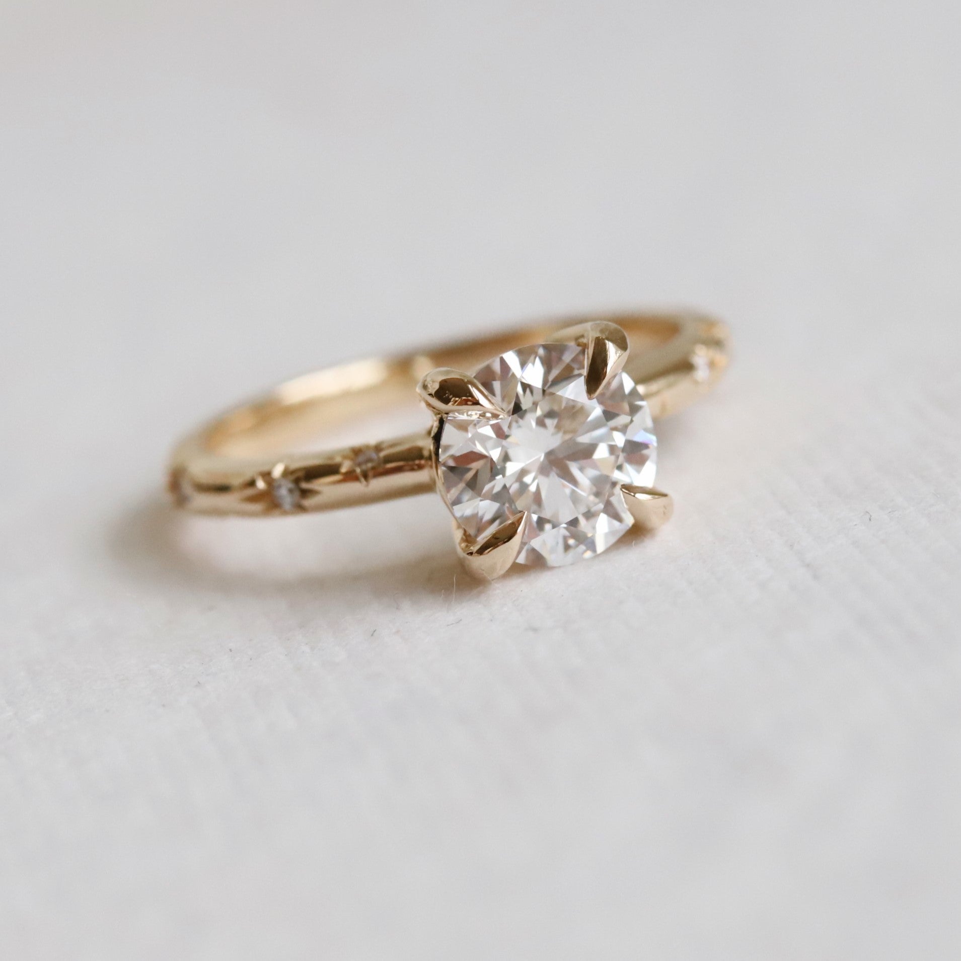 This stunning Stella round Starburst Ring is crafted with a classic four-prong setting and features a brilliant round center stone of your choice, a lab-grown diamond or lab-created moissanite, complemented by a unique starburst pattern on the band. Crafted with precision and care, this classic yet modern design makes it a unique engagement ring and an ideal gift for any occasion.