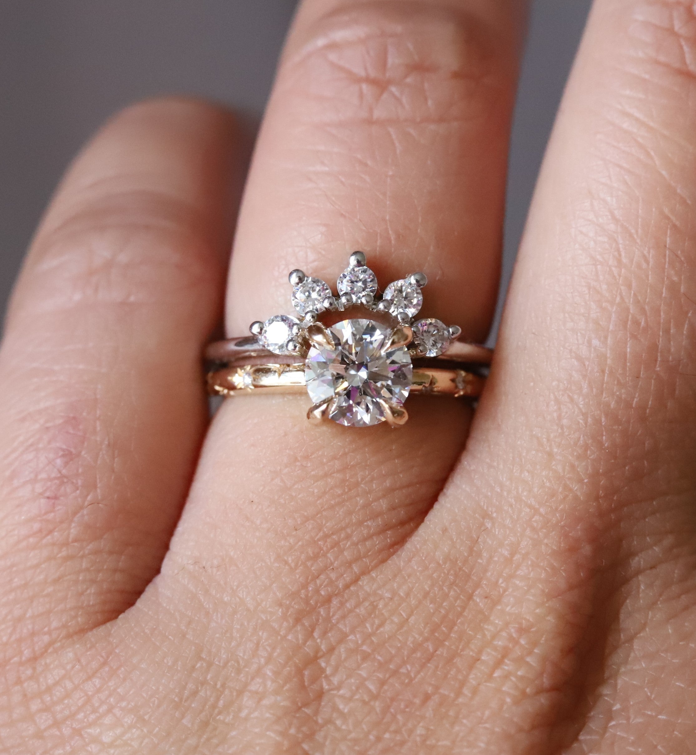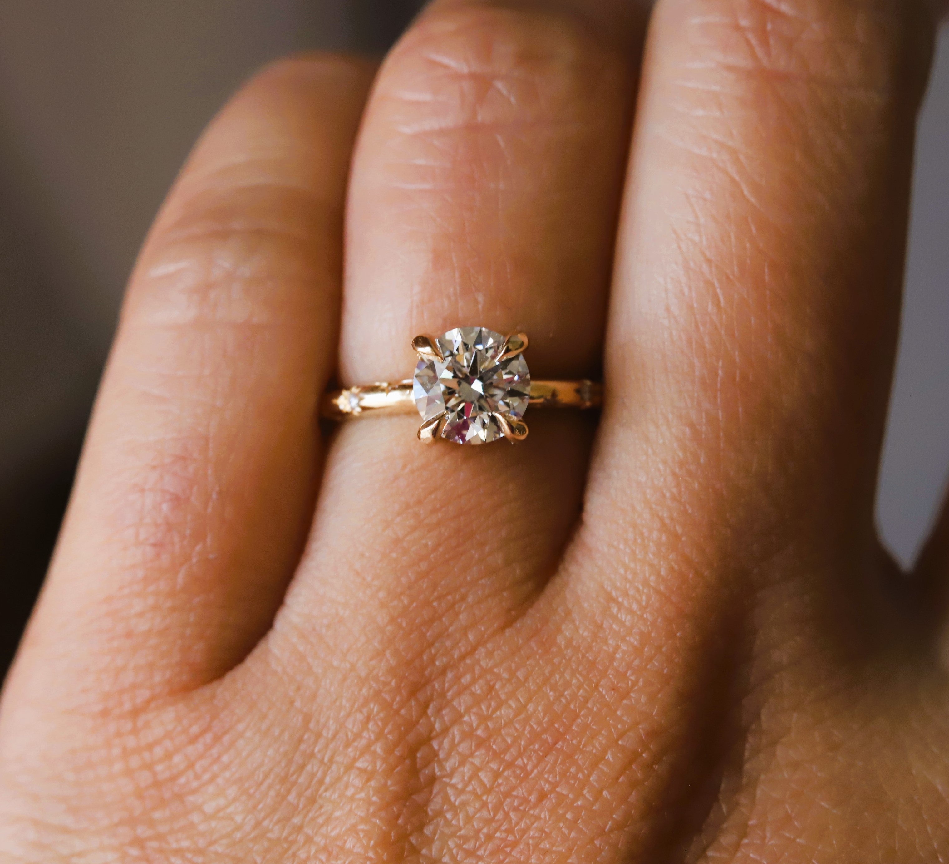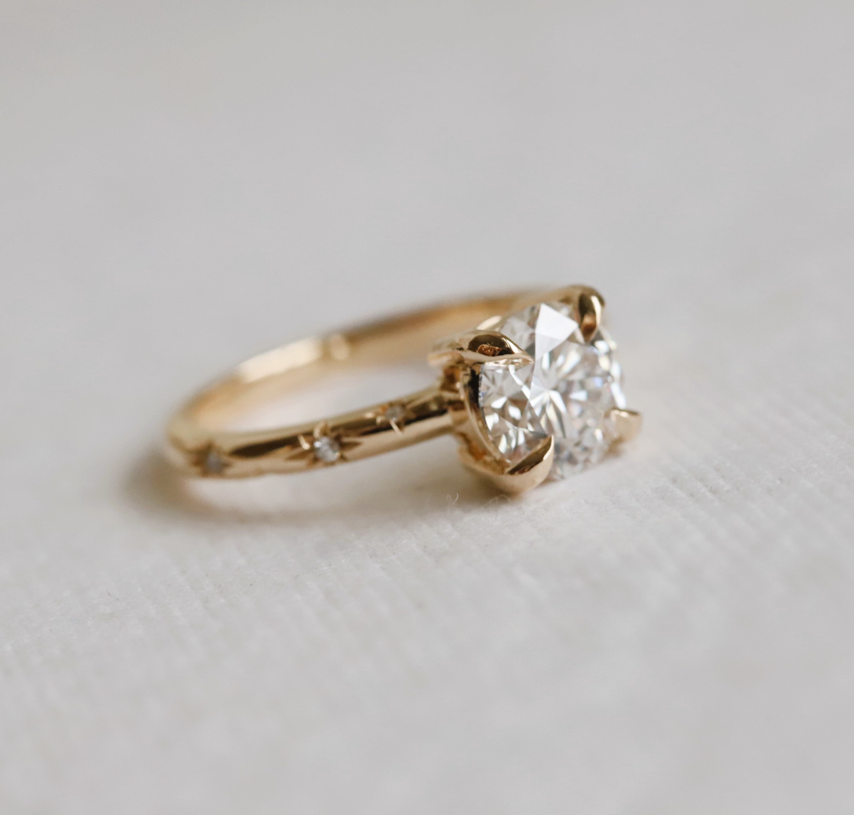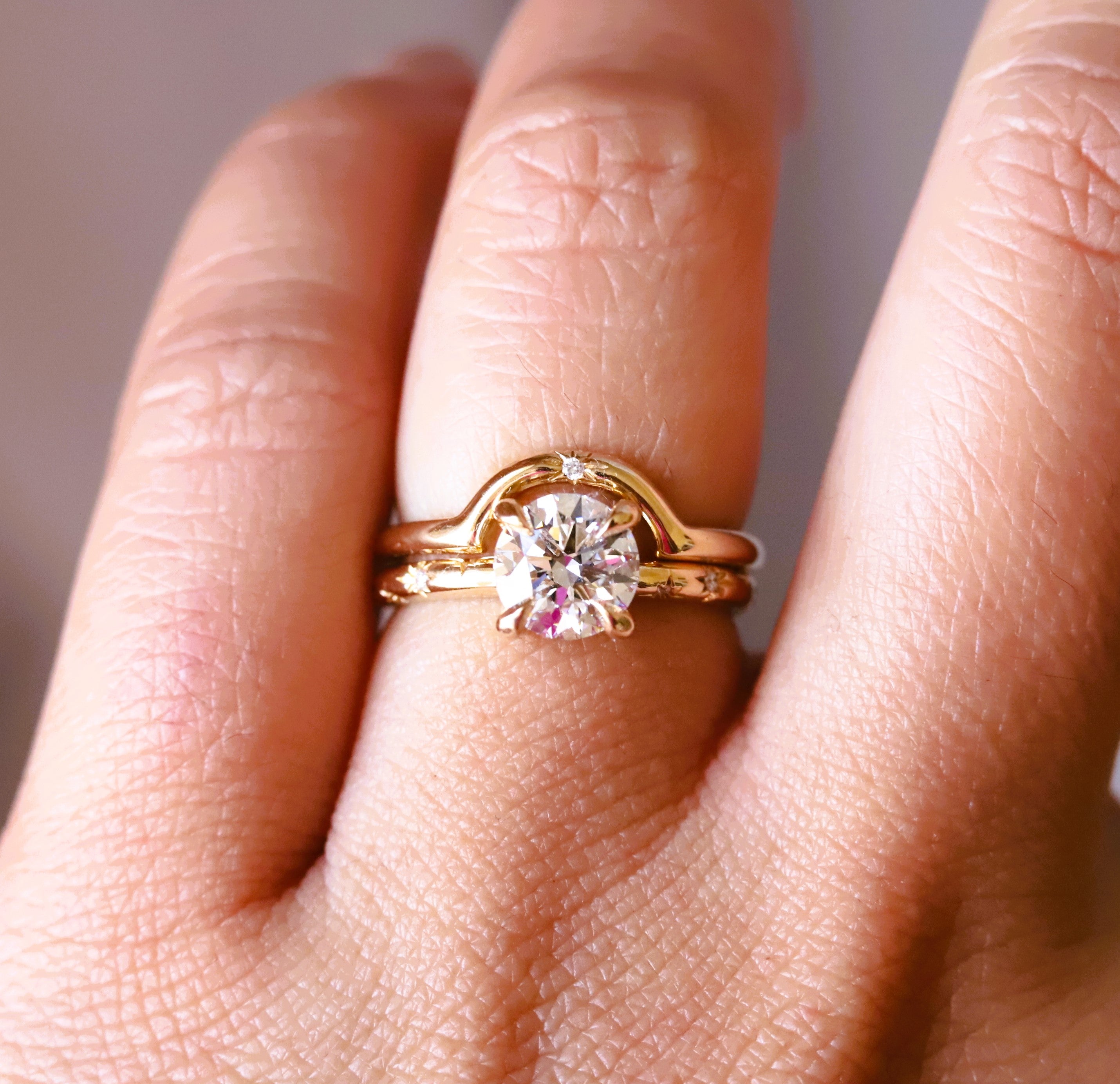 This stunning Stella round Starburst Ring is crafted with a classic four-prong setting and features a brilliant round center stone of your choice, a lab-grown diamond or lab-created moissanite, complemented by a unique starburst pattern on the band. Crafted with precision and care, this classic yet modern design makes it a unique engagement ring and an ideal gift for any occasion.