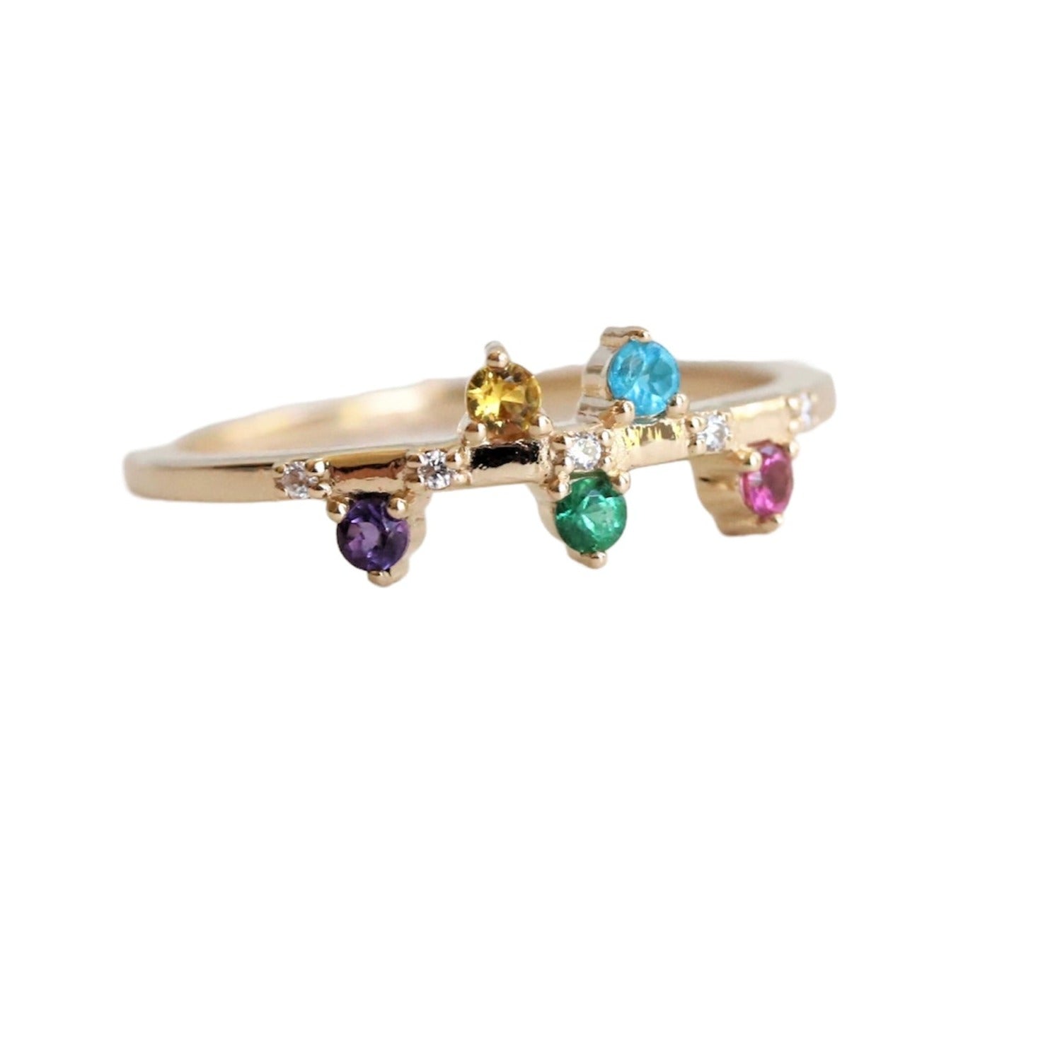 This band is one of our designs in the JOY collection. It features a 5-stone variation; Pink Sapphire, Yellow Sapphire, Emerald, Blue Zircon, and Amethyst. A fun and playful stack, it is perfect for a birthstone and family ring.