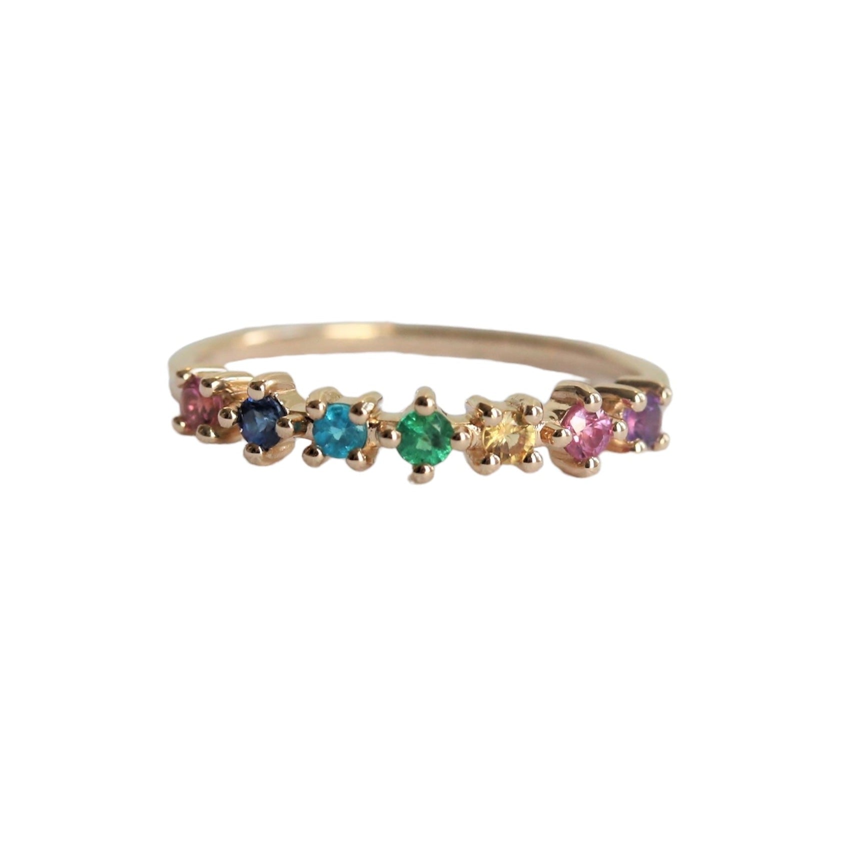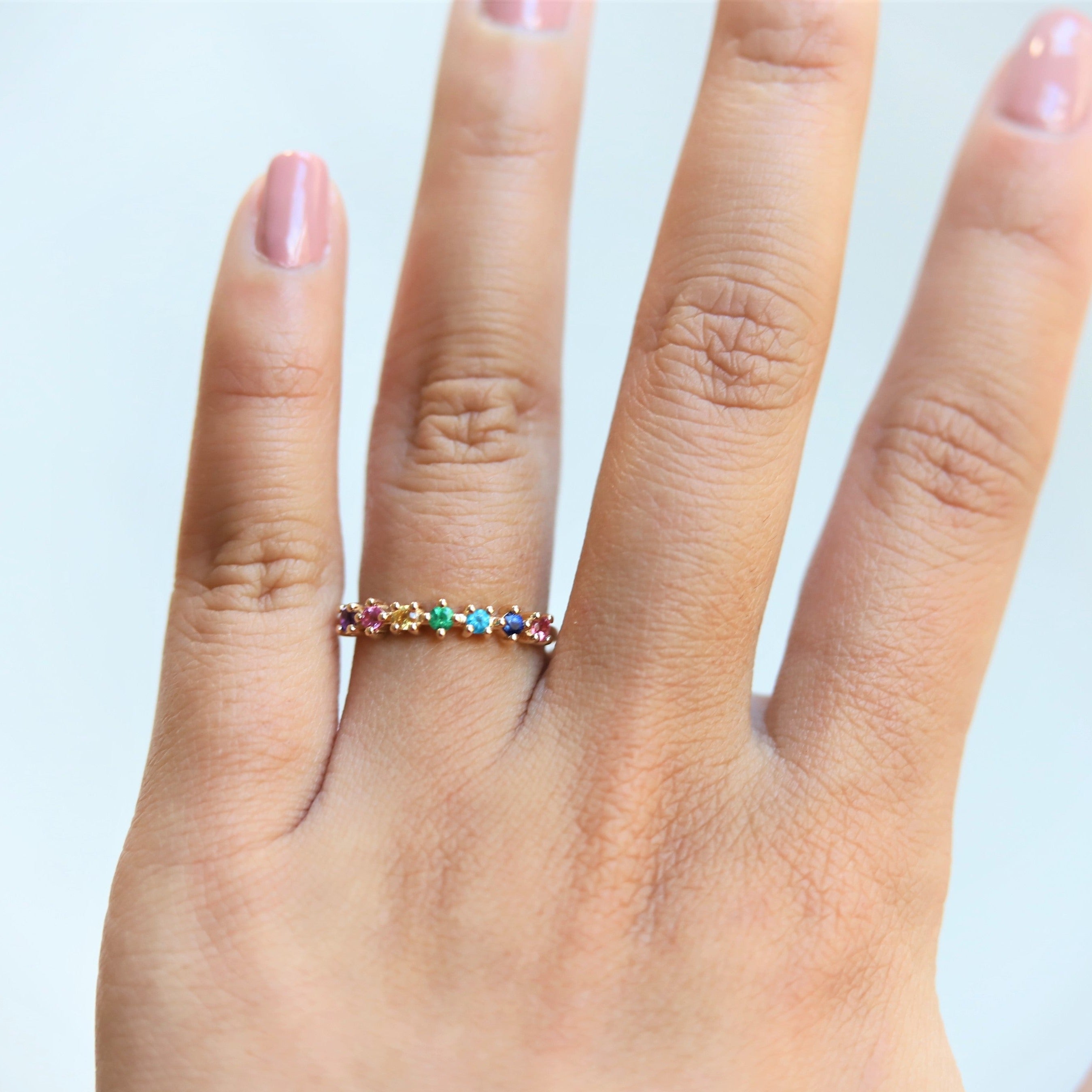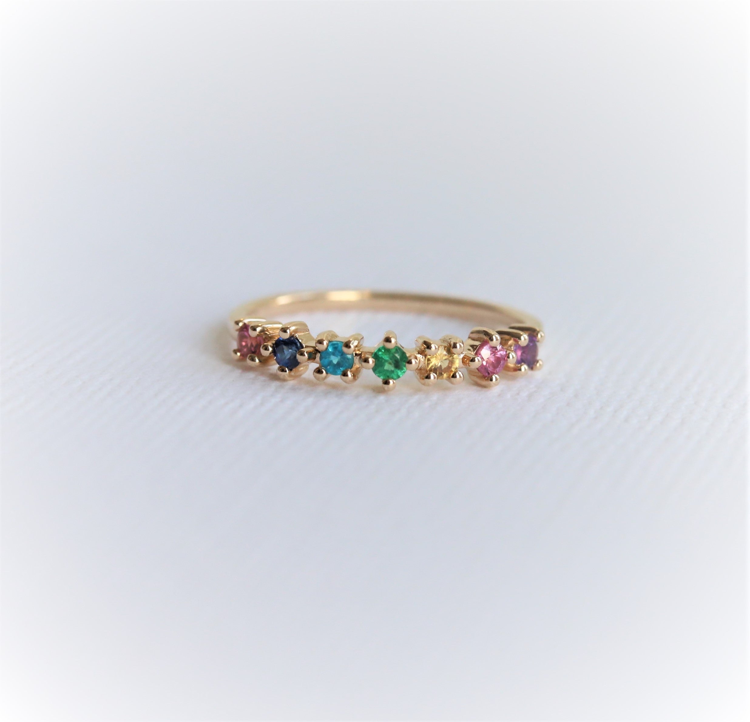This band is one of our designs in the JOY collection. It is perfect for birthstone rings or a milestone wedding band that features a 7-stone variation; Blue Sapphire, Pink Sapphire, Yellow Sapphire, Emerald, Blue Zircon, Pink Tourmaline, and Amethyst. A fun and playful stack, this ring can be paired with an engagement ring, and easily worn by itself.