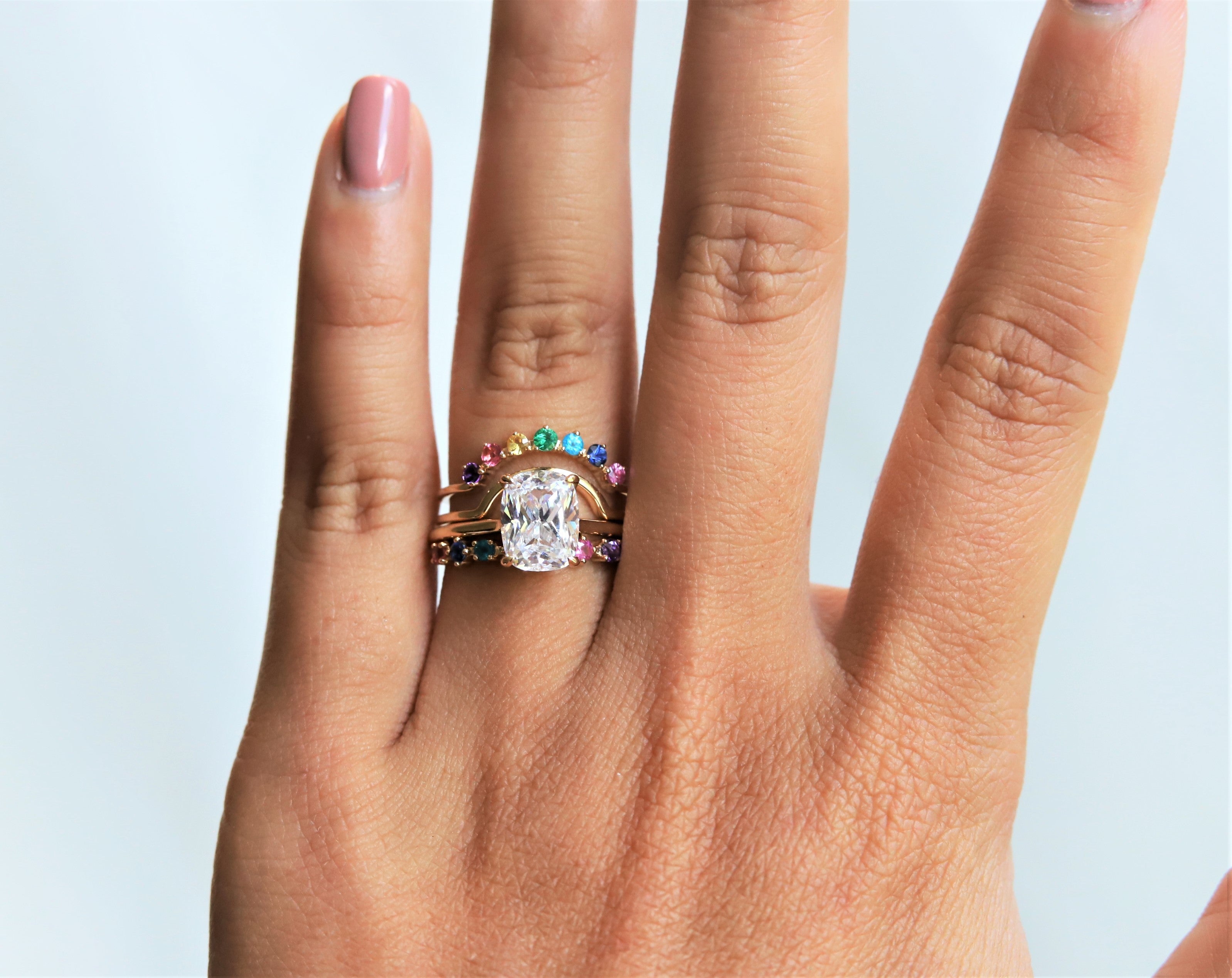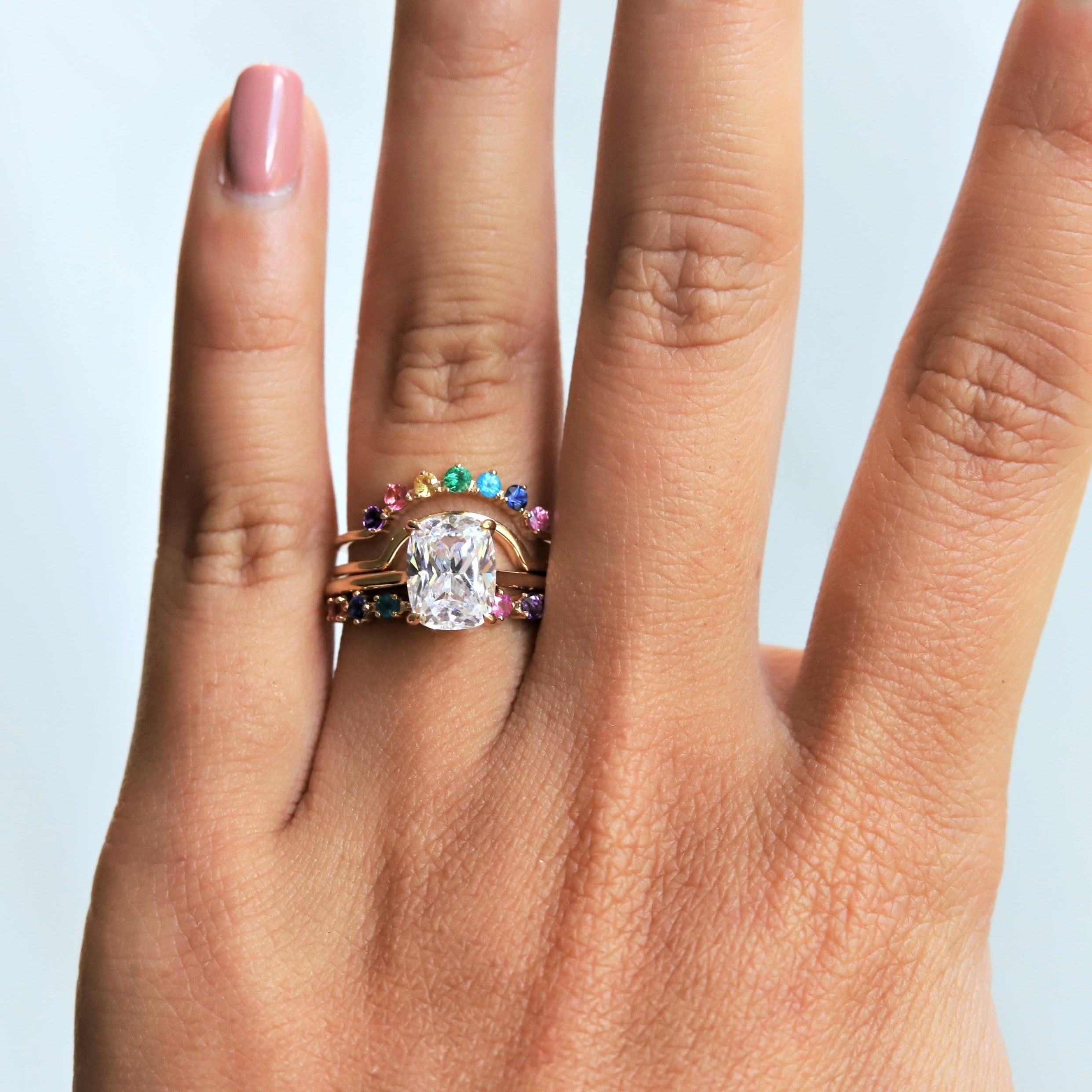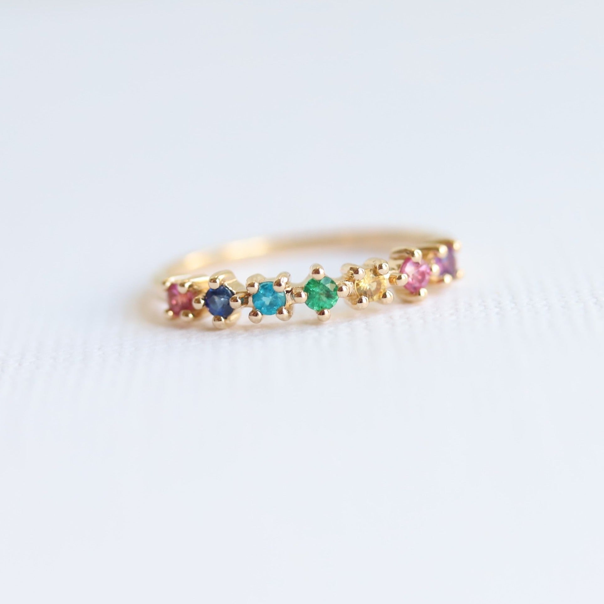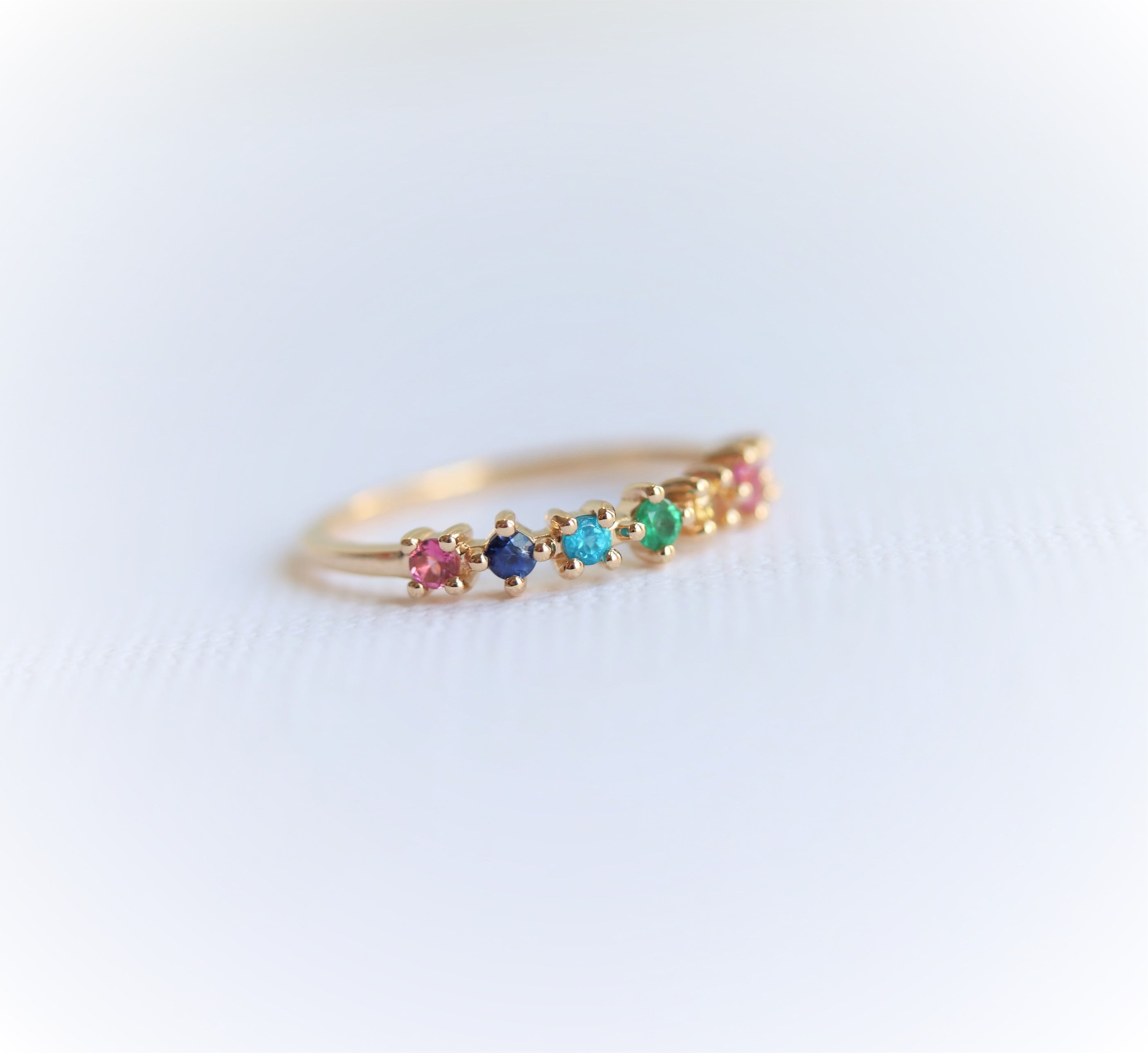 This band is one of our designs in the JOY collection. It is perfect for birthstone rings or a milestone wedding band that features a 7-stone variation; Blue Sapphire, Pink Sapphire, Yellow Sapphire, Emerald, Blue Zircon, Pink Tourmaline, and Amethyst. A fun and playful stack, this ring can be paired with an engagement ring, and easily worn by itself.