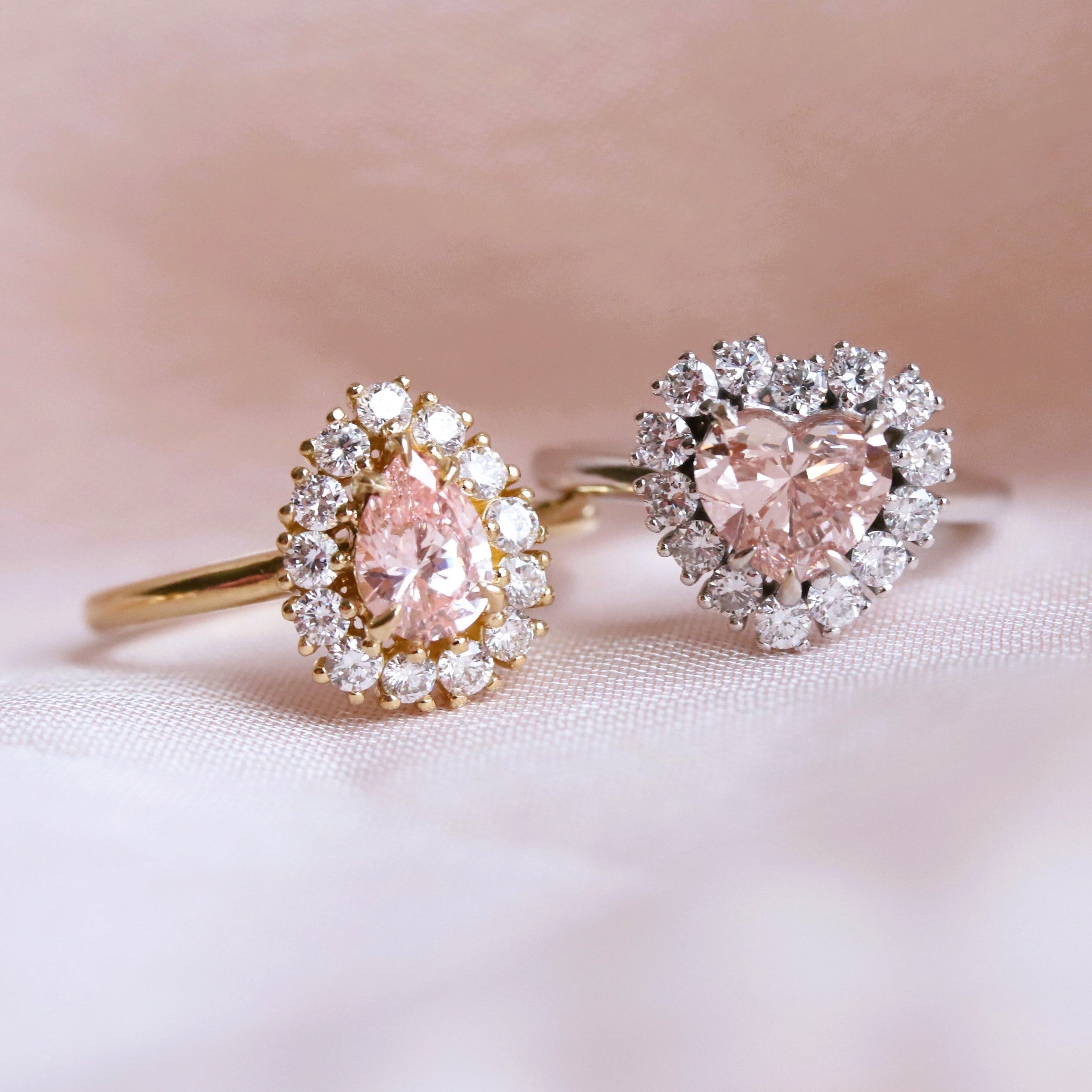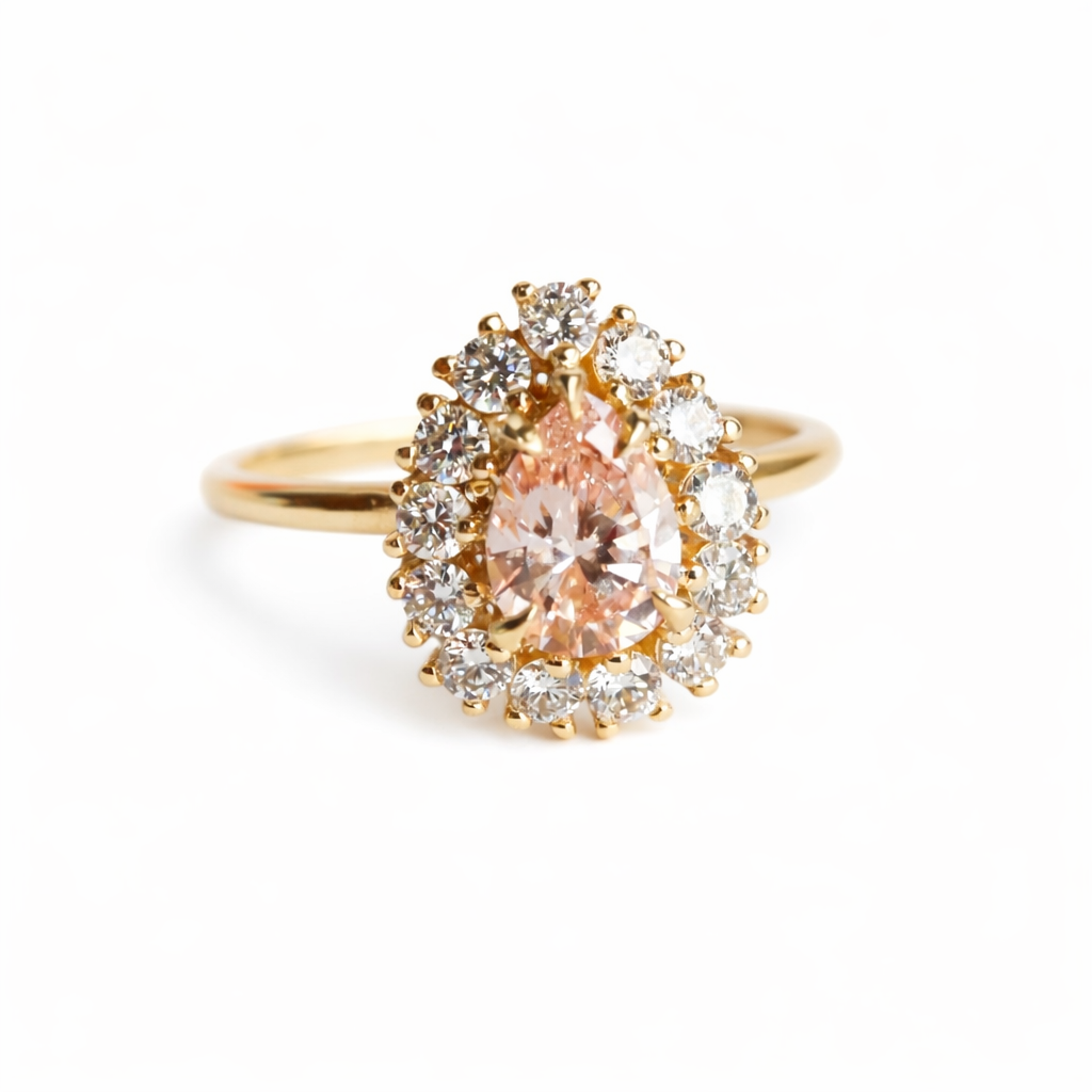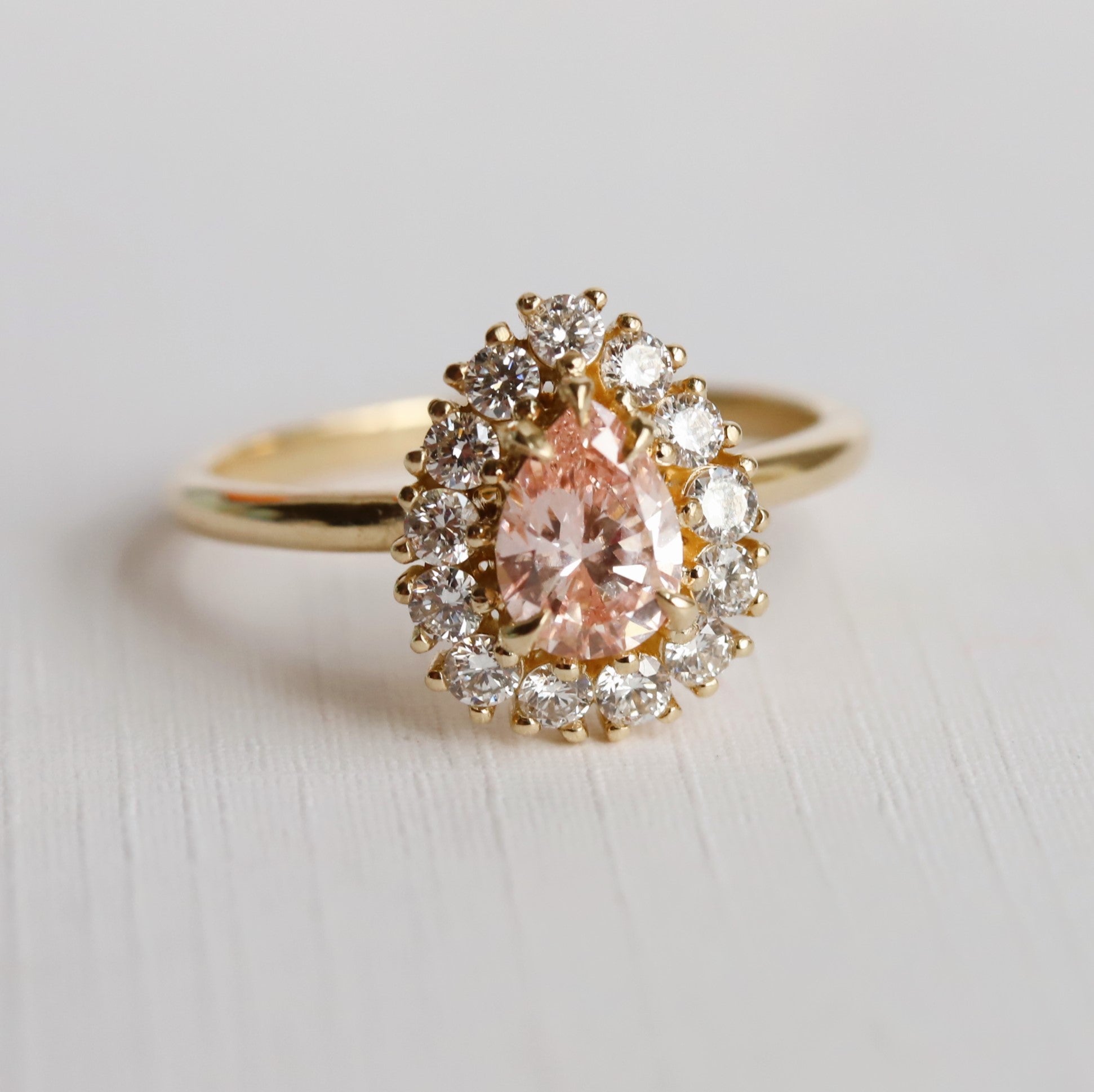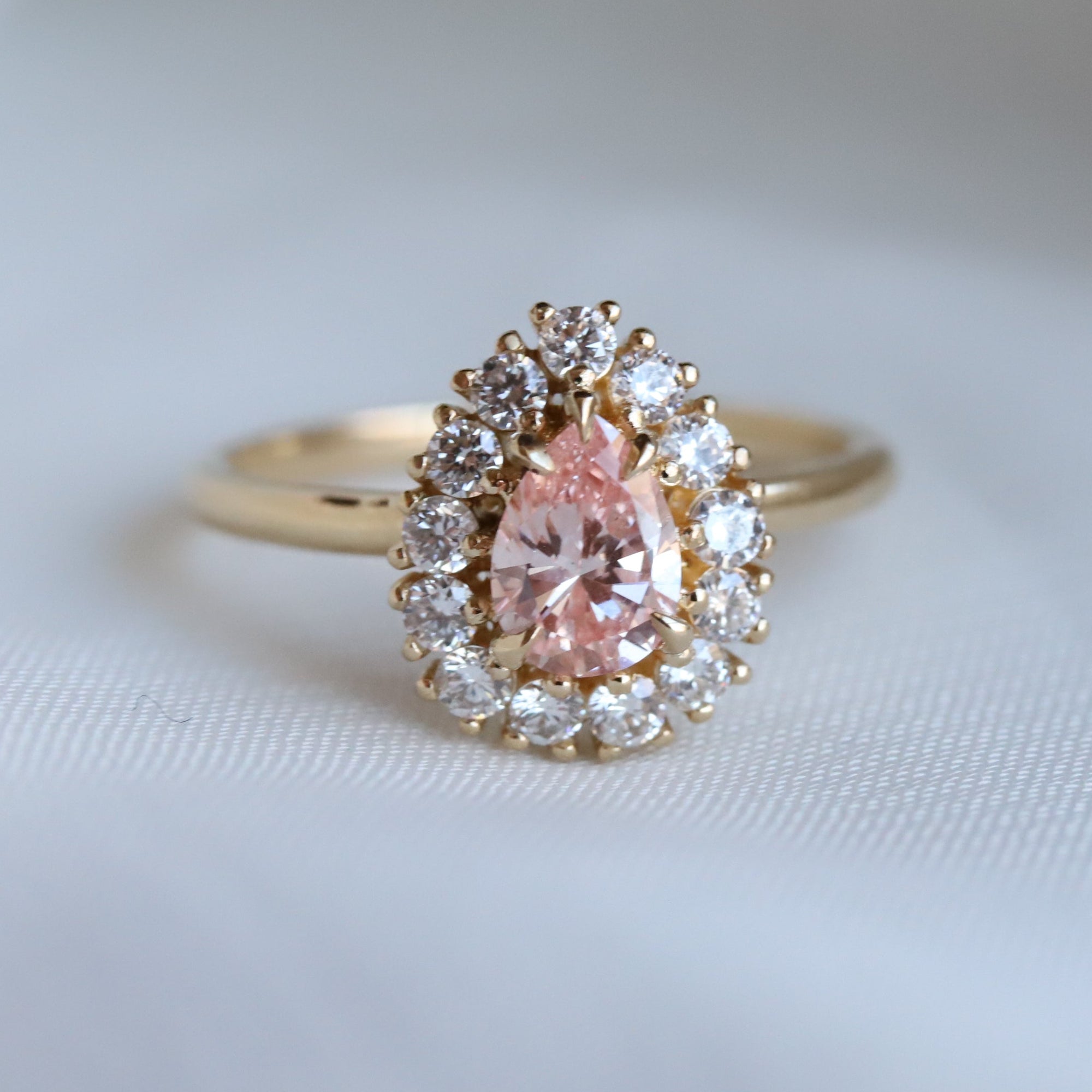 The Emma ring presents a lab-grown pink diamond in an elegant pear cut, complemented by a sparkling diamond halo with secure three-prong settings. This sophisticated design combines the romantic warmth of pink with exceptional durability and easy care—surpassing traditional morganite in both longevity and maintenance. The elevated cathedral-style setting makes a bold statement while remaining versatile enough to pair seamlessly with your chosen wedding band.