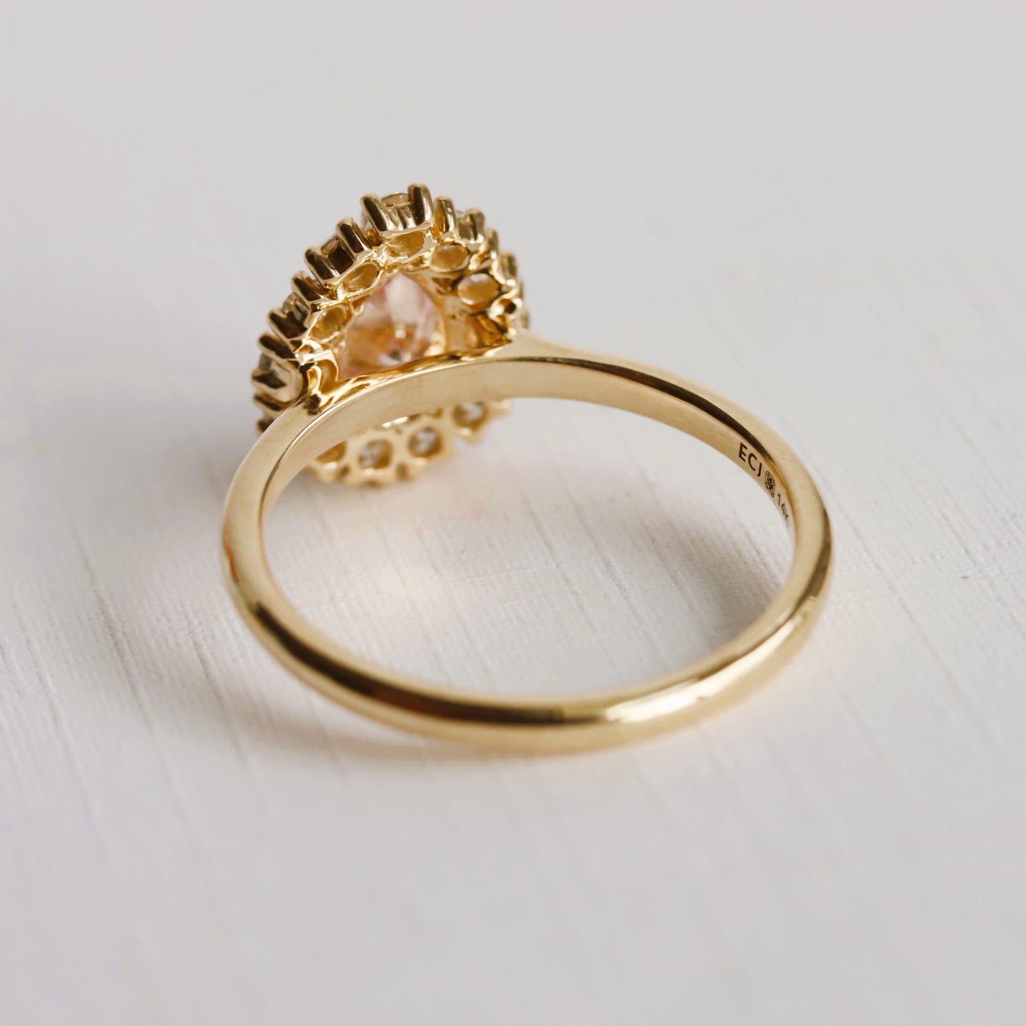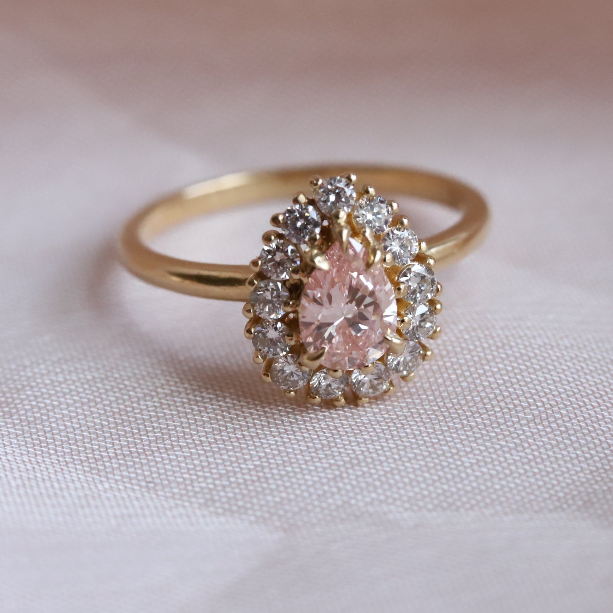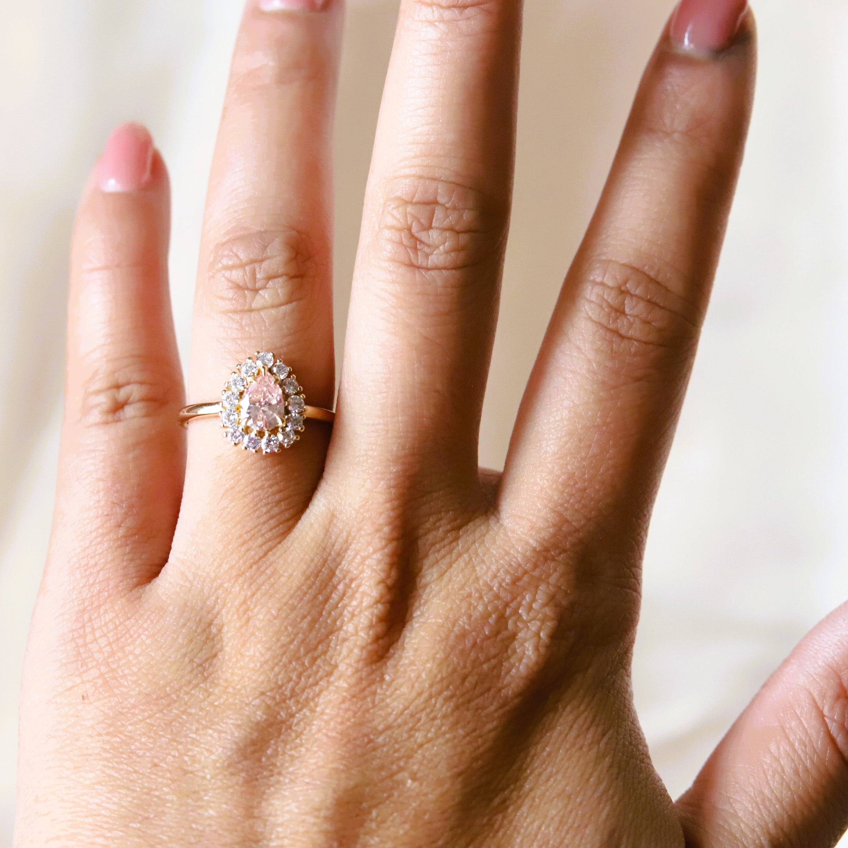 The Emma ring presents a lab-grown pink diamond in an elegant pear cut, complemented by a sparkling diamond halo with secure three-prong settings. This sophisticated design combines the romantic warmth of pink with exceptional durability and easy care—surpassing traditional morganite in both longevity and maintenance. The elevated cathedral-style setting makes a bold statement while remaining versatile enough to pair seamlessly with your chosen wedding band.