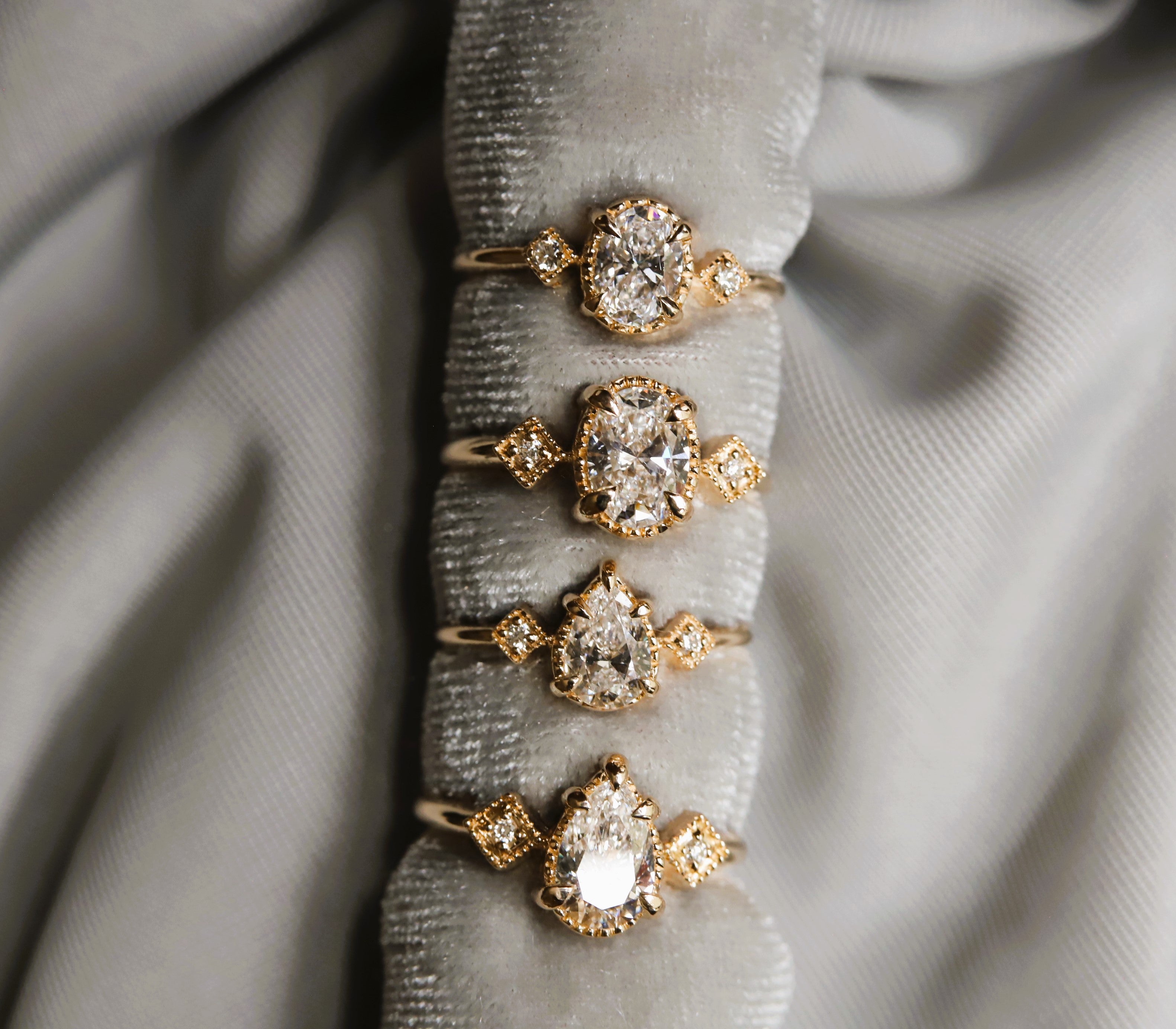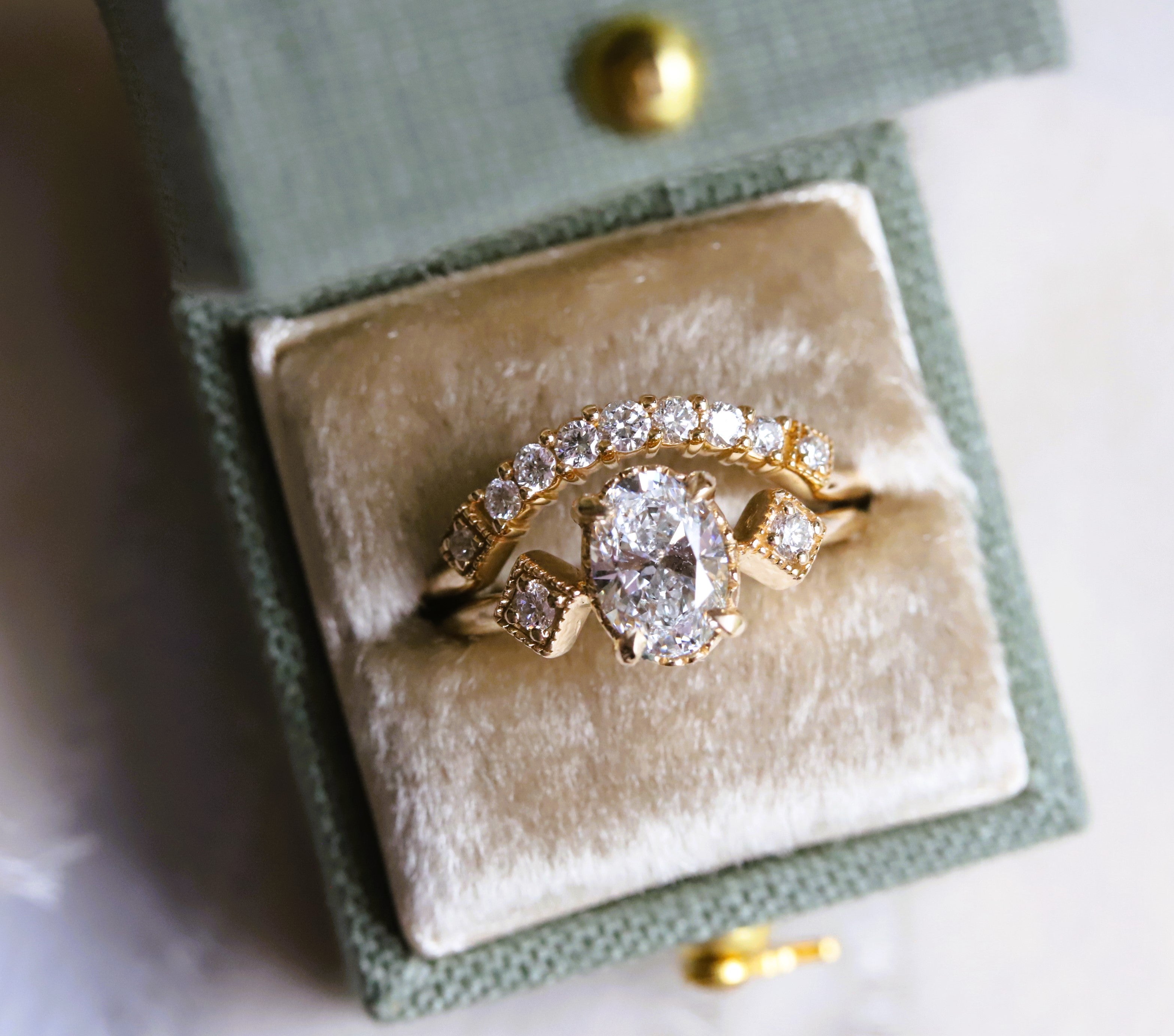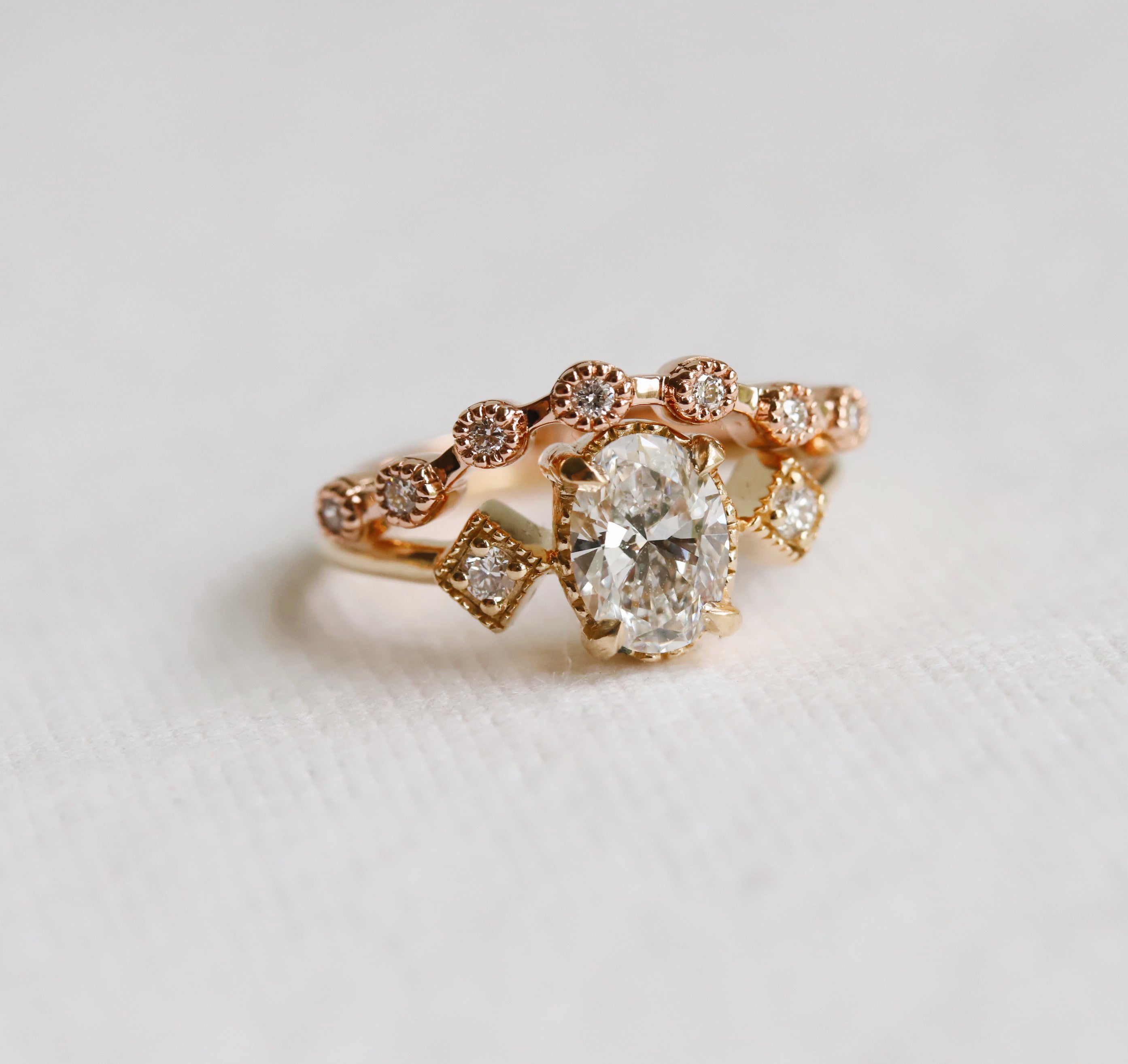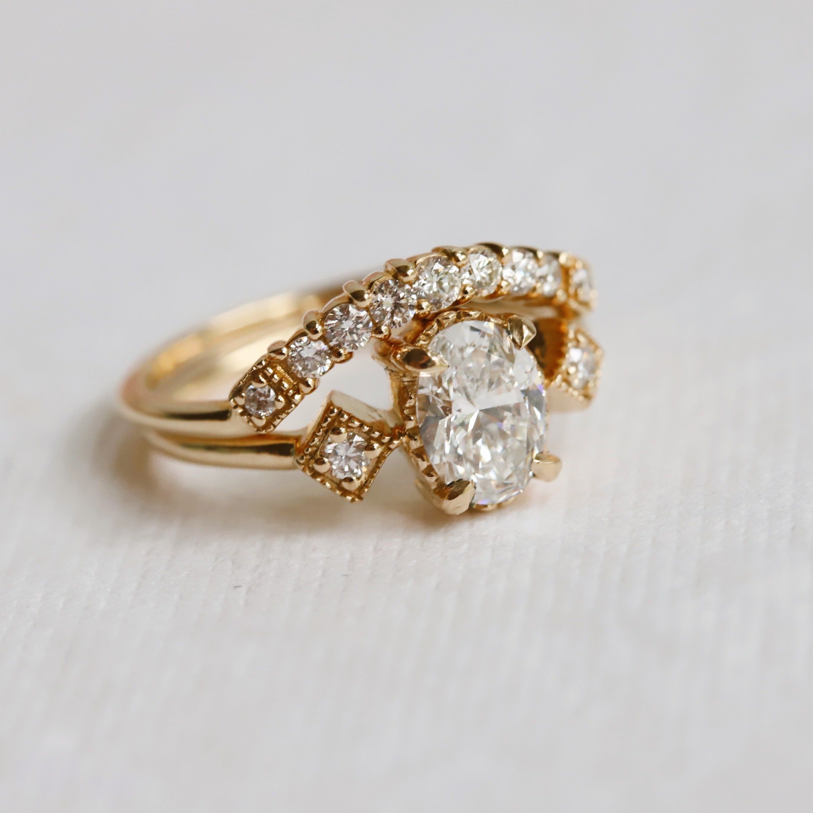 • Style: Vintage-inspired, low profile with side stone and milgrain detail.