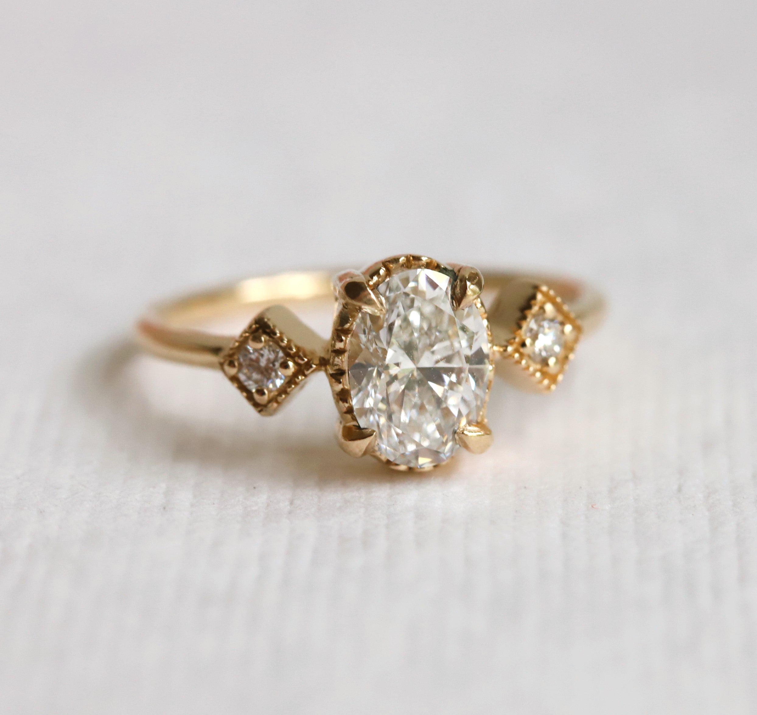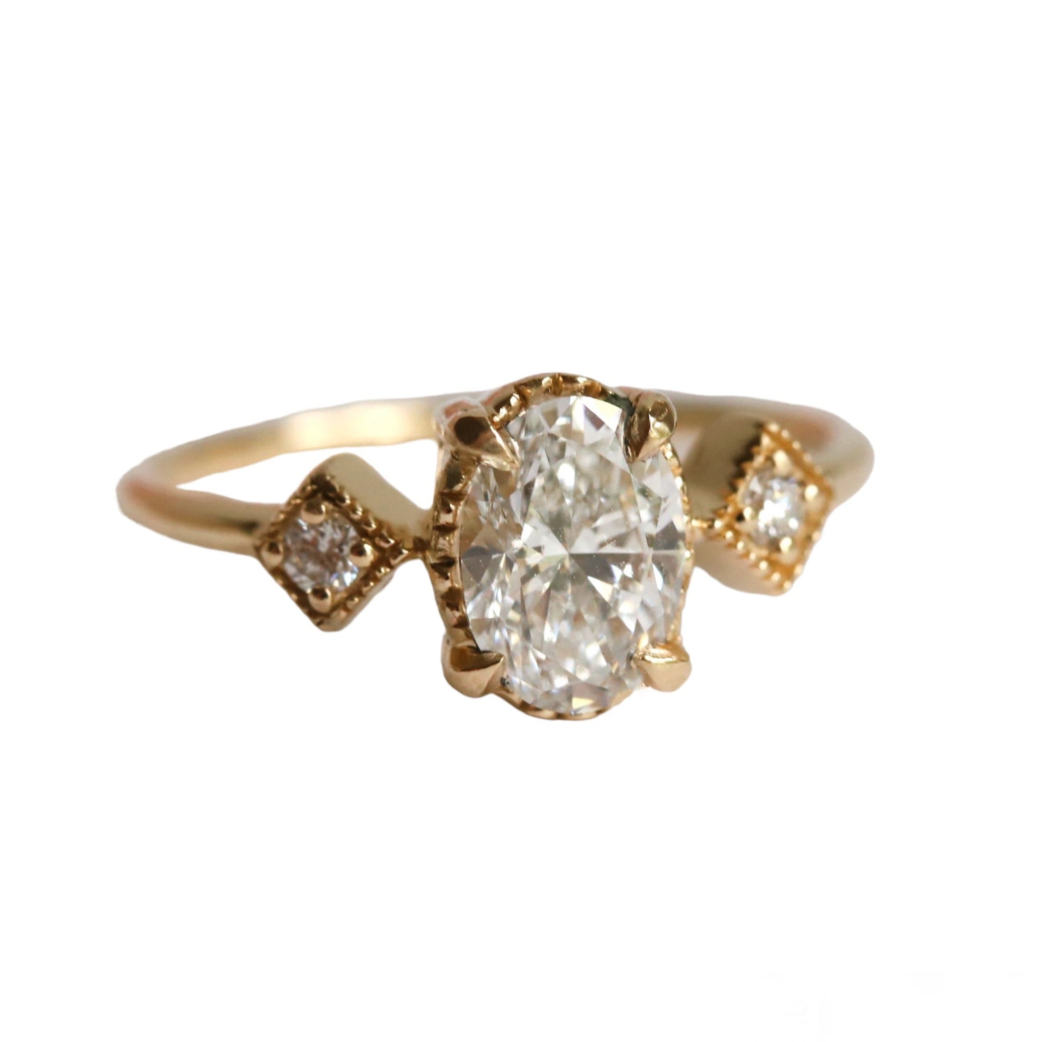 Crafted with vintage elegance in mind, this exquisite ring showcases an oval-cut stone in a low-profile setting secured by classic four prongs. The sides feature sparkling diamond accents arranged in square-shaped designs with intricately carved milgrain beads, all resting atop a slim band. Perfect for engagement or any special occasion, this expertly handcrafted ring will surely be cherished for years to come.