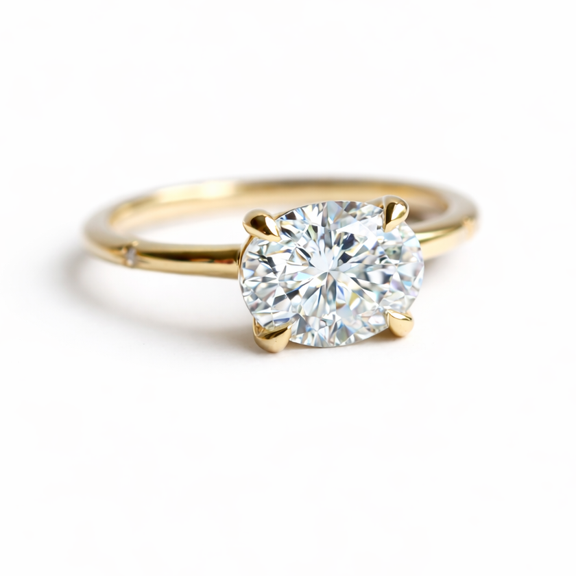 The Stella Ring presents a 1.5-carat oval stone in an east-west four-prong setting, complemented by star engravings and hidden diamonds along the band. Choose between natural, lab-grown diamond, or moissanite for your center stone, with multiple metal options available. A refined piece that balances classic elegance with distinctive character.