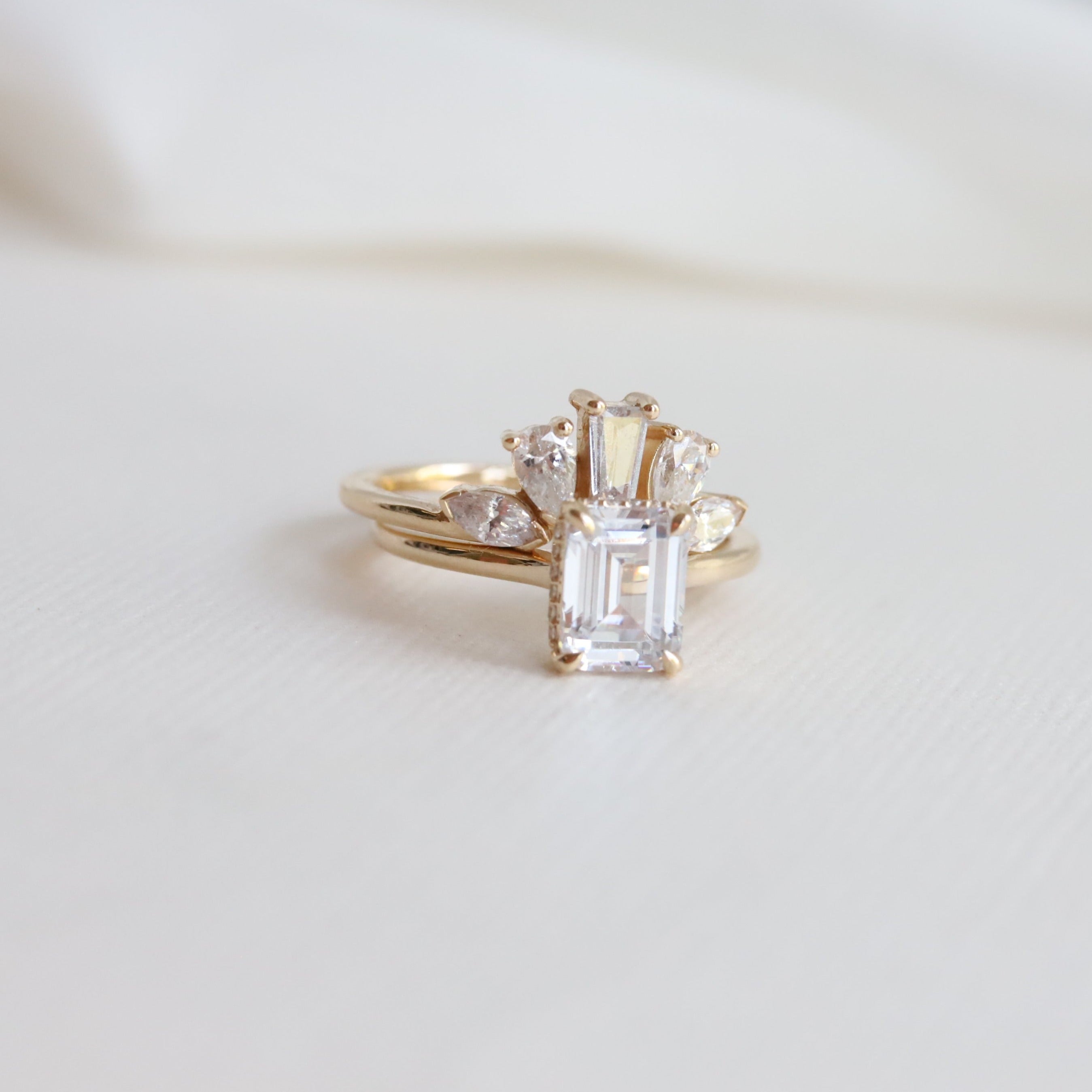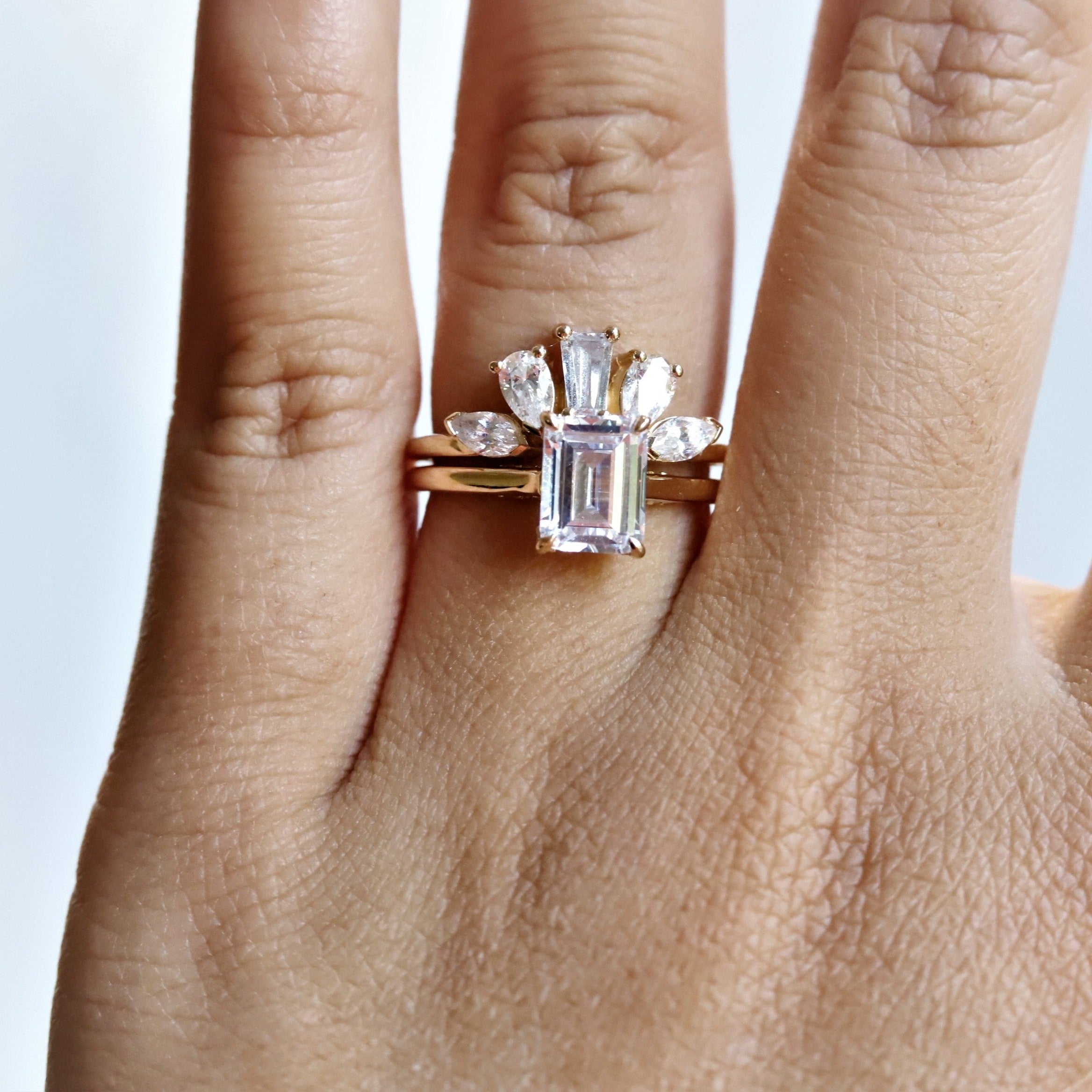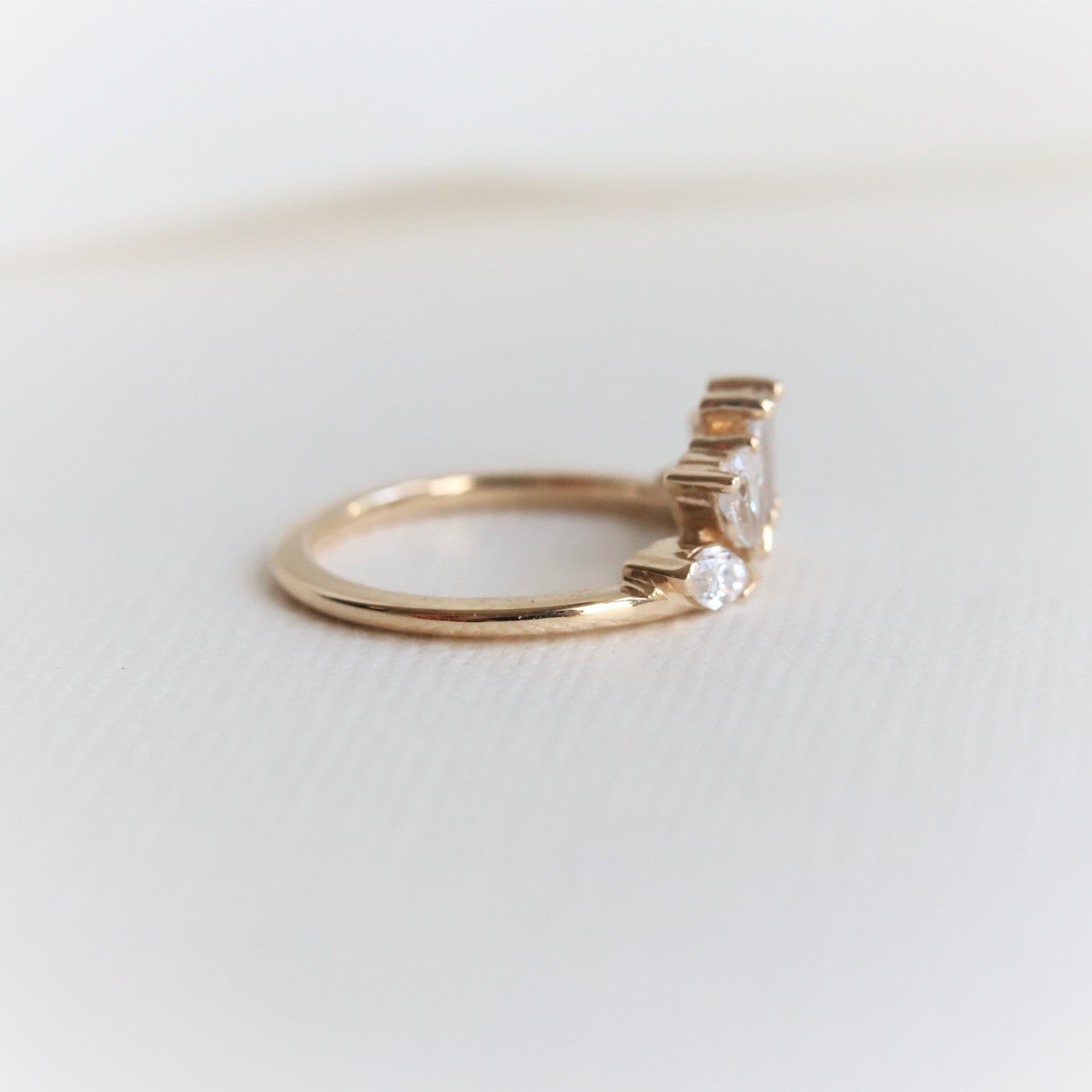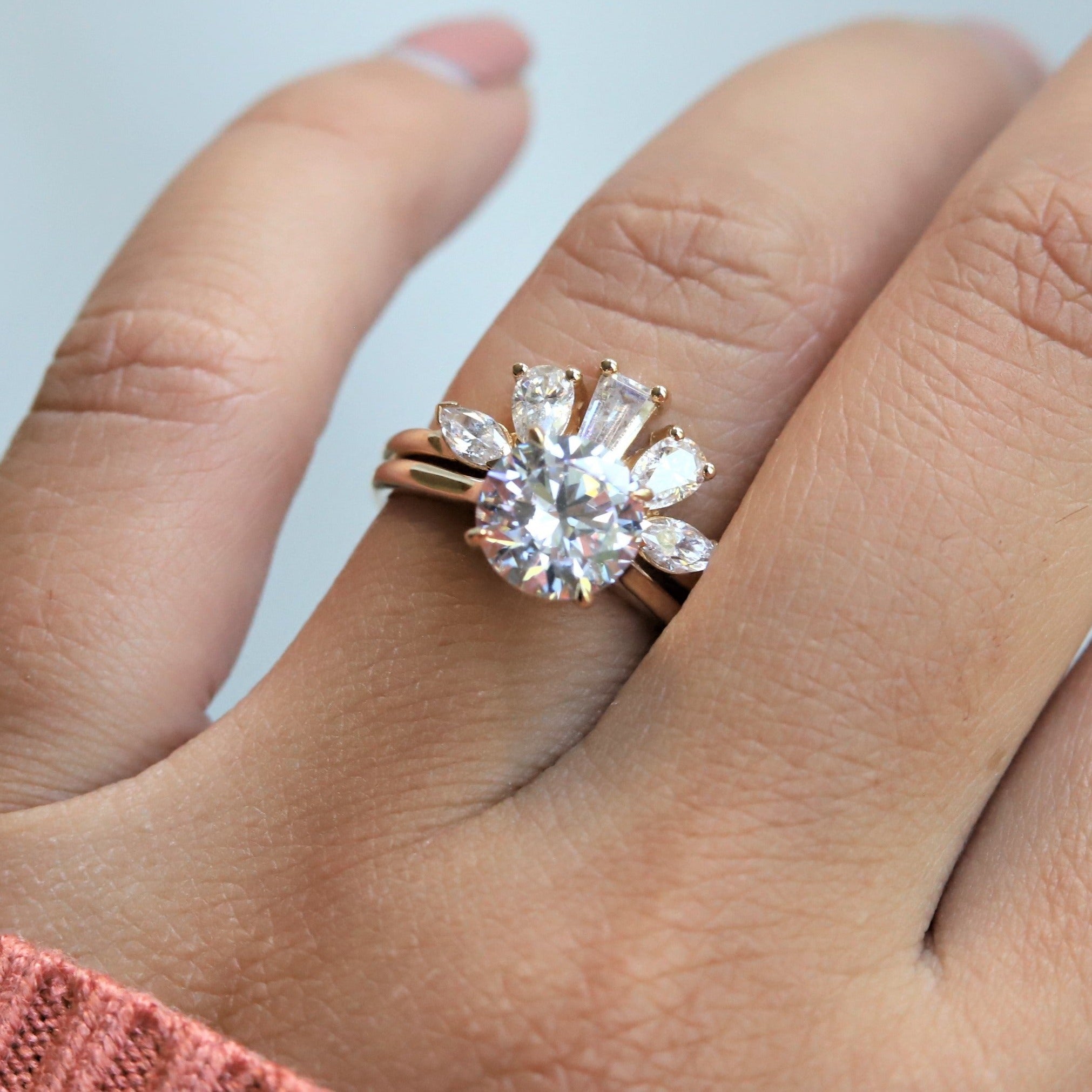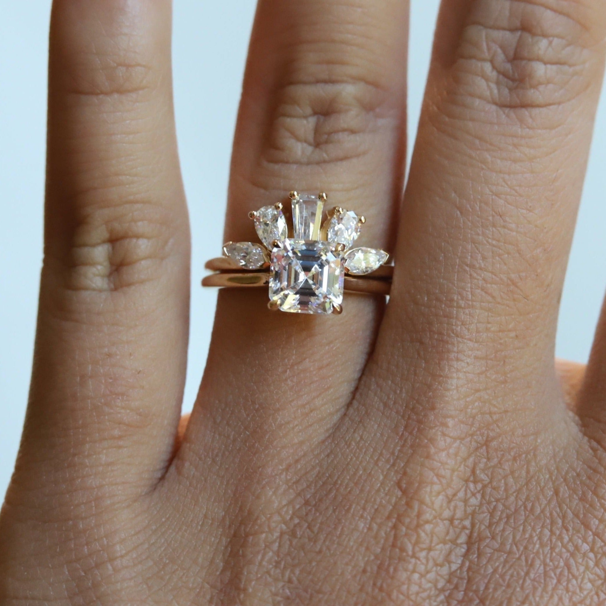 A statement contour band features pear, marquise, and tapered baguette shape stones. Pair it perfectly with a high-profile 1.5 ct+ engagement ring or our WYN Classic and Hidden Halo solitaire engagement rings.