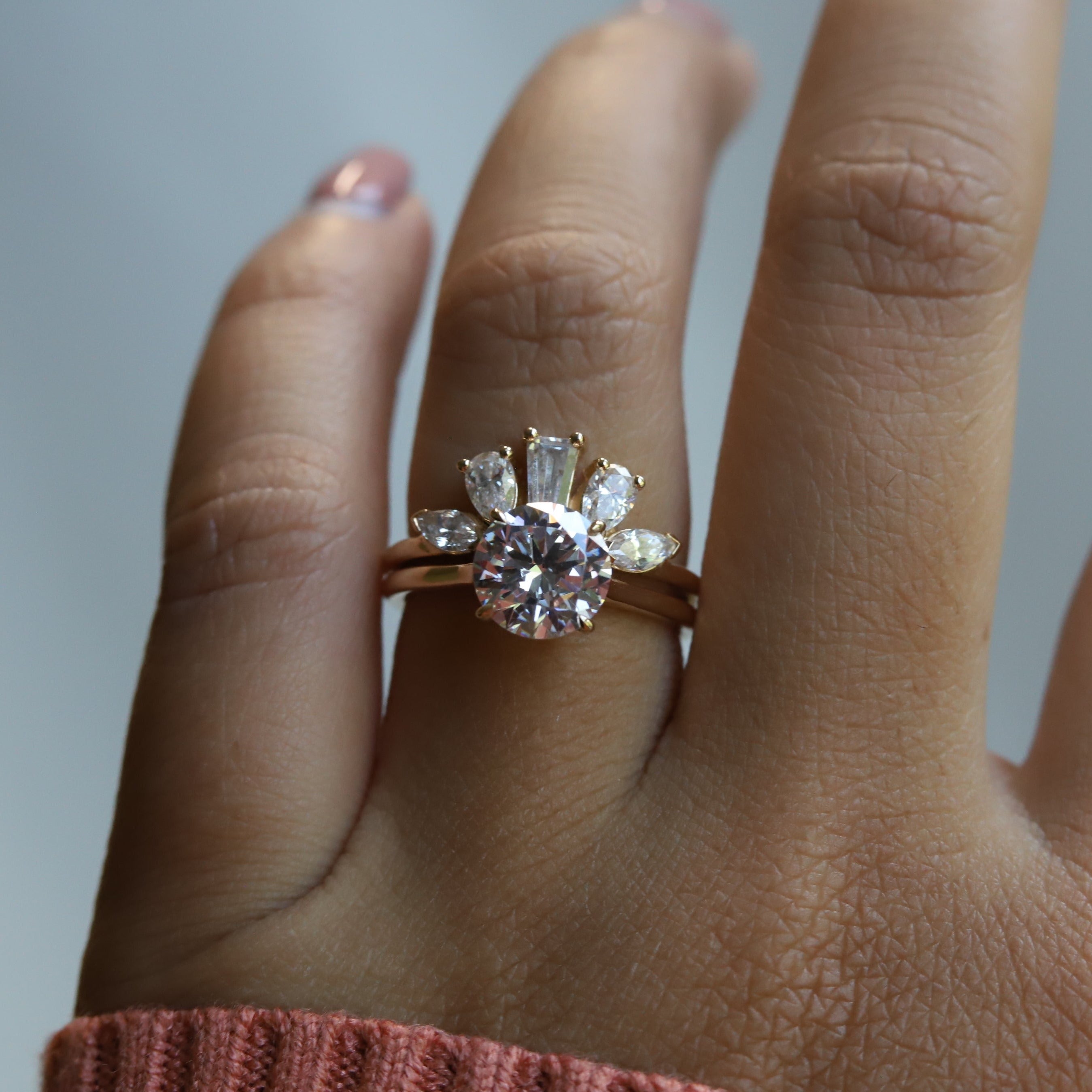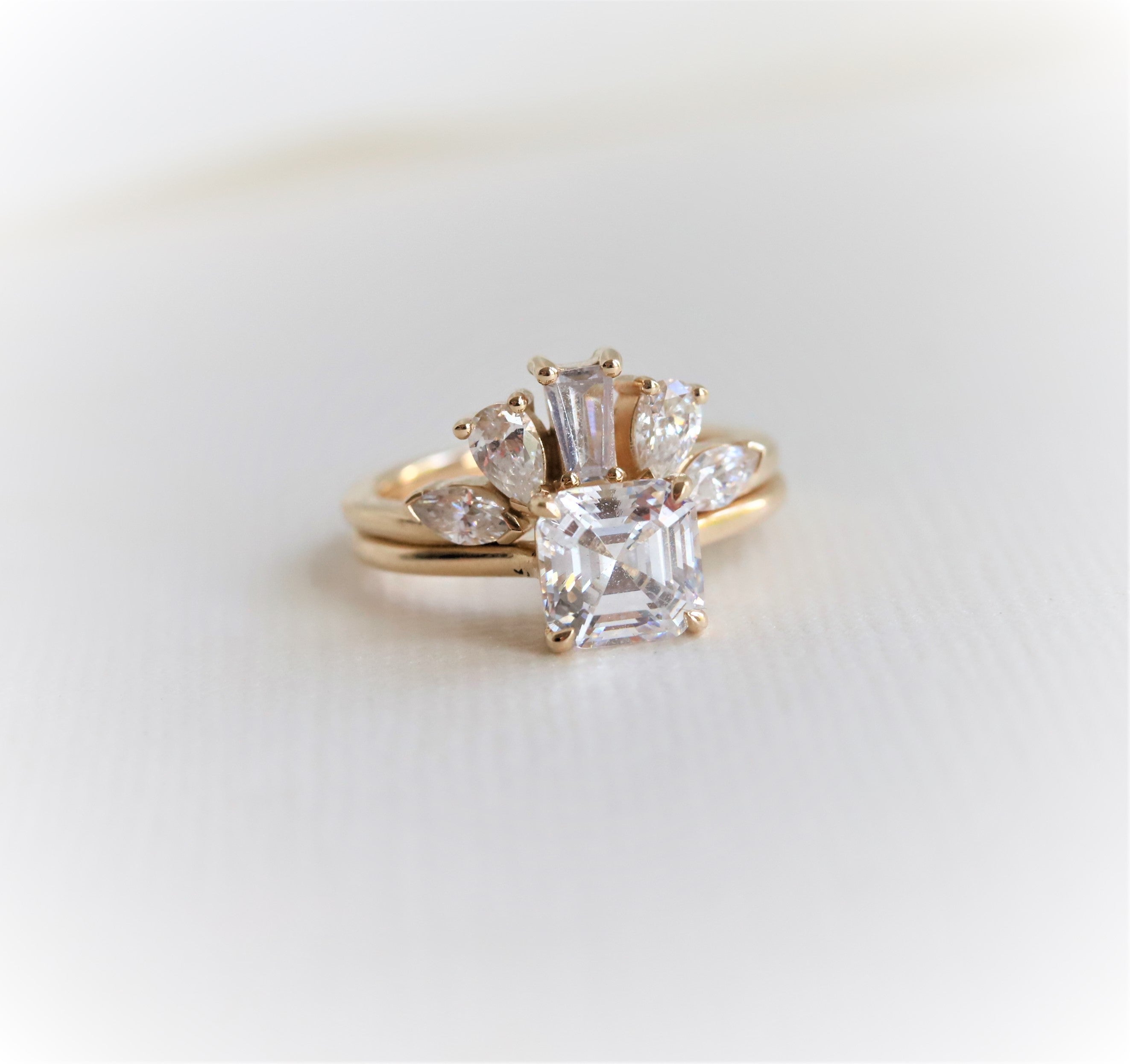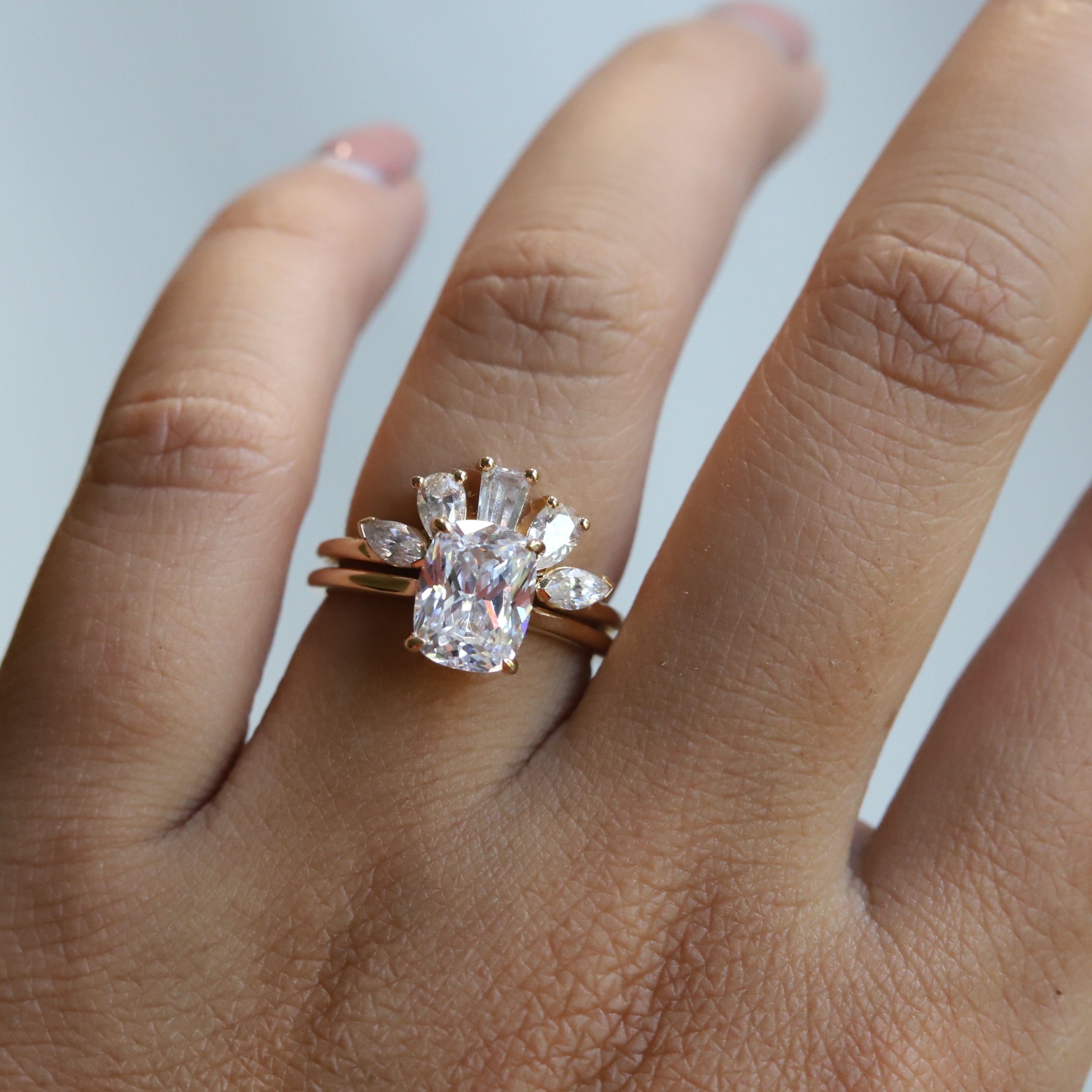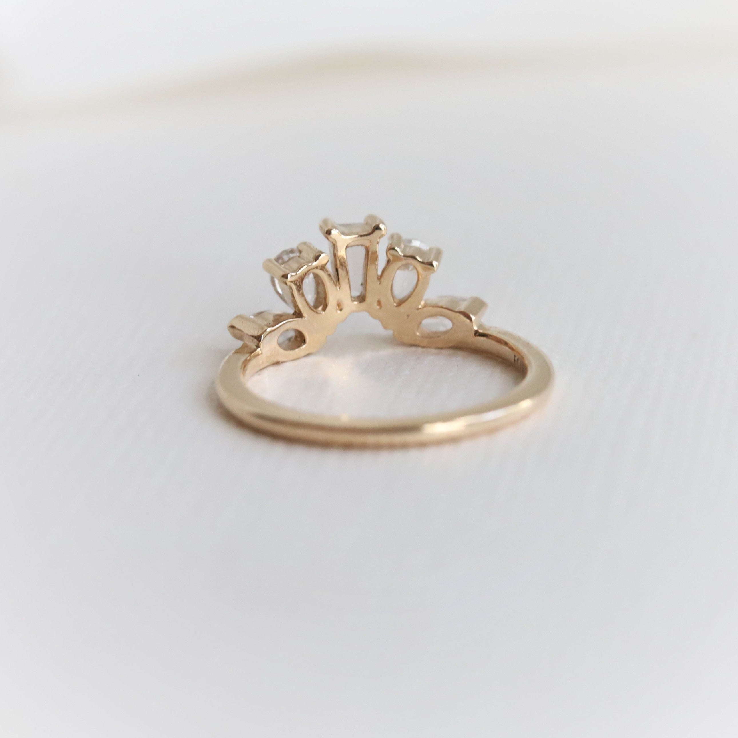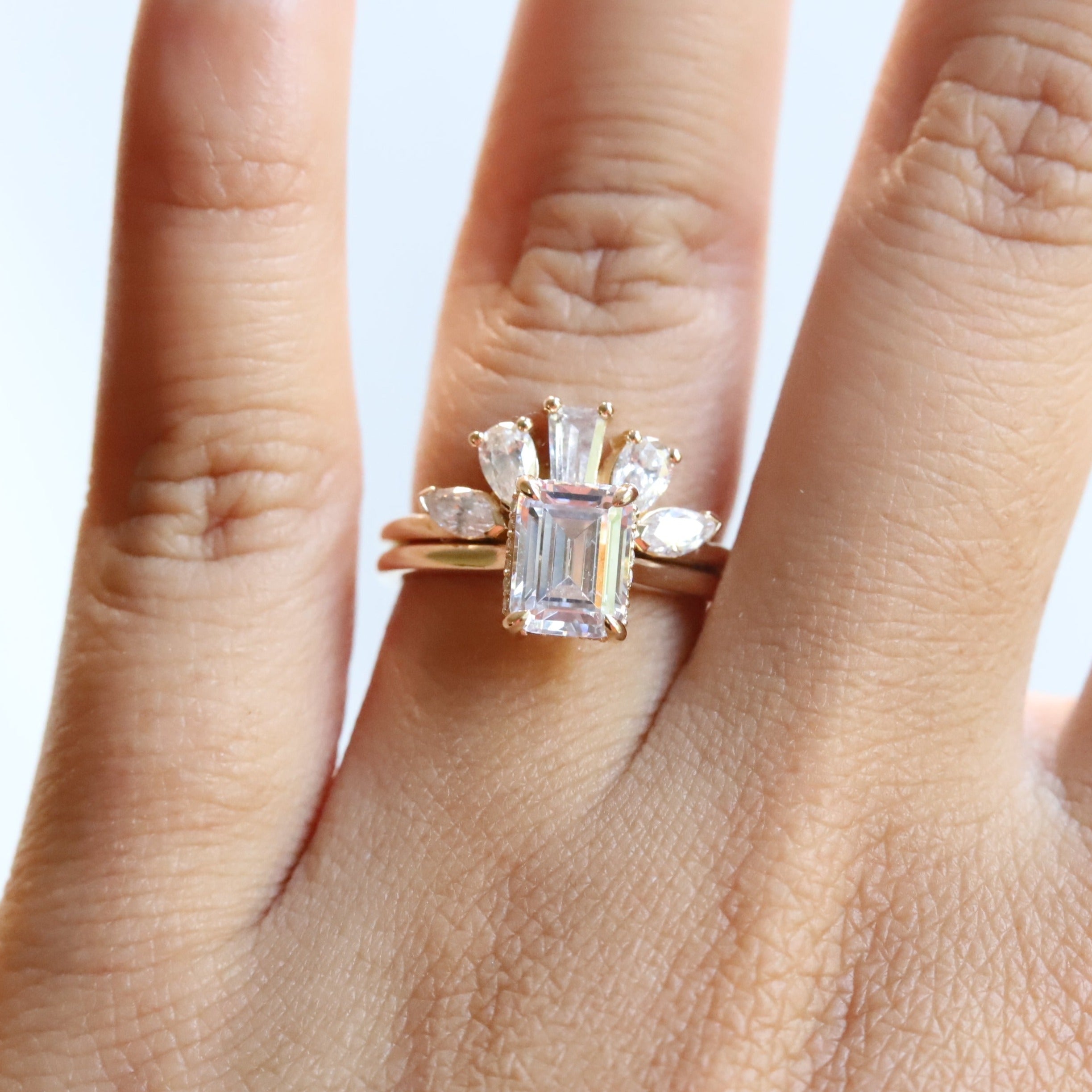 A statement contour band features pear, marquise, and tapered baguette shape stones. Pair it perfectly with a high-profile 1.5 ct+ engagement ring or our WYN Classic and Hidden Halo solitaire engagement rings.