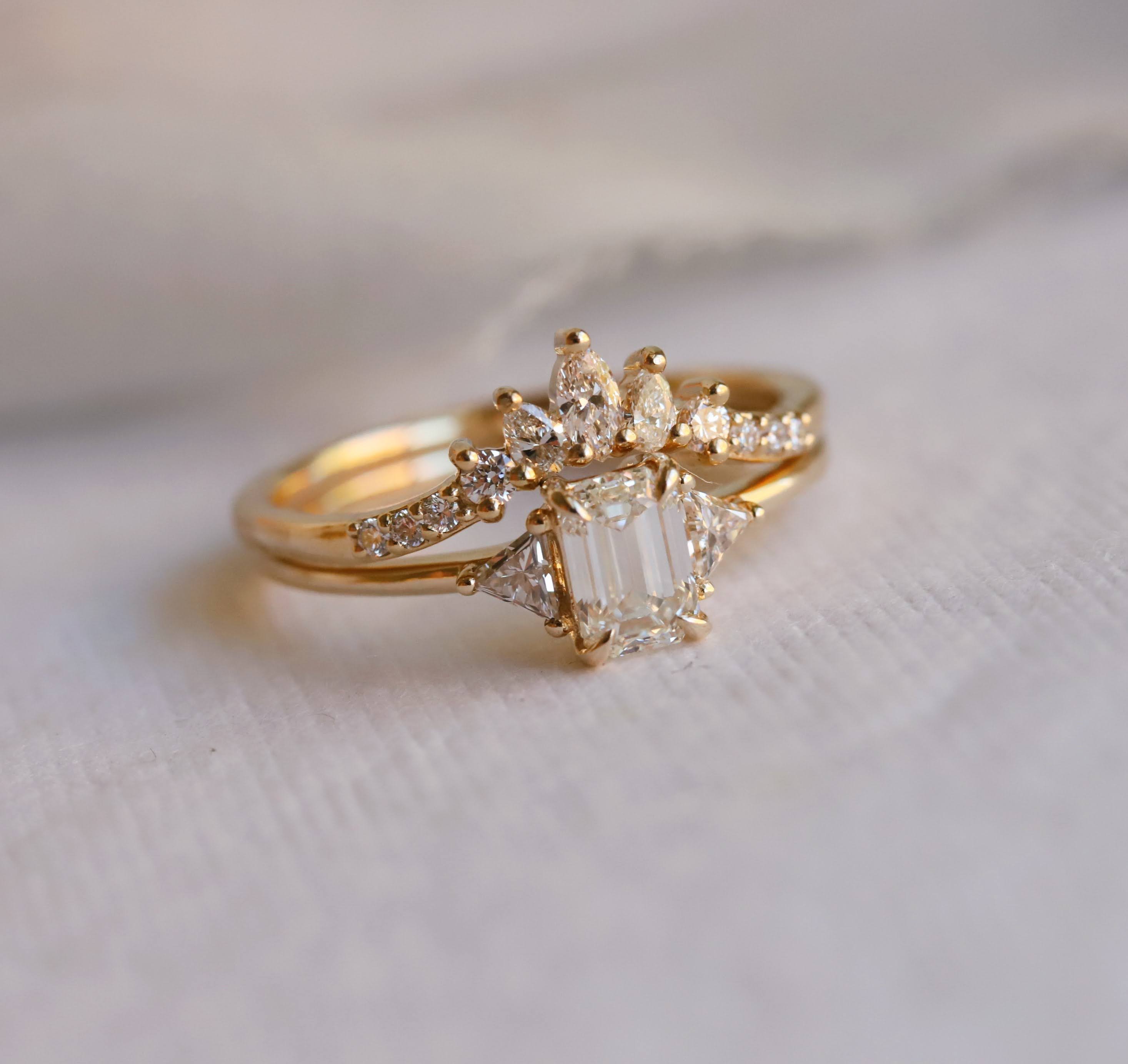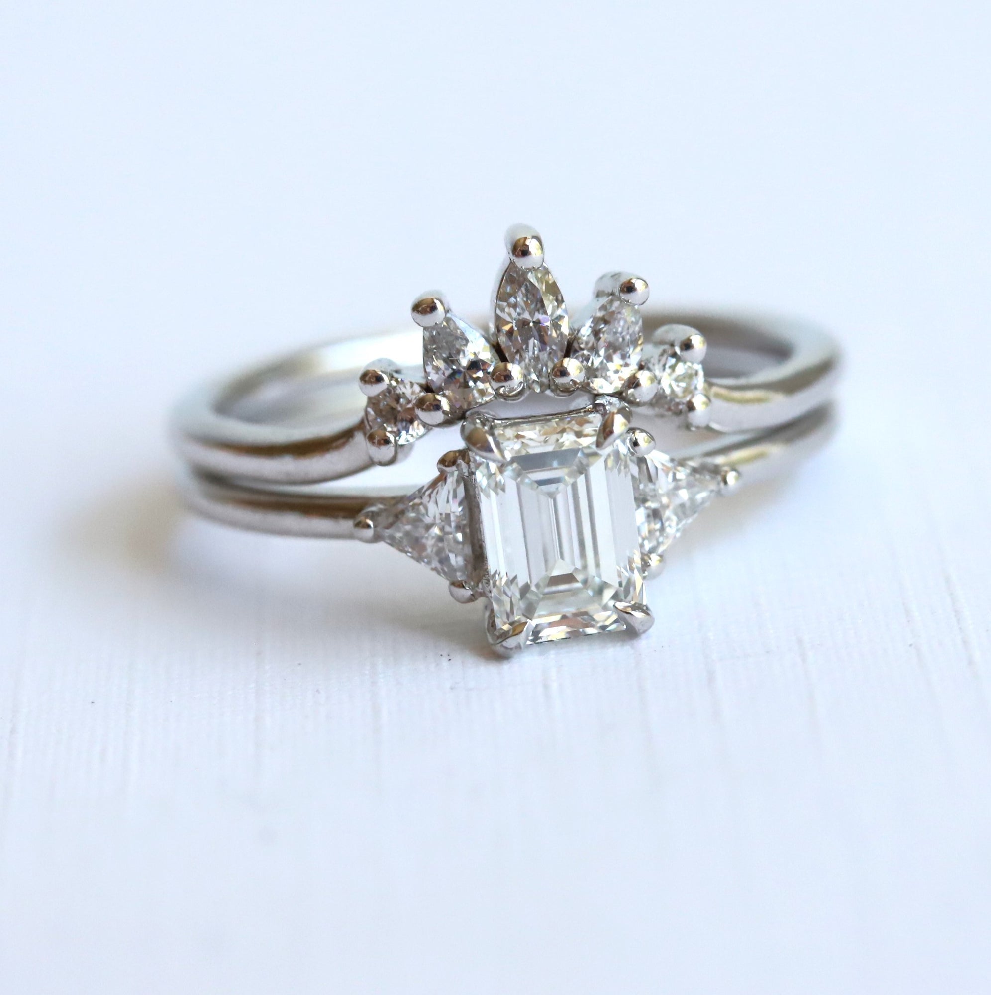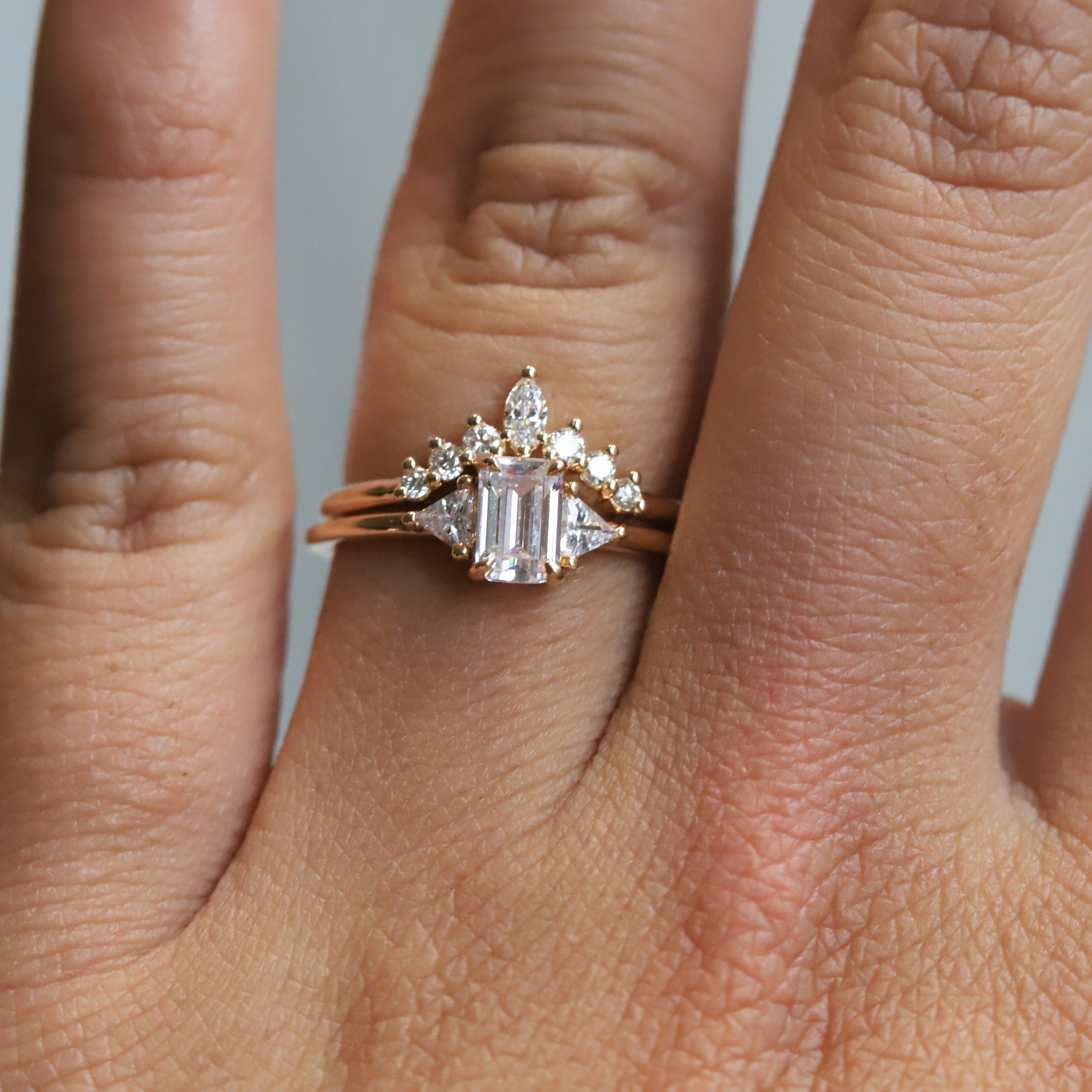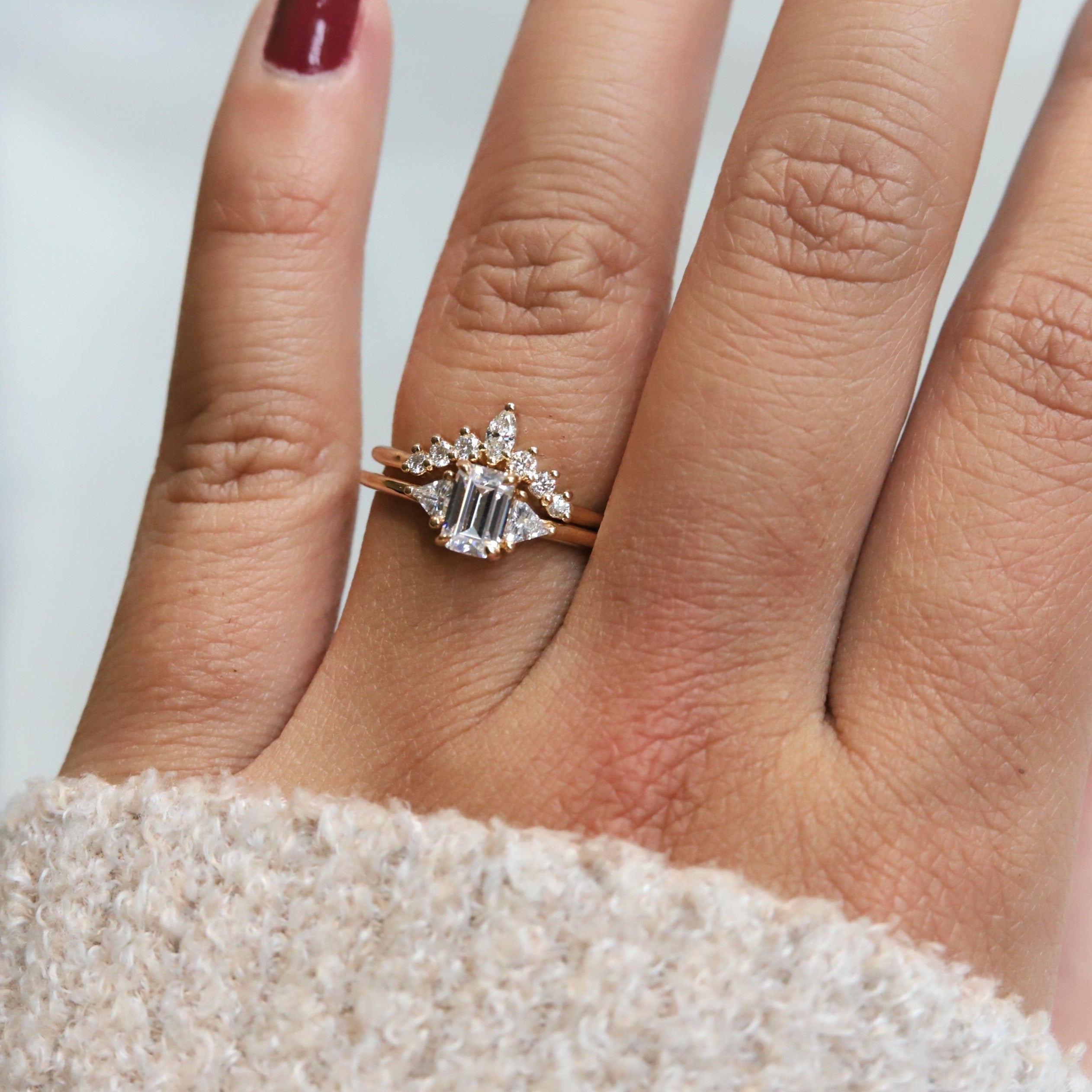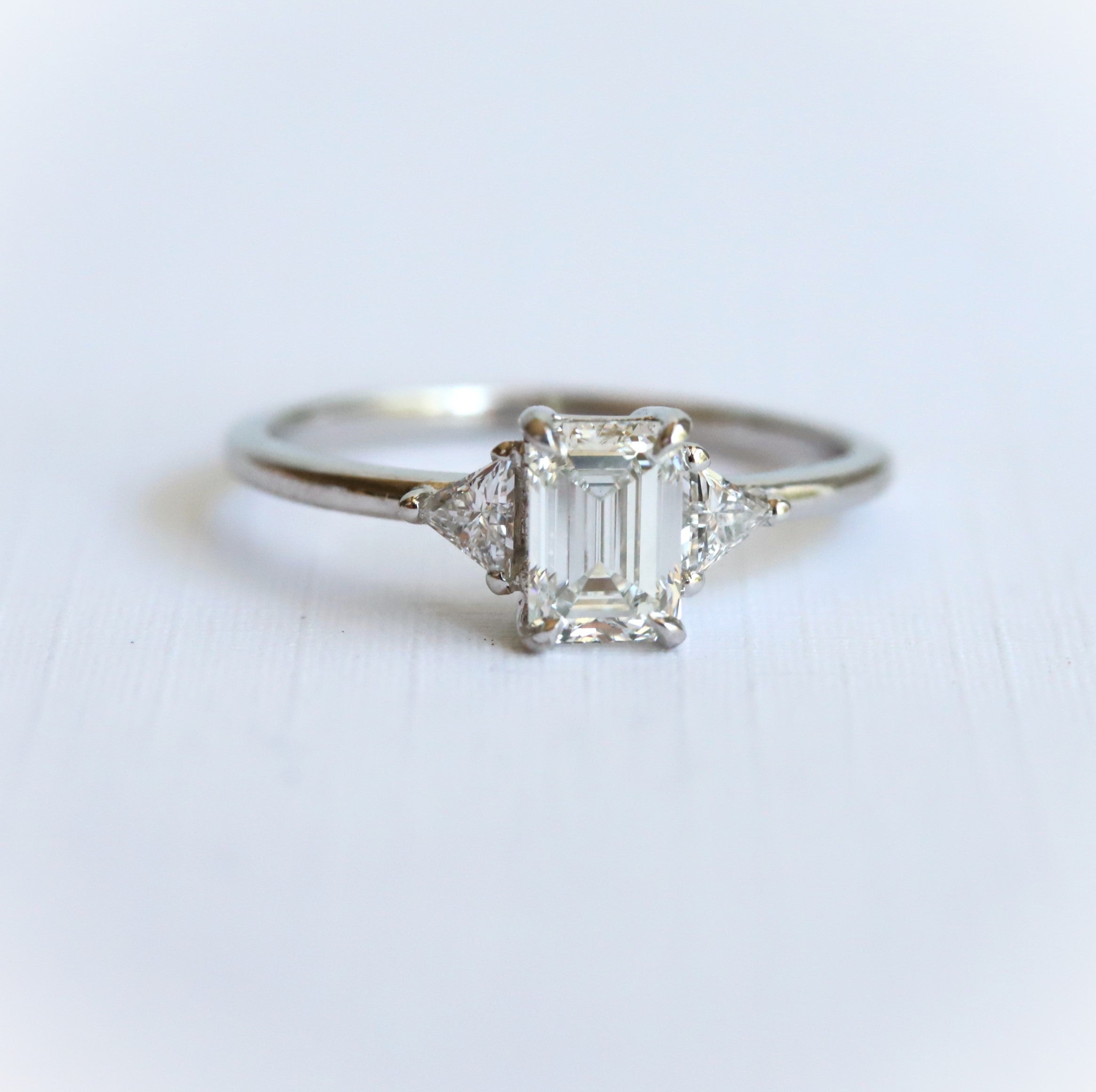 Classic simplicity defines this delicate setting. This design features a 0.7 ct: emerald-cut center diamond and a triangle-shaped diamond accent on each side of the center gem. Delicately designed with dainty details and shimmering diamonds, this timeless ring is the perfect choice for a stylish engagement. Let it adorn your hand with its captivating beauty.
