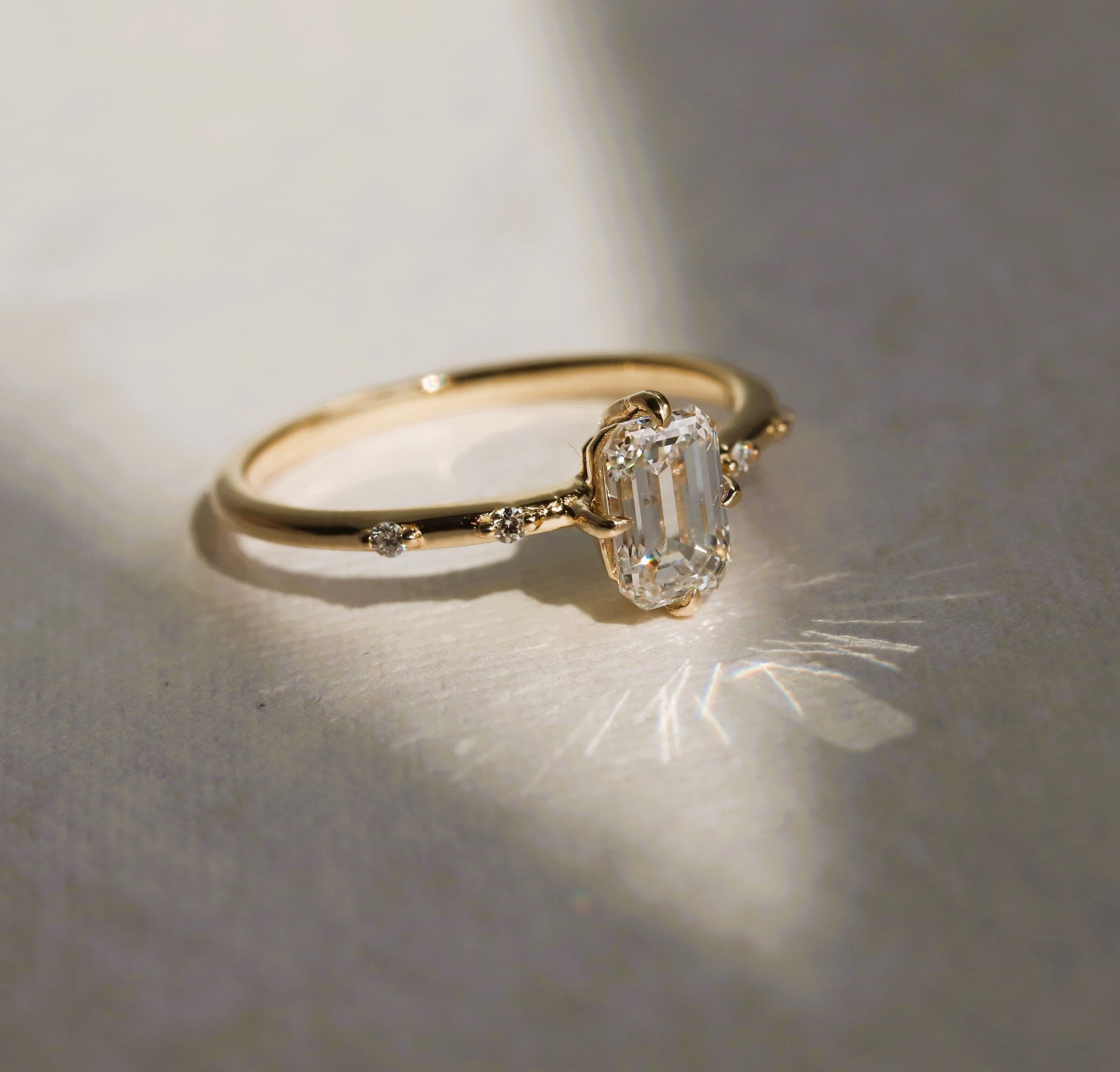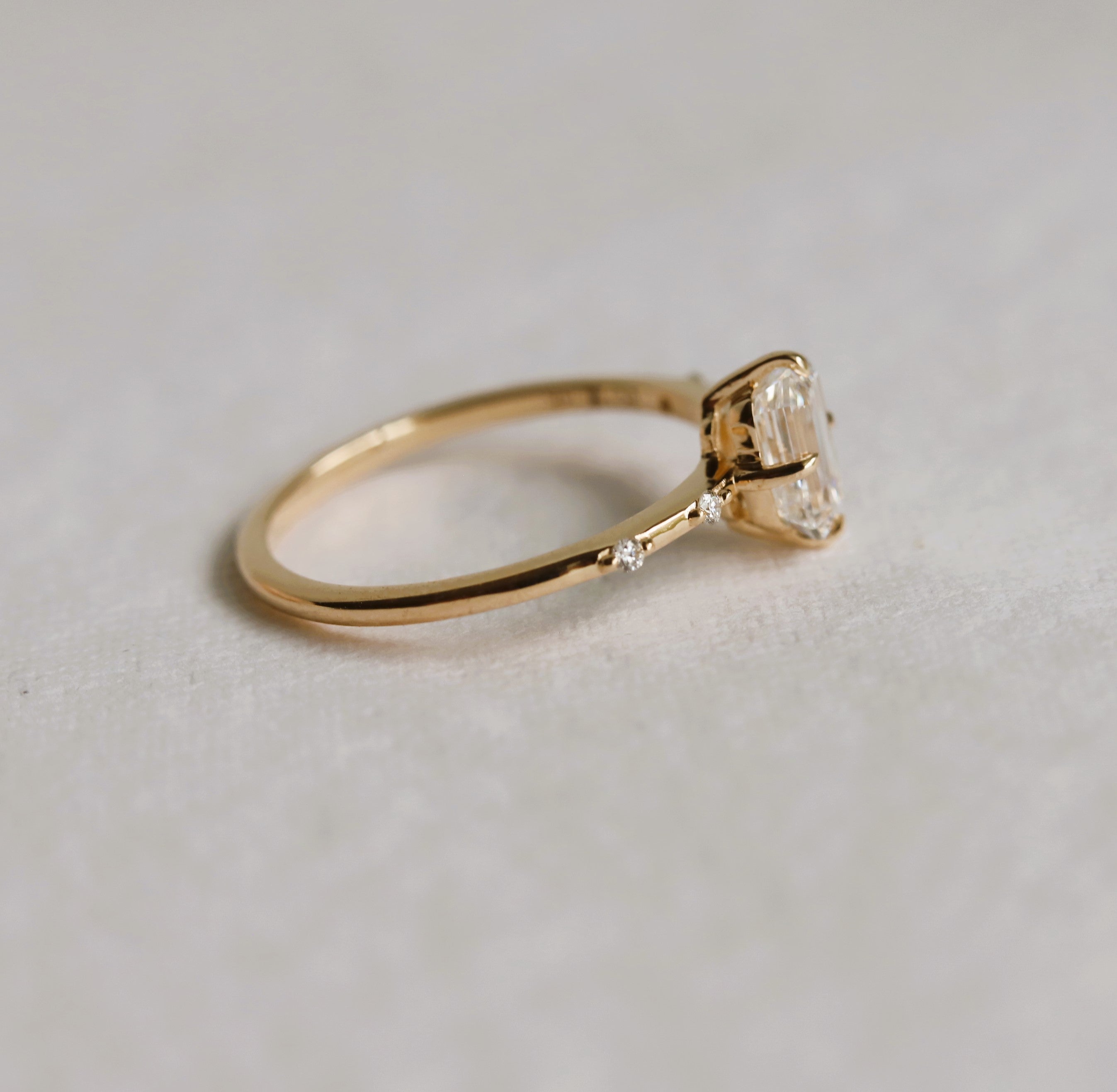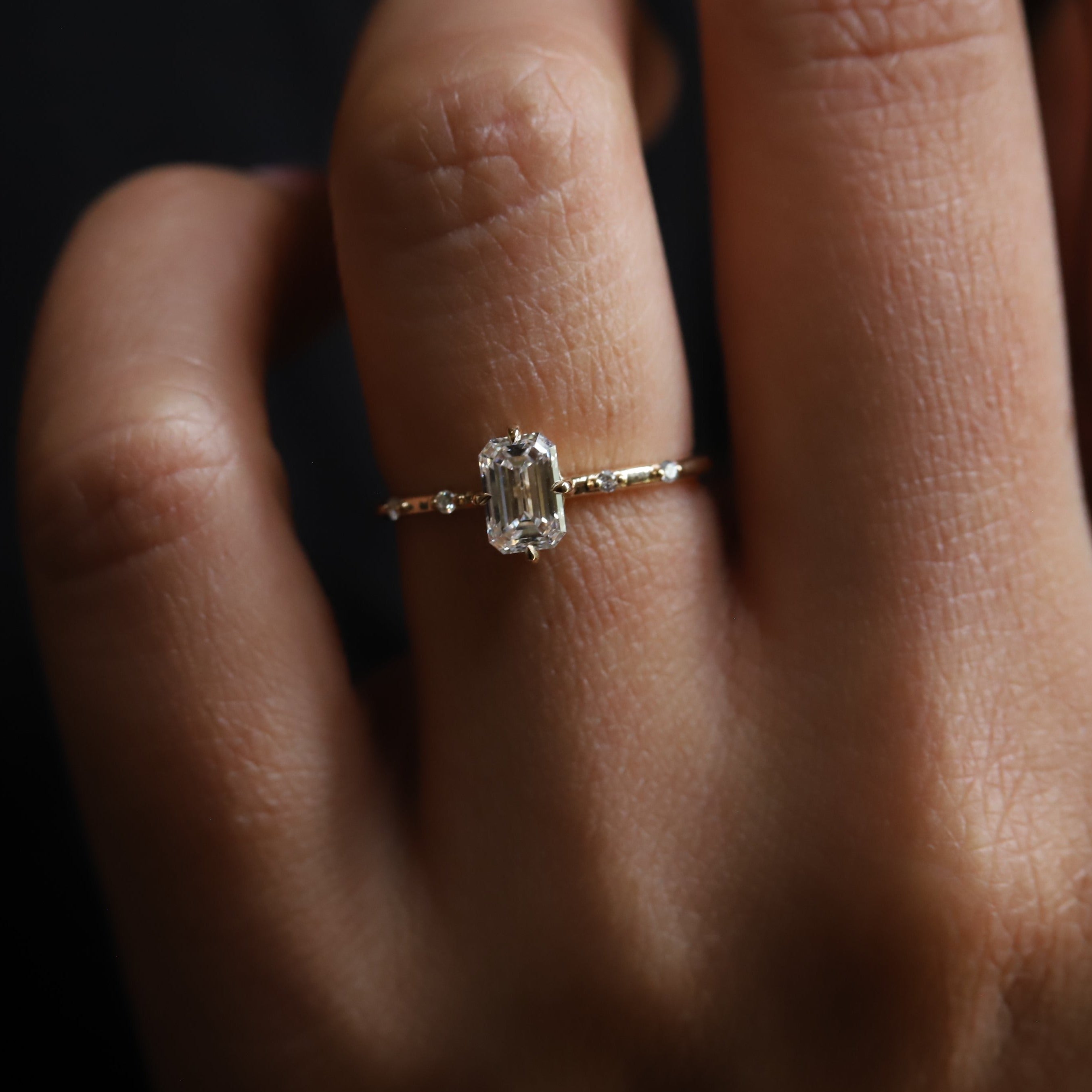 This elegant Aurora ring features a delicate, low-profile basket setting with distinctive north-south prongs and a timeless, subtle design. The 0.65-0.7 ct. emerald cut center stone allows you to choose between a Natural Diamond, Lab-Grown Diamond, or Moissanite, and is complemented by two diamond accents on each side of the band. A perfect choice for engagement rings, this piece appeals to those seeking a minimalist bridal style.
