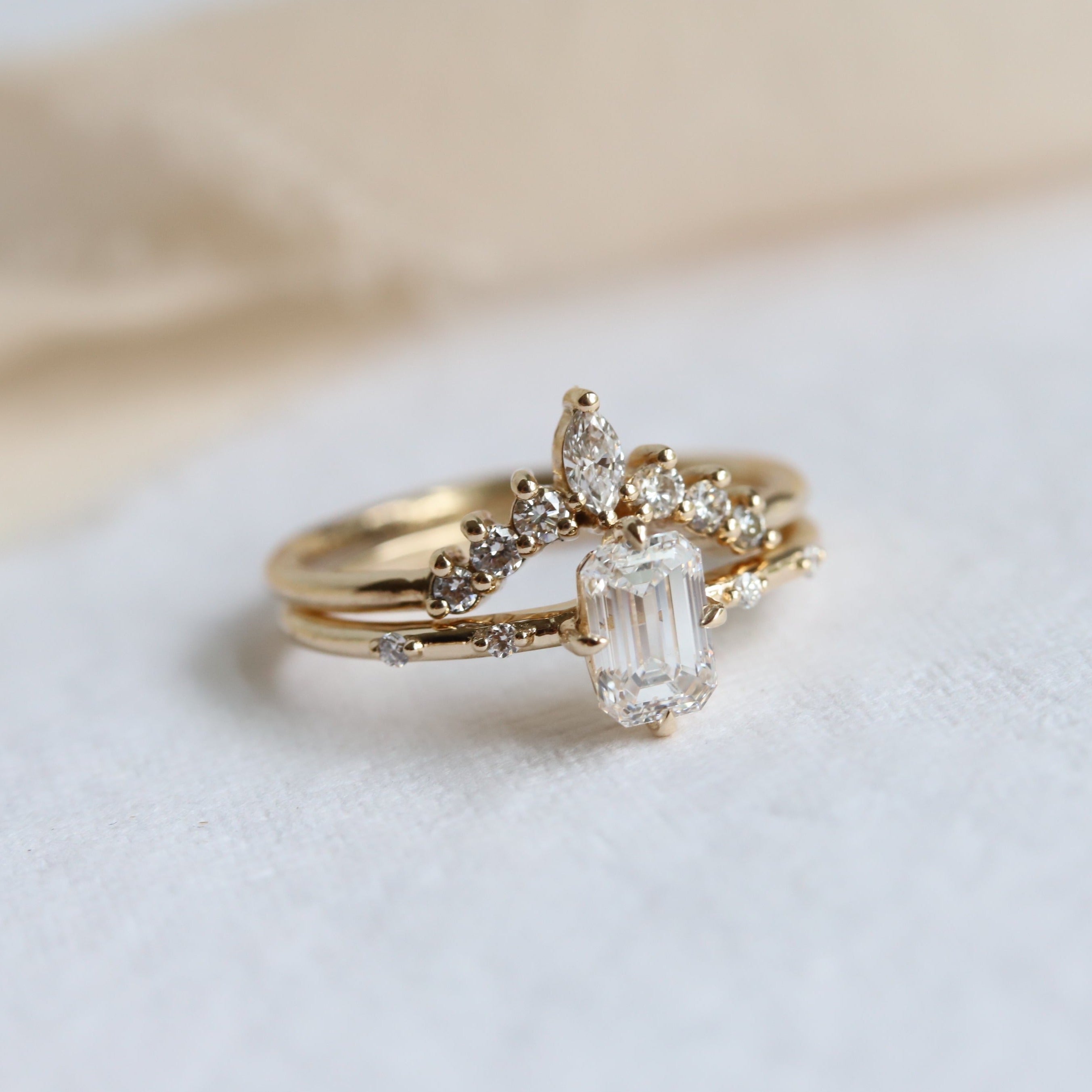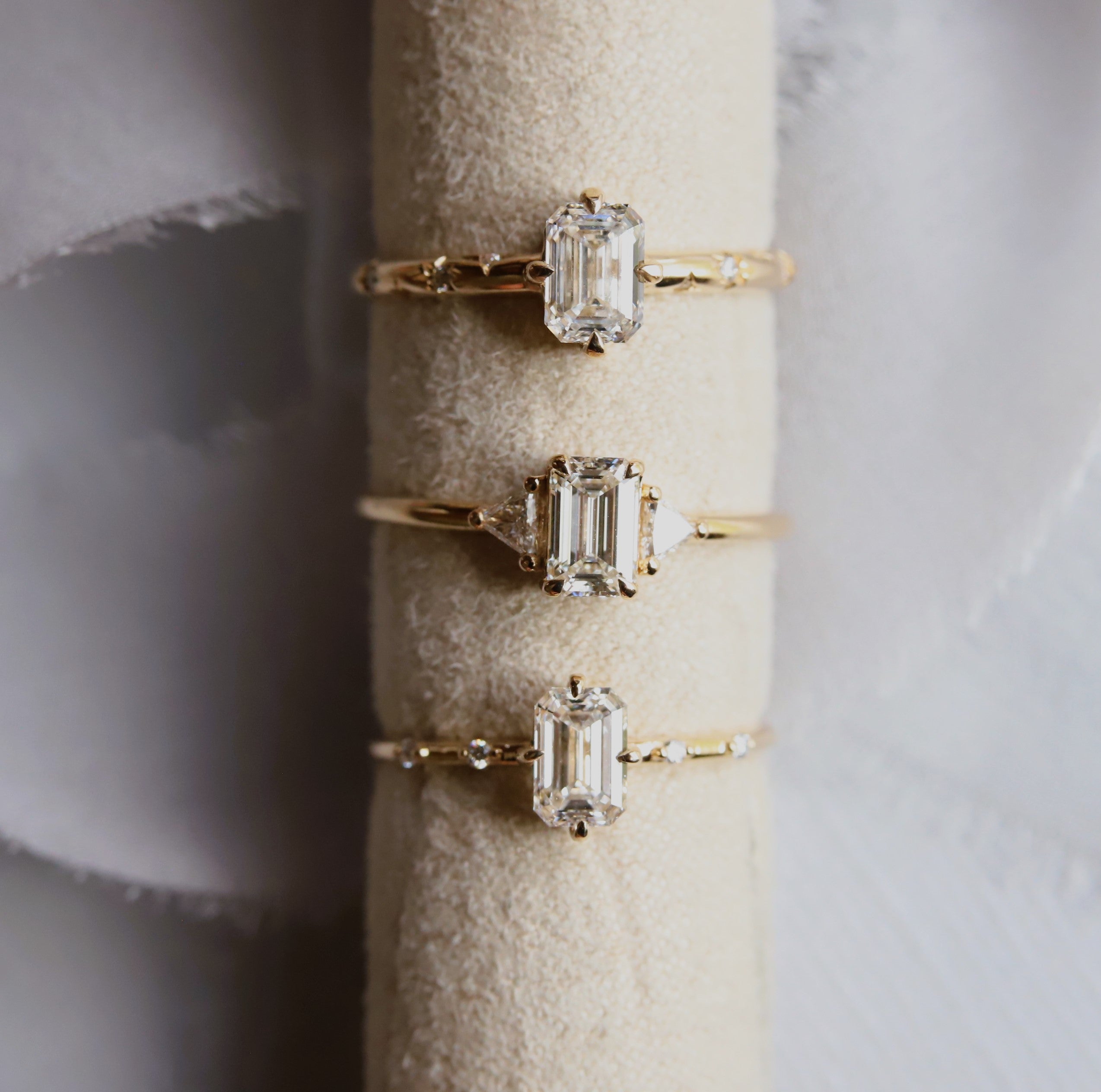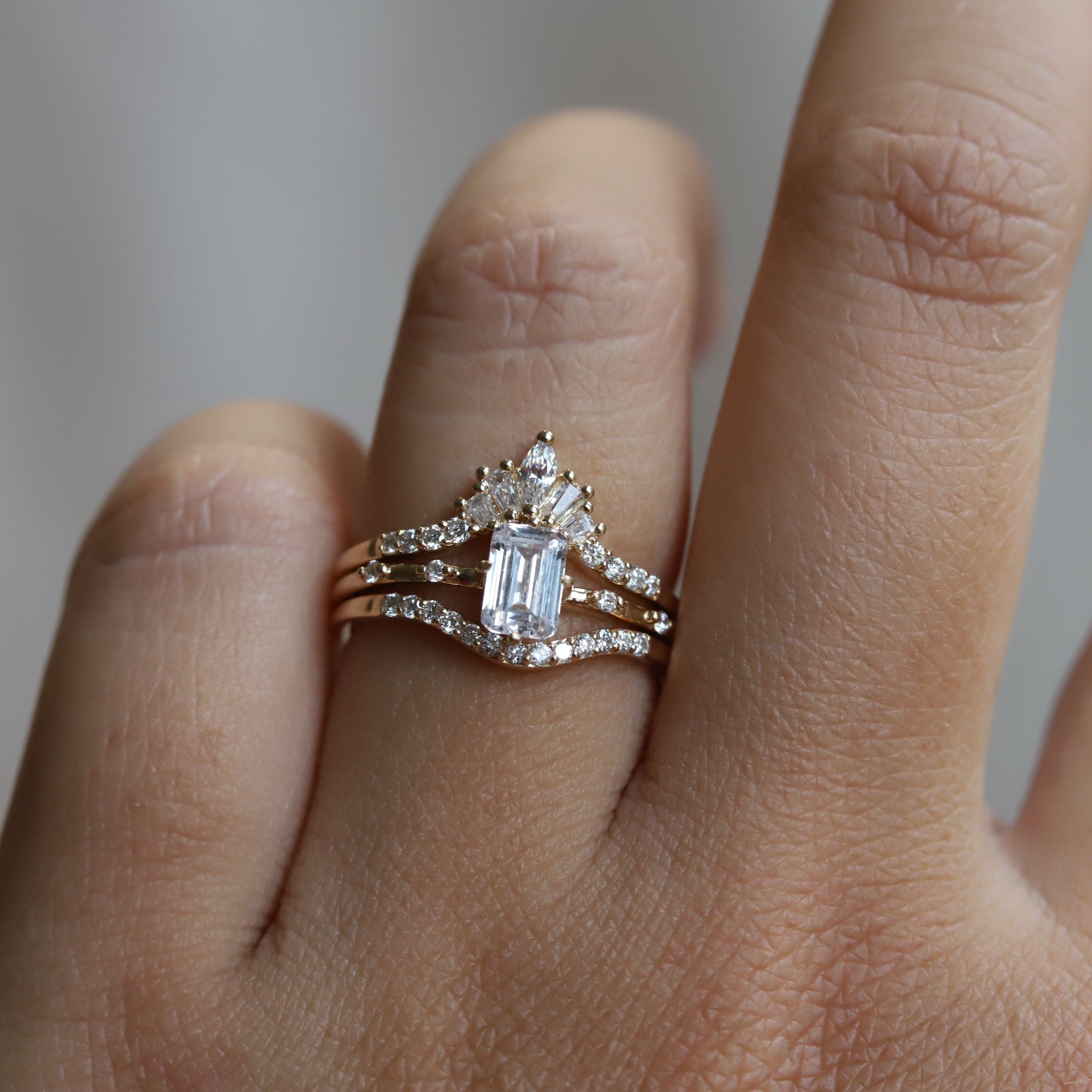 This elegant Aurora ring features a delicate, low-profile basket setting with distinctive north-south prongs and a timeless, subtle design. The 0.65-0.7 ct. emerald cut center stone allows you to choose between a Natural Diamond, Lab-Grown Diamond, or Moissanite, and is complemented by two diamond accents on each side of the band. A perfect choice for engagement rings, this piece appeals to those seeking a minimalist bridal style.
