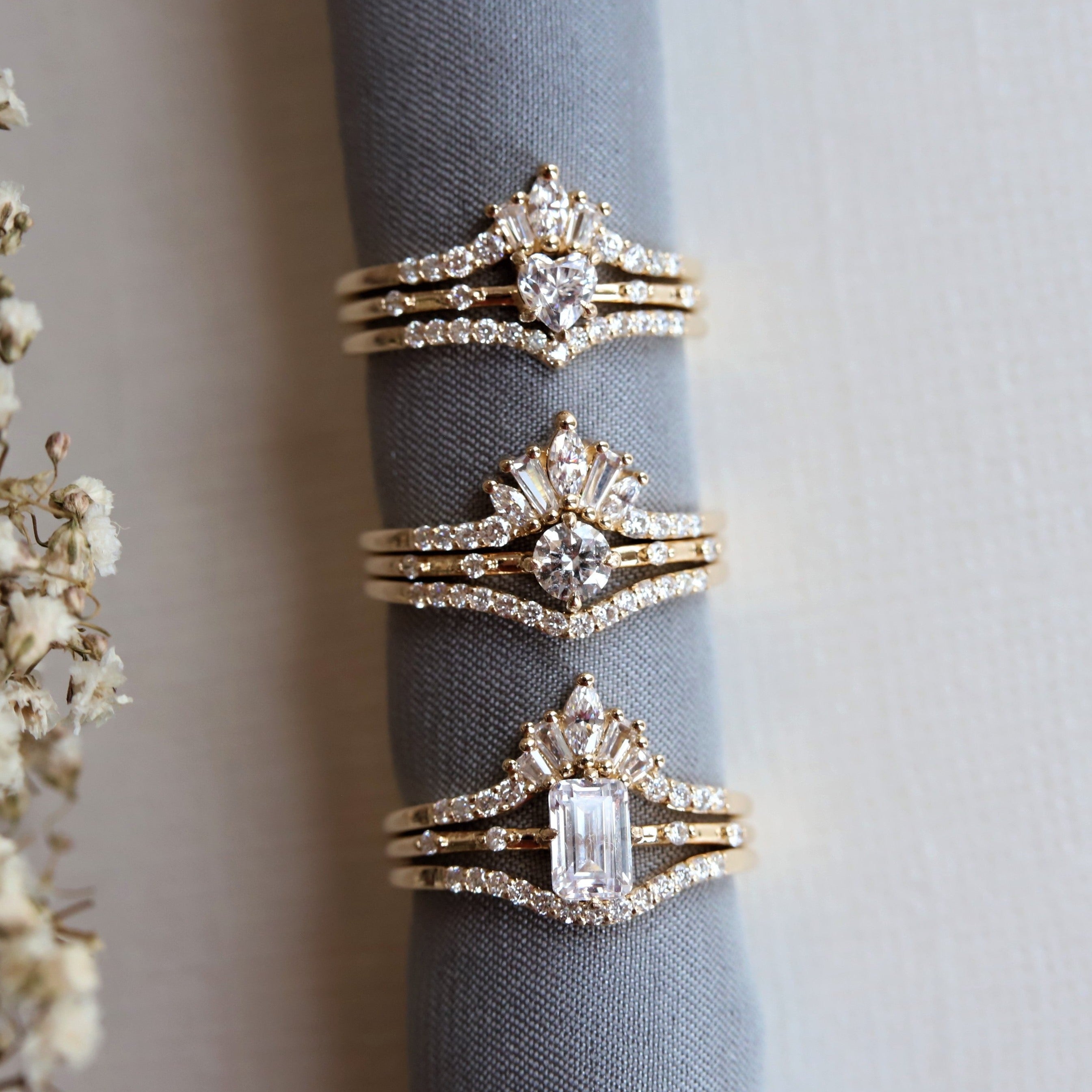 • Moissanite: A lab-created gemstone with high sparkle and durability, featuring a different sparkle pattern than diamonds with more rainbow fire, and a more gemstone-like appearance