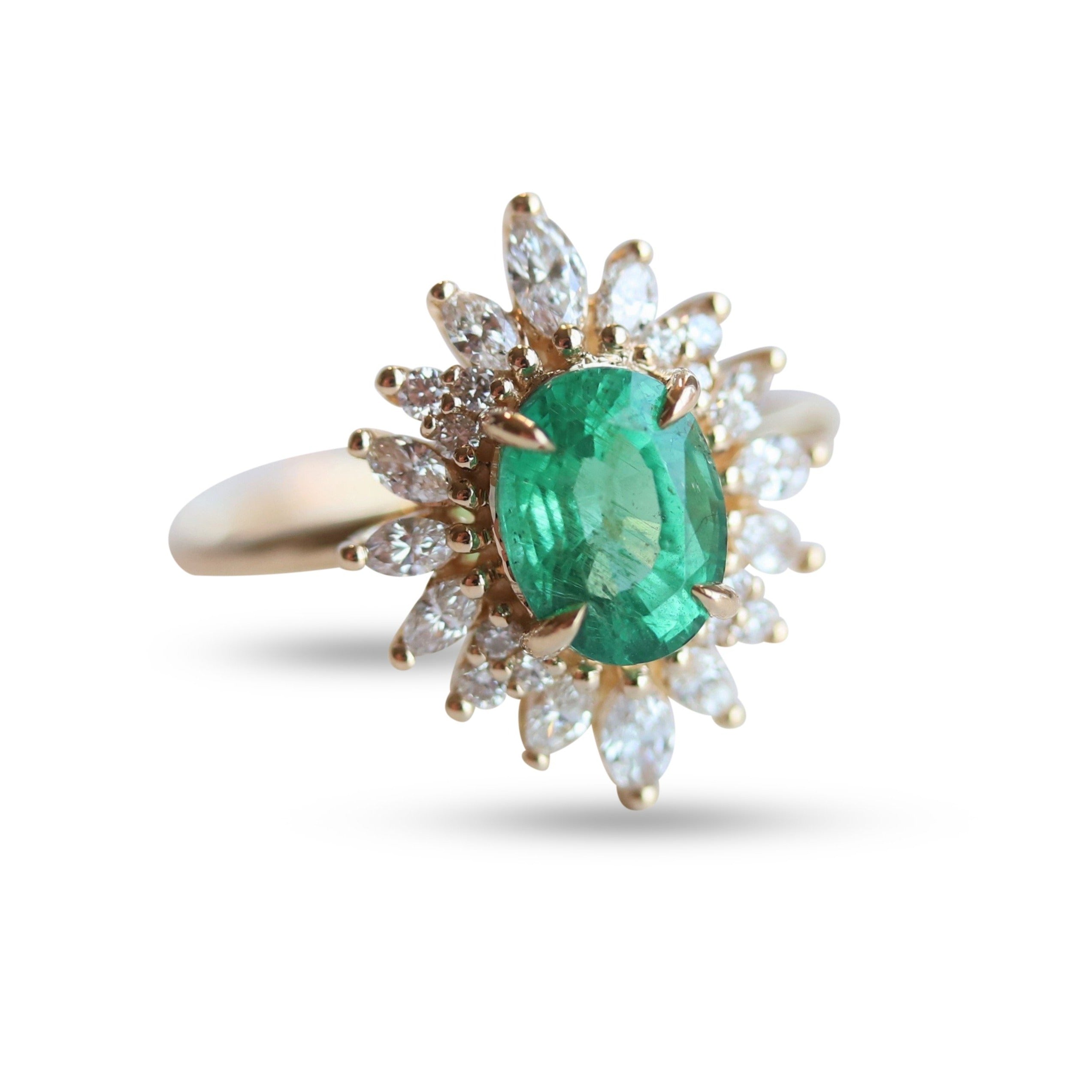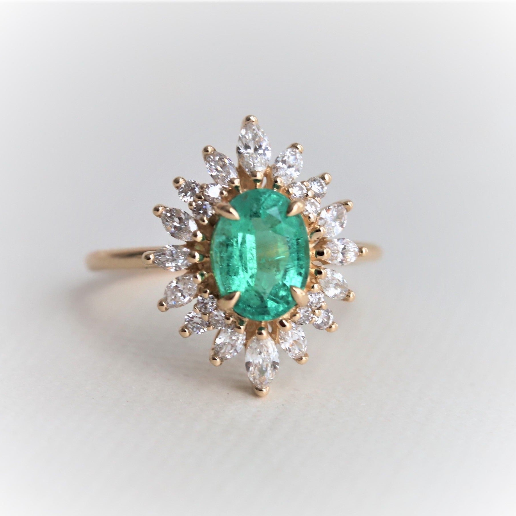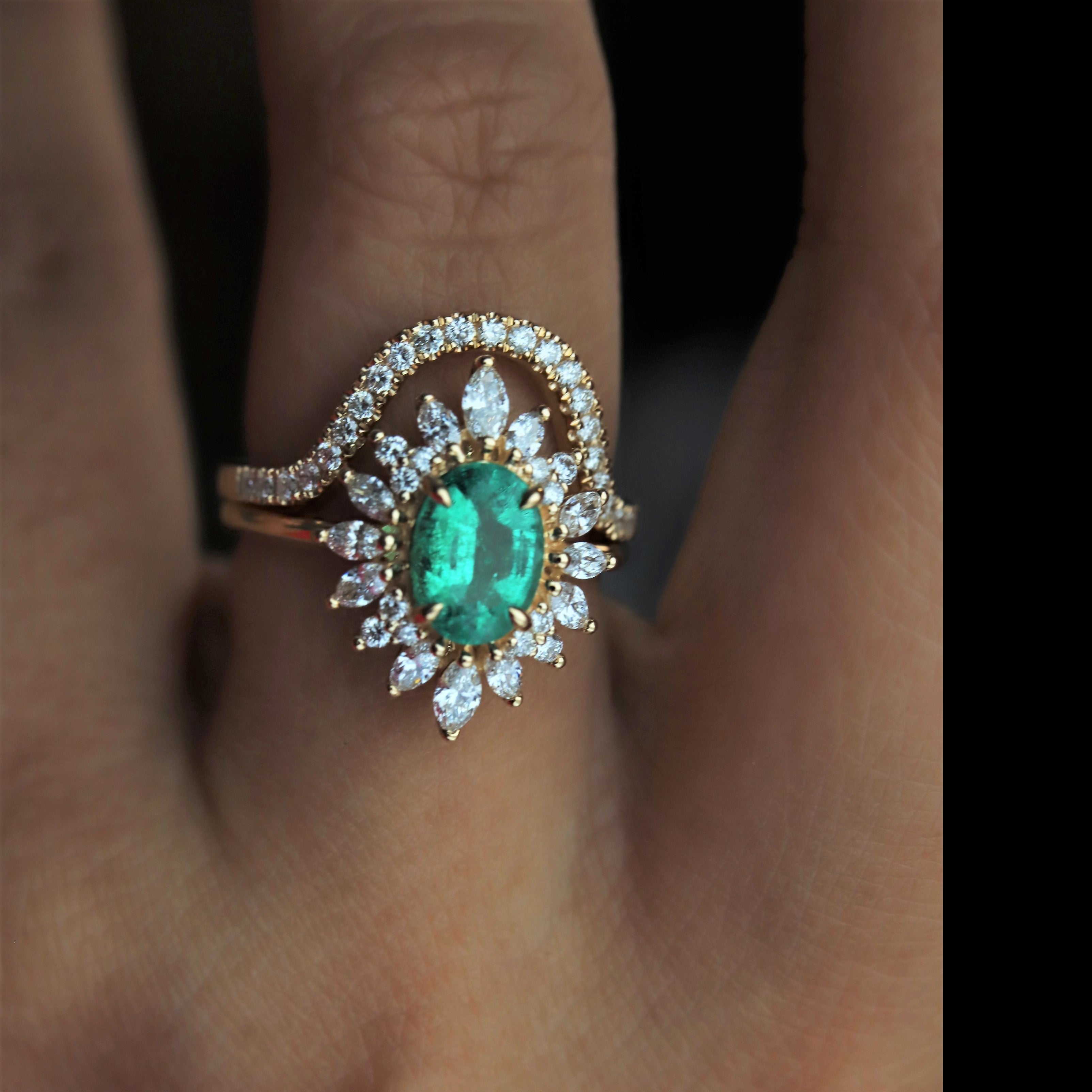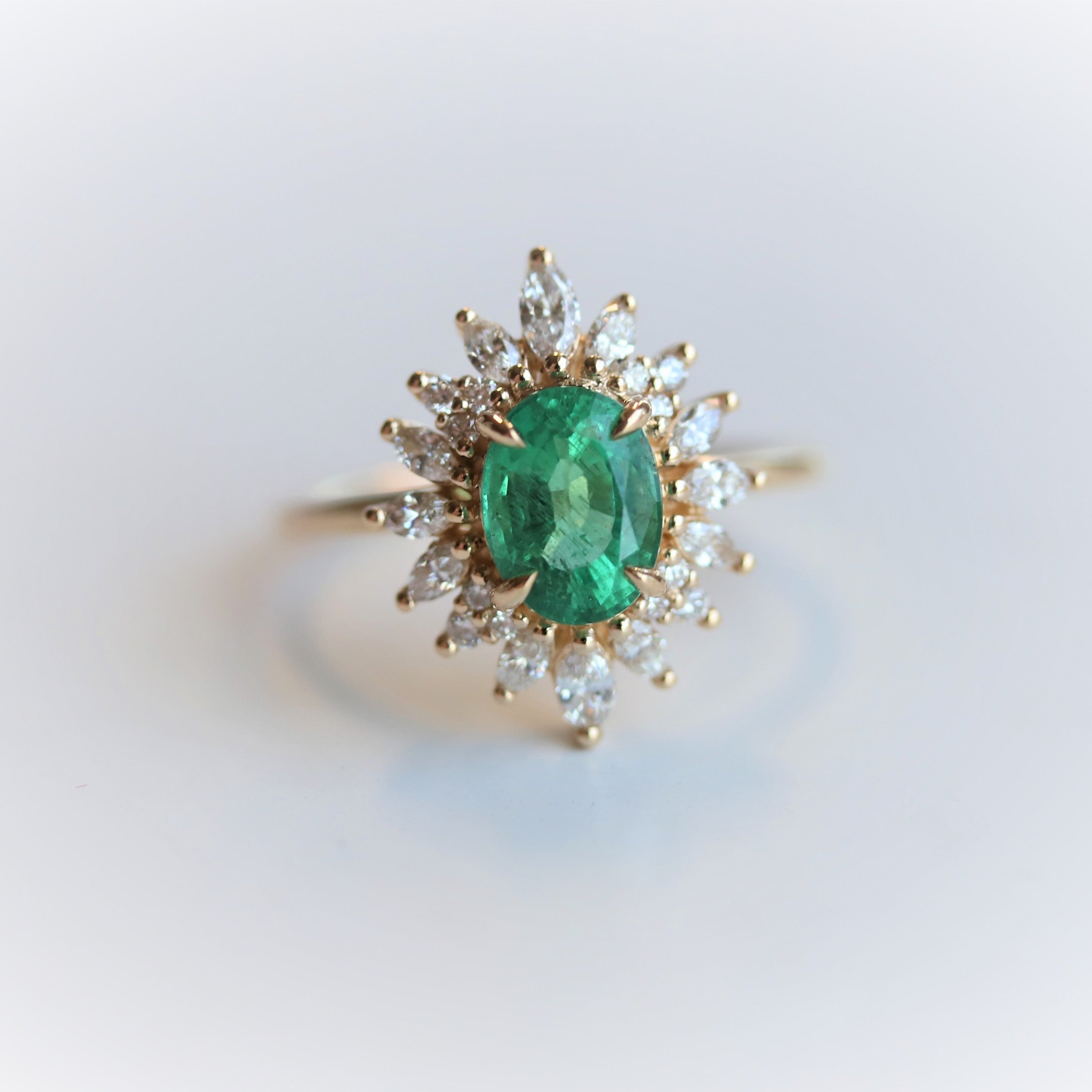 A beautiful natural Zambian Emerald surrounded by a halo of sparkling ✨ marquise & round diamonds.