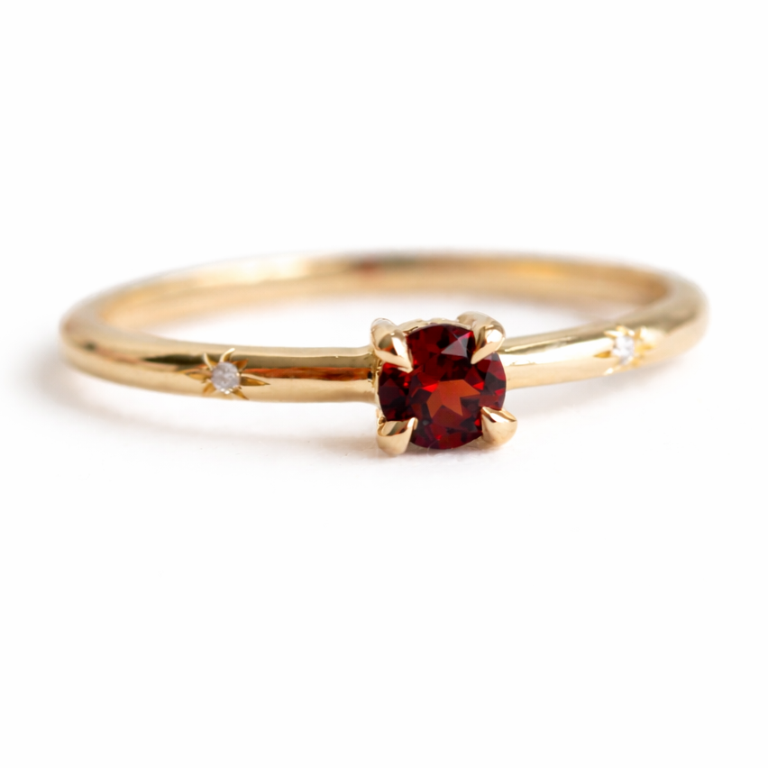 Updated and sparkling like the stars it’s named after, the new Stella ring features a round-cut birthstone of your choice held in place with four claw prongs. Two Diamonds adorn the band at the center of delicate star engravings, including a hidden star and diamond on the side of the setting. Choose your metal type to make the ring fit your style perfectly.